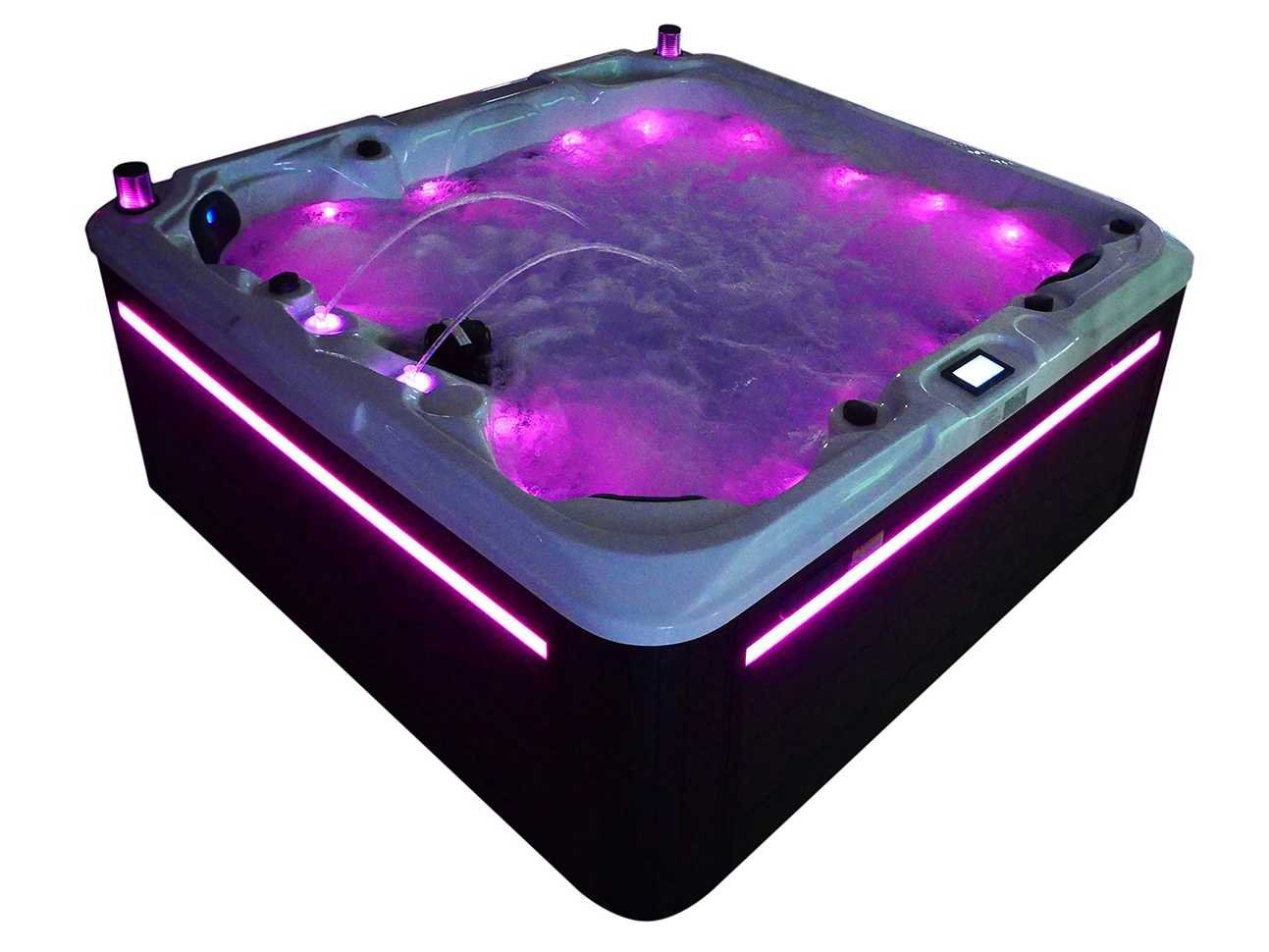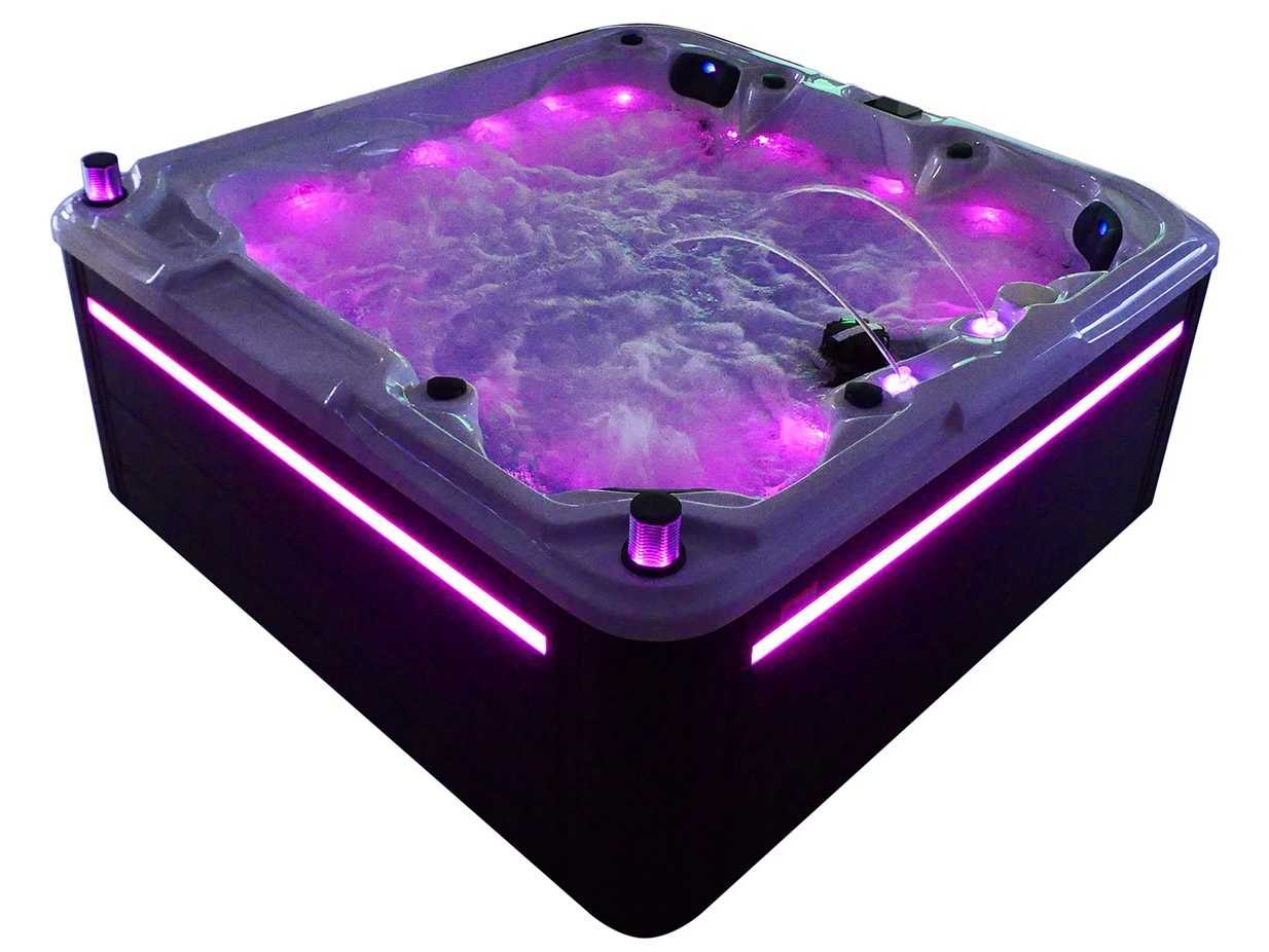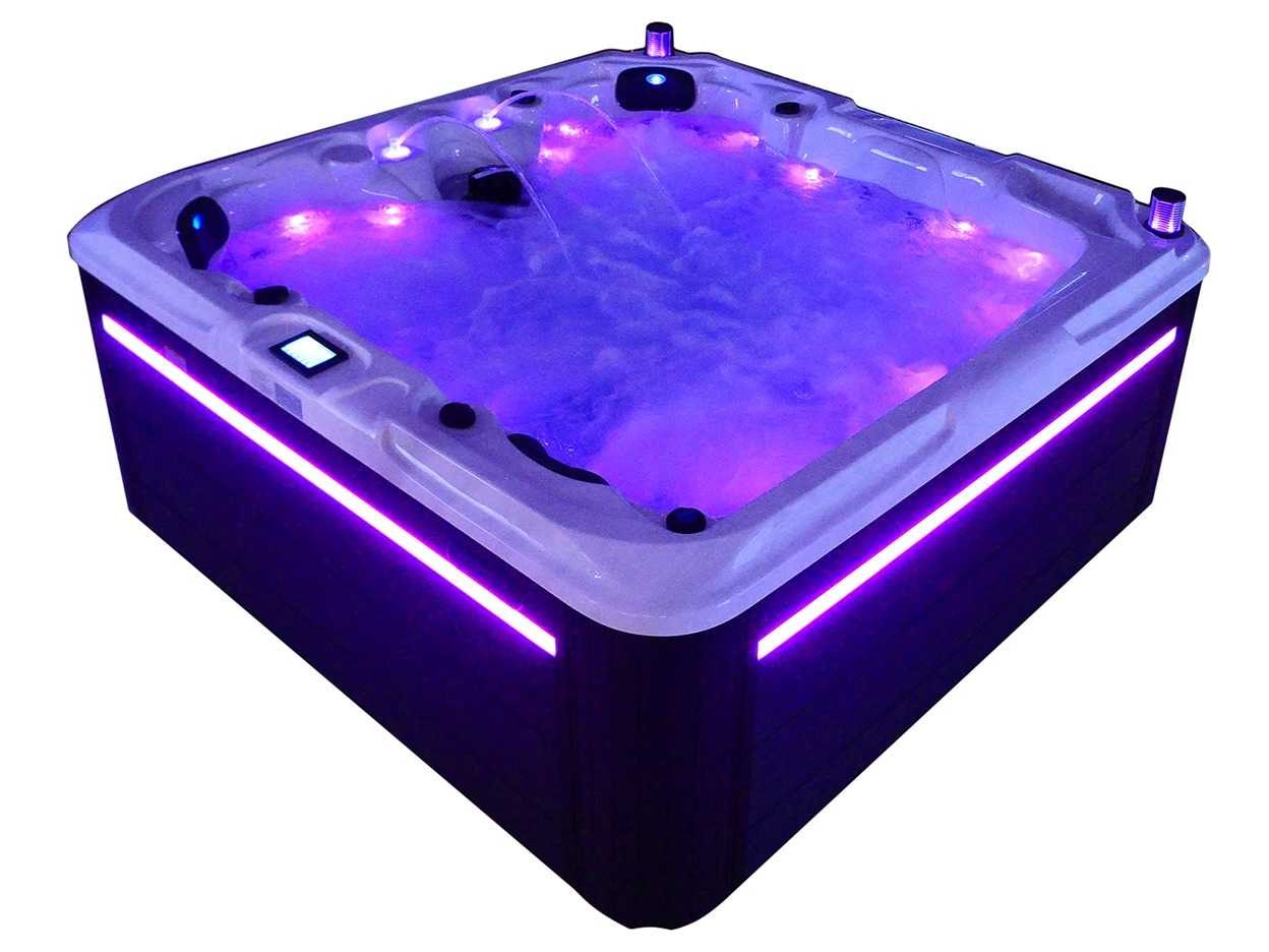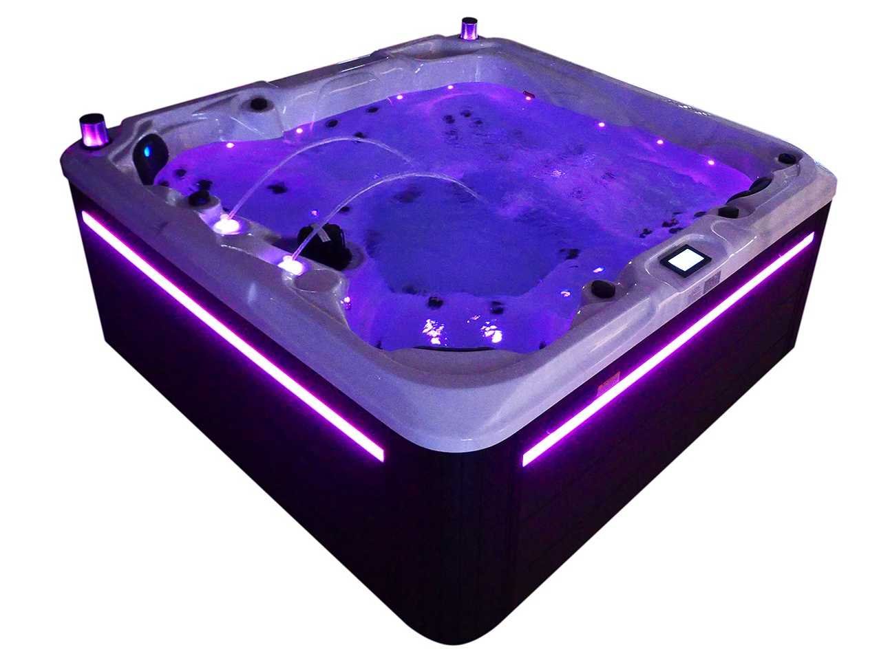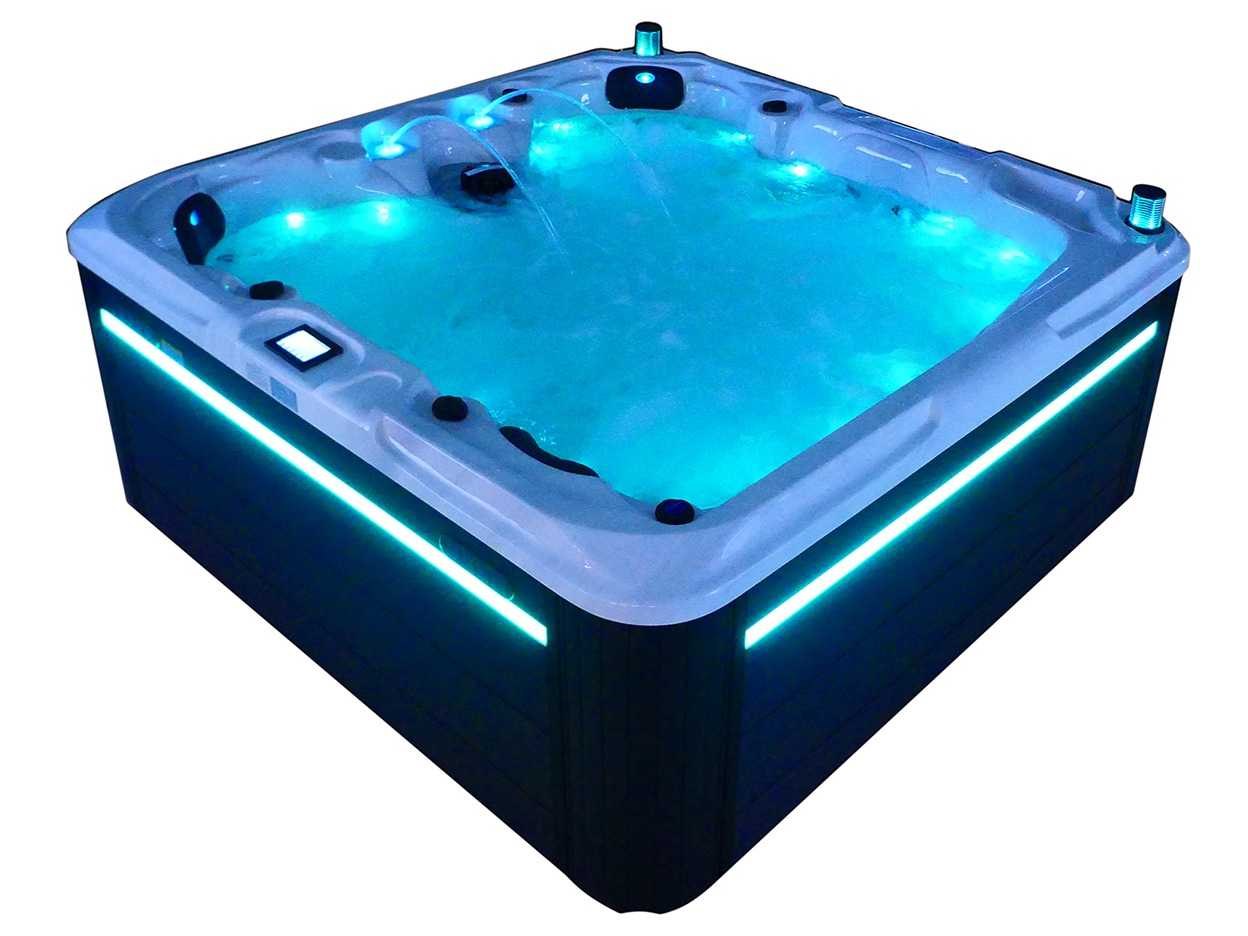 Besturing balboa (Balboa BP21 computer + nieuwste Spa touch 3 display), Balboa heater (3000 watt), Balboa wifi (voor besturing op afstand met de telefoon/tablet), Balboa bluetooth audio, 2 popup speakers met ledverlichting, Subwoofer, kunststof onderhoudsvrije ombouw met ledverlichting rondom in de zijpanelen, 4 massage pompen (1* 2,5pk, 2* 2pk en 1* 400 watt luchtpomp), 24h circulatiepomp (0,5pk), 4 zitplaatsen en 1 ligplaats (3 plaatsen voorzien van hoofdkussen), dikke (zwarte) afdek cover inclusief, totaal 83 rvs stainless steel RVS jets waarvan 14 luchtjets met ledverlichting (diverse maten en verschillende hydro stralen), extra nek en voet massage jets, vorst beveiliging, ozone desinfectie systeem 50mg/h, diverse leds (36 stuks) verlichting langs de waterrand, aroma feeder, 2x pop-up water fontein met ledverlichting, 1x grote waterval met ledverlichting, diverse regelknoppen om de de kracht en de verdeling naar de jets te regelen, 1x oppervlakte en reinigingsfilter, kuip extra dikke foam isolatie (minimaal 45mm) + extra isolatie aan de buitenwanden met folie + 5mm dikke isolatie op de PVC gesloten bdem, waterafvoer, inclusief trapje, Aluminium frame (zeer sterk en roest bestendig) deze spa zit vol met alle mogelijk bestelbare opties, dit betreft een nieuw product in verpakking. De spa kan zowel op 220volt als 380volt worden aangesloten (27a of 41a). Merk: Mawialux Model: Mia Vermogen: 8500W Spanning: 220-380V Filters: 1 Verlichting: diverse leds met kleurentherapie (7 kleuren) op waterniveau Inhoud: 1500l Pompen: 5 Jets: 83 Aantal personen: 5 Kleur: Binnenkuip keuze uit 3 kleuren (H03 zwart, of H06 wit of H12 grijs) met donker zwarte ombouw (kleurkeuze graag doorgeven per email op info@mawialux.nl) Gewicht: 420kg Lengte: 220cm Breedte: 220cm Hoogte: 95cm Materiaal: USA Aristech acryl + Aluminium frame + kunststof ombouw + PVC gesloten bodem