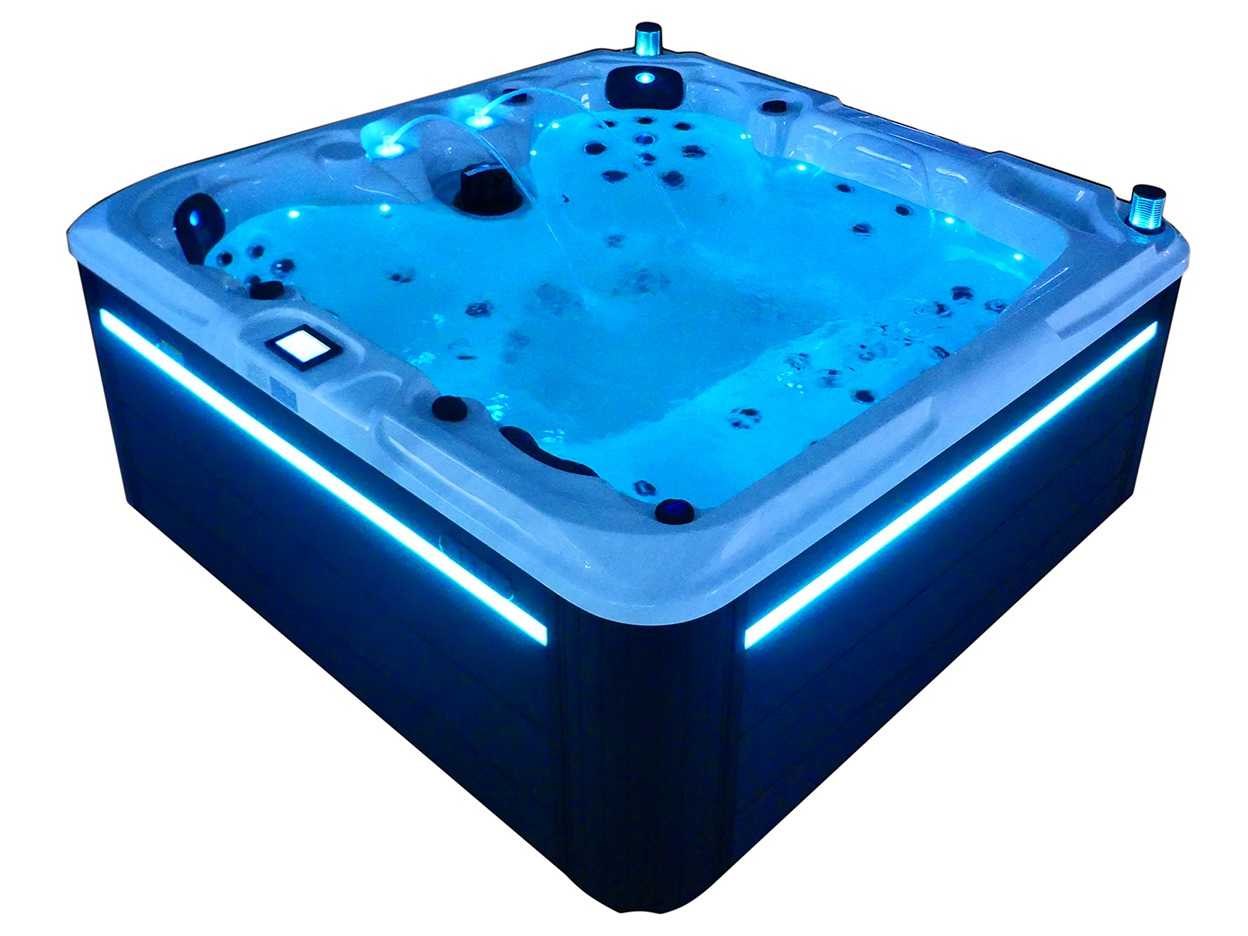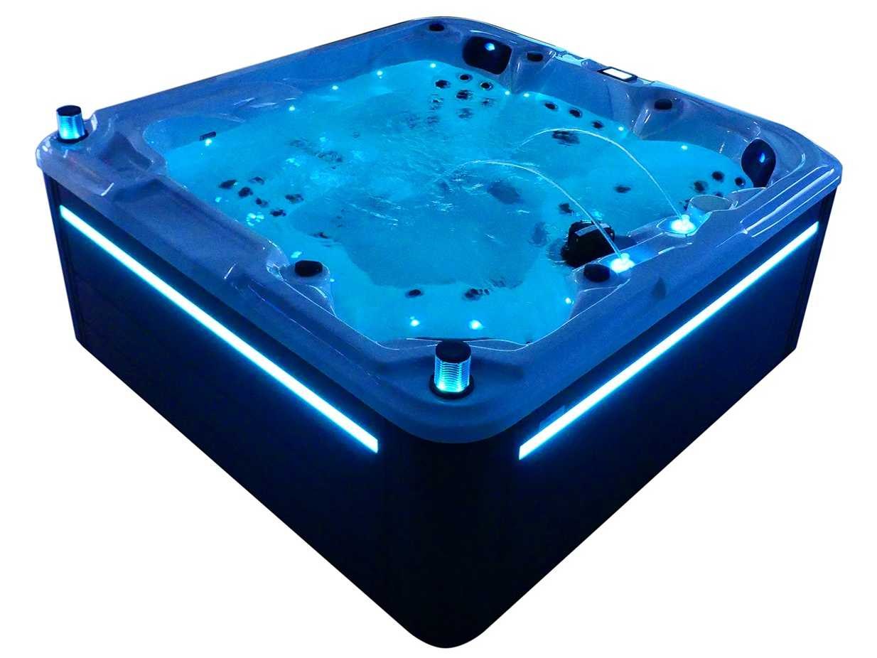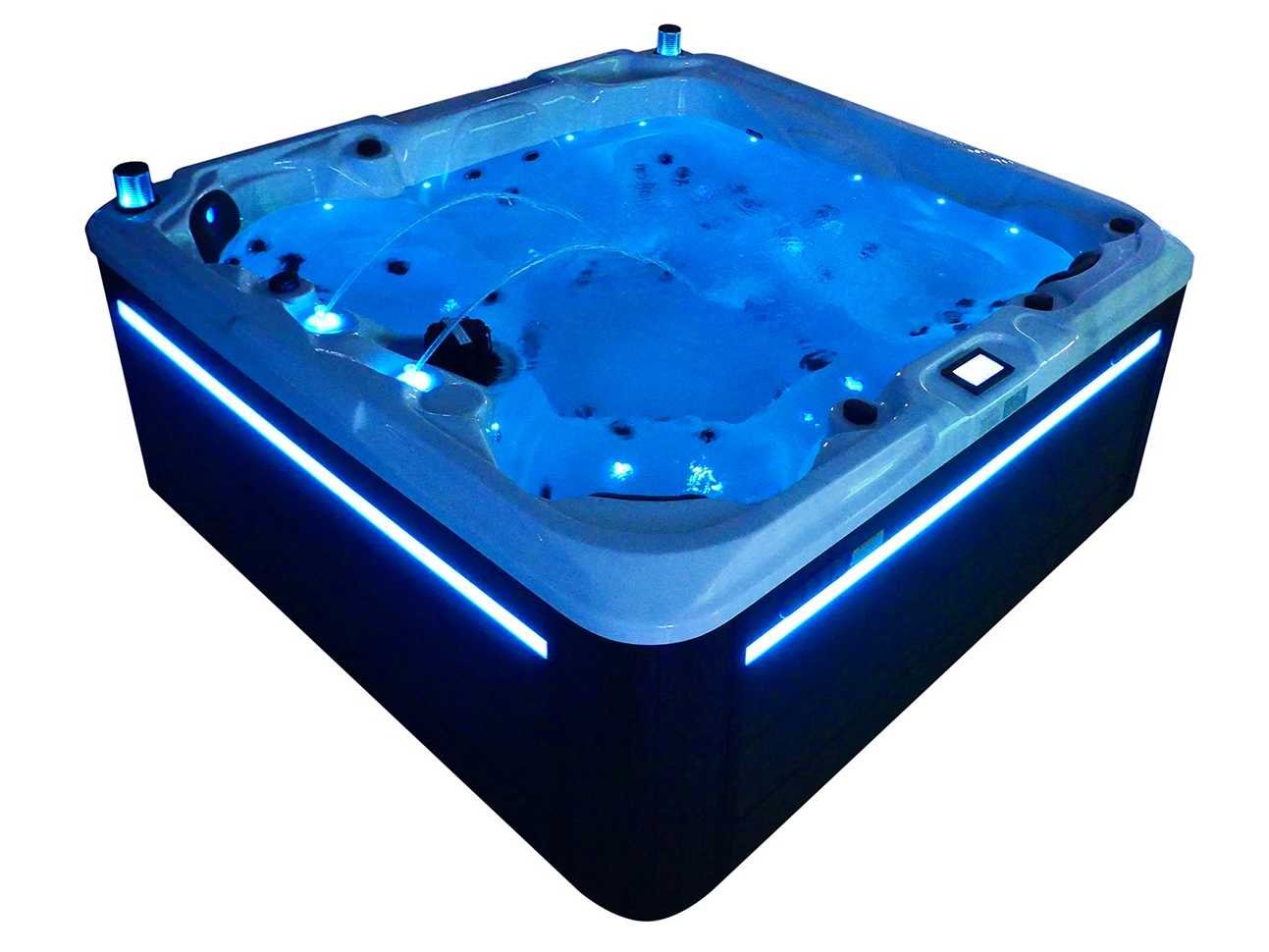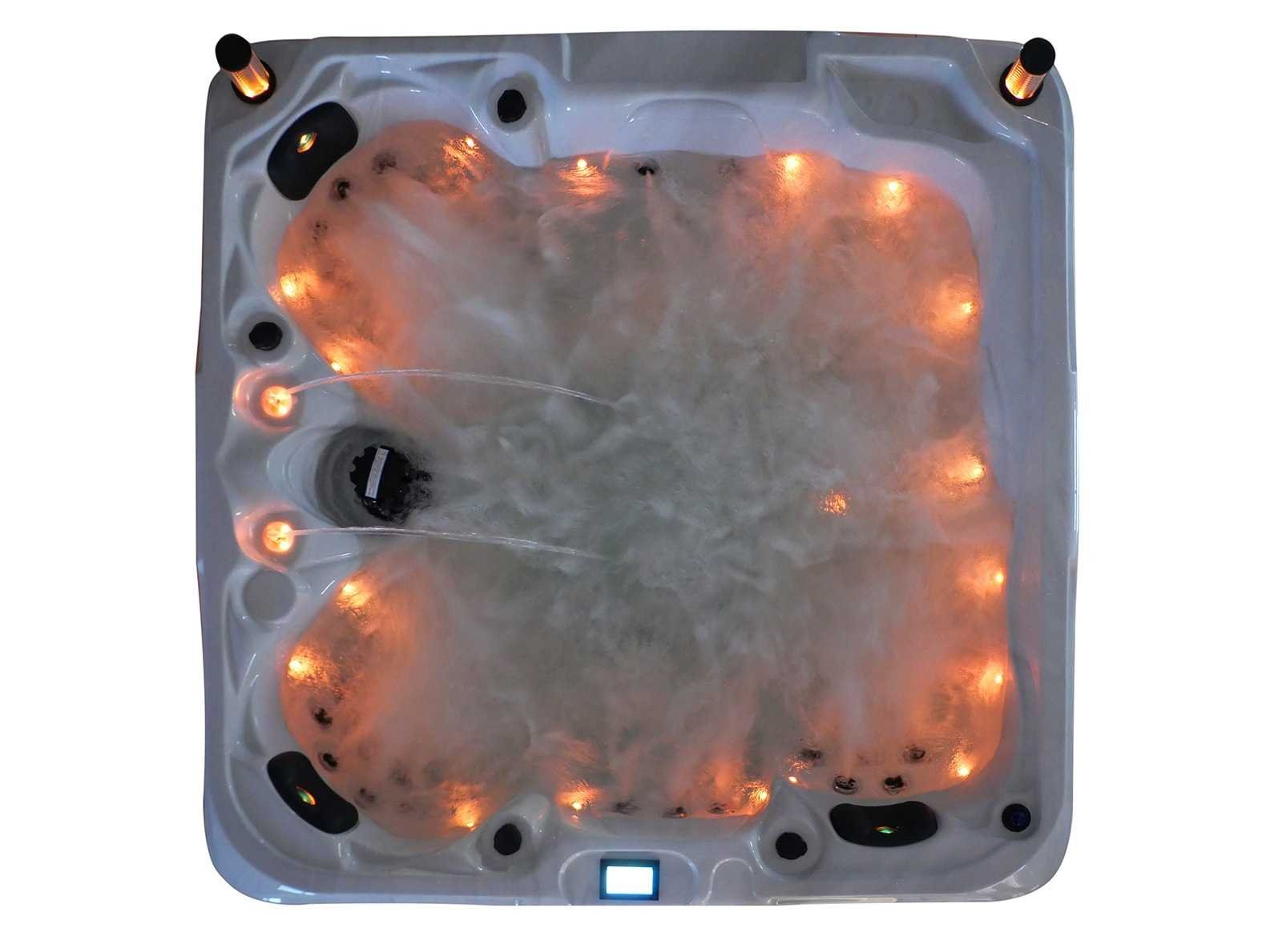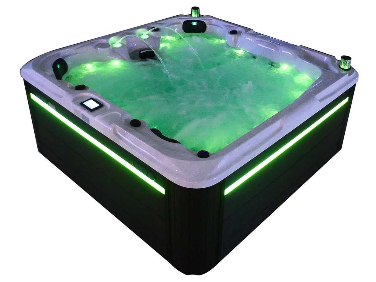 Besturing balboa (Balboa BP21 computer + nieuwste Spa touch 3 display), Balboa heater (3000 watt), Balboa wifi (voor besturing op afstand met de telefoon/tablet), Balboa bluetooth audio, 2 popup speakers met ledverlichting, Subwoofer, kunststof onderhoudsvrije ombouw met ledverlichting rondom in de zijpanelen, 4 massage pompen (1* 2,5pk, 2* 2pk en 1* 400 watt luchtpomp), 24h circulatiepomp (0,5pk), 4 zitplaatsen en 1 ligplaats (3 plaatsen voorzien van hoofdkussen), dikke (zwarte) afdek cover inclusief, totaal 83 rvs stainless steel RVS jets waarvan 14 luchtjets met ledverlichting (diverse maten en verschillende hydro stralen), extra nek en voet massage jets, vorst beveiliging, ozone desinfectie systeem 50mg/h, diverse leds (36 stuks) verlichting langs de waterrand, aroma feeder, 2x pop-up water fontein met ledverlichting, 1x grote waterval met ledverlichting, diverse regelknoppen om de de kracht en de verdeling naar de jets te regelen, 1x oppervlakte en reinigingsfilter, kuip extra dikke foam isolatie (minimaal 45mm) + extra isolatie aan de buitenwanden met folie + 5mm dikke isolatie op de PVC gesloten bdem, waterafvoer, inclusief trapje, Aluminium frame (zeer sterk en roest bestendig) deze spa zit vol met alle mogelijk bestelbare opties, dit betreft een nieuw product in verpakking. De spa kan zowel op 220volt als 380volt worden aangesloten (27a of 41a). Merk: Mawialux Model: Mia Vermogen: 8500W Spanning: 220-380V Filters: 1 Verlichting: diverse leds met kleurentherapie (7 kleuren) op waterniveau Inhoud: 1500l Pompen: 5 Jets: 83 Aantal personen: 5 Kleur: Binnenkuip keuze uit 3 kleuren (H03 zwart, of H06 wit of H12 grijs) met donker zwarte ombouw (kleurkeuze graag doorgeven per email op info@mawialux.nl) Gewicht: 420kg Lengte: 220cm Breedte: 220cm Hoogte: 95cm Materiaal: USA Aristech acryl + Aluminium frame + kunststof ombouw + PVC gesloten bodem