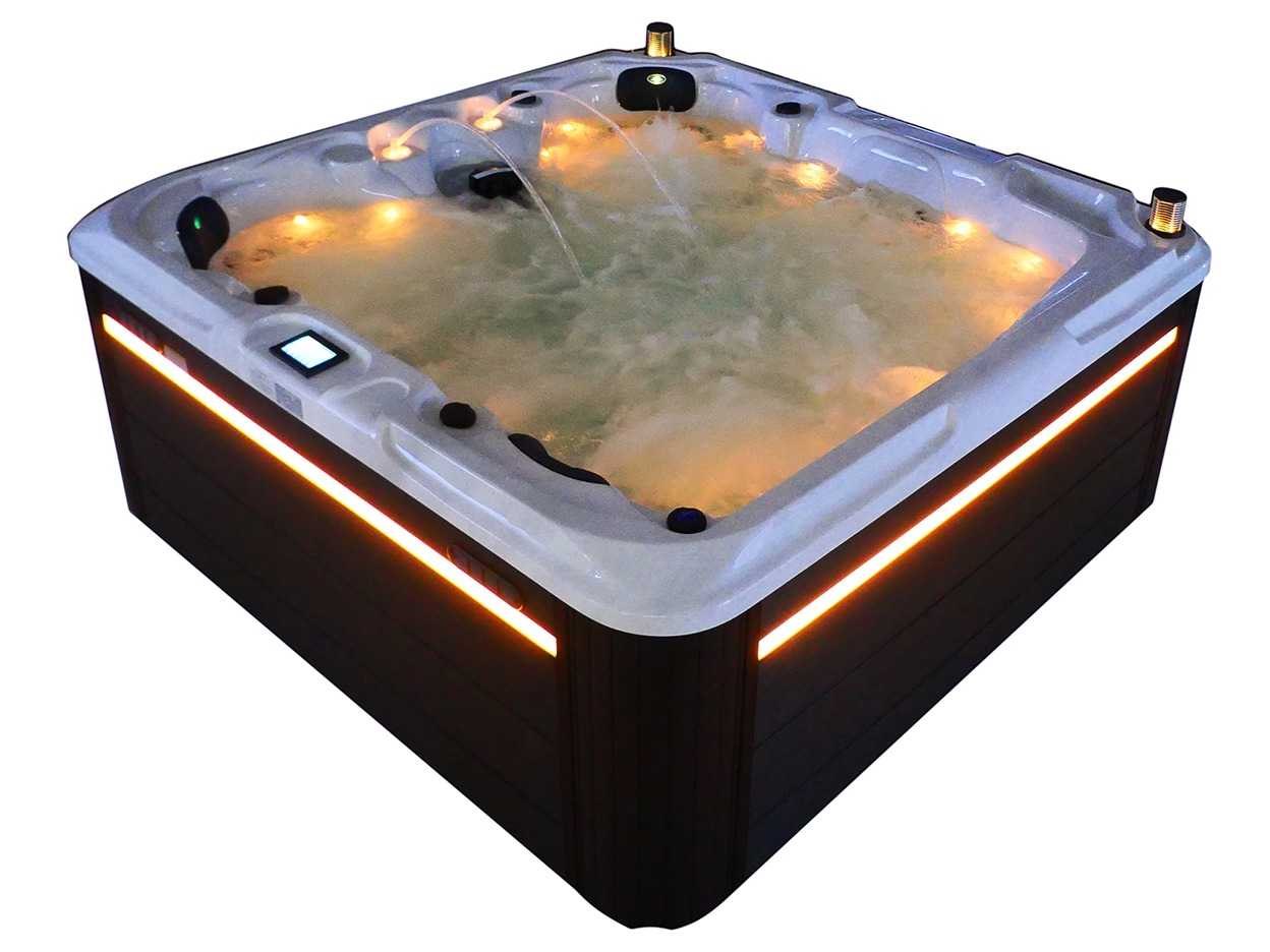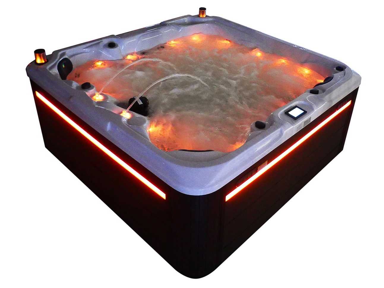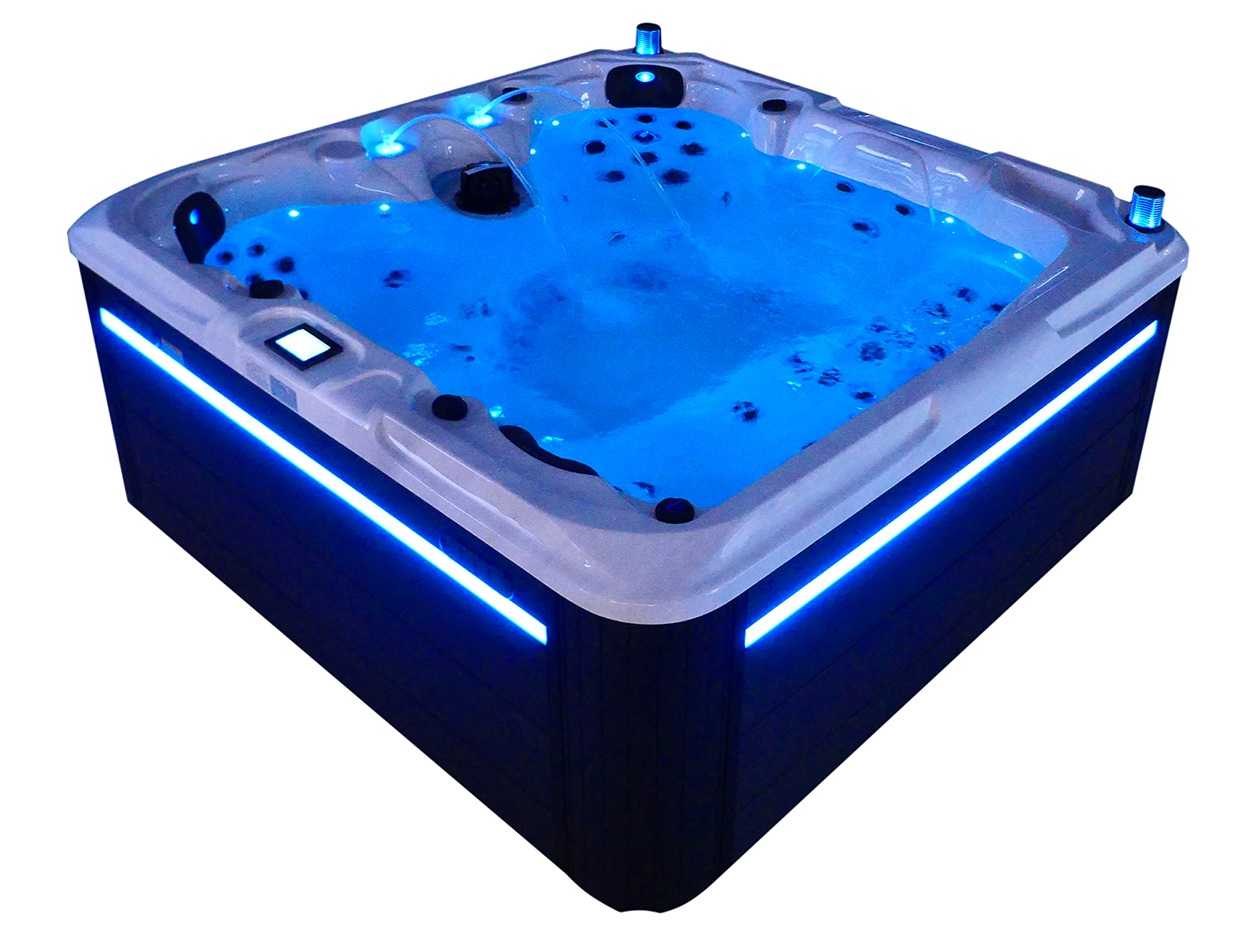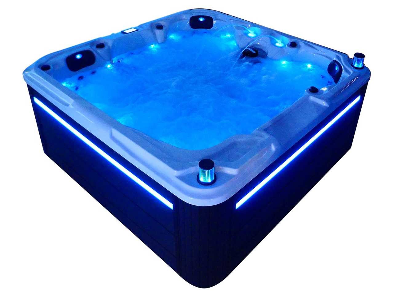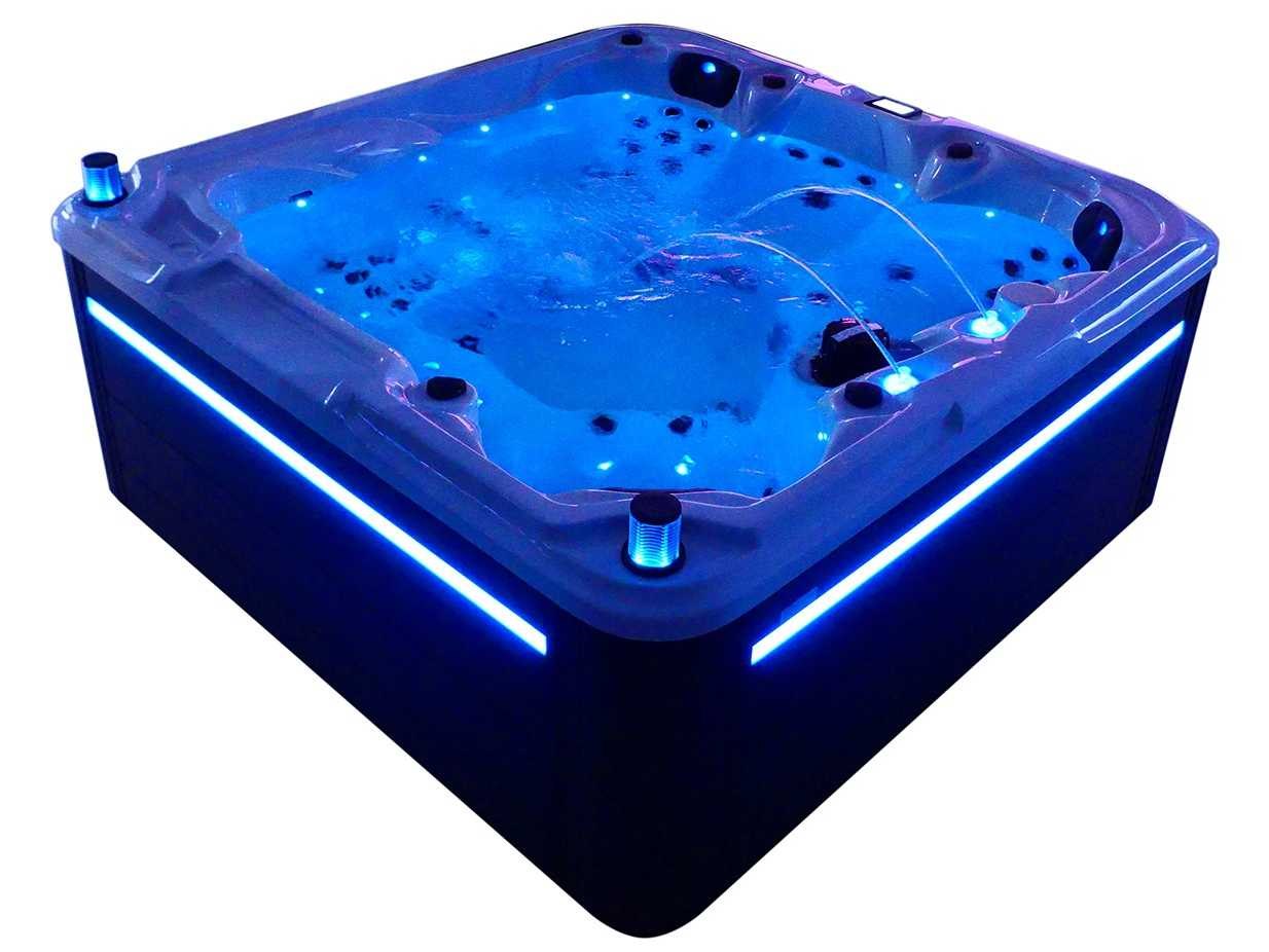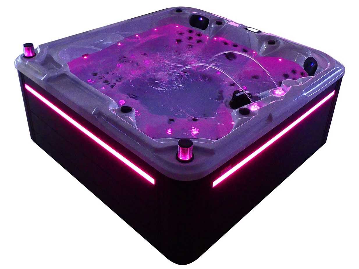 Besturing balboa (Balboa BP21 computer + nieuwste Spa touch 3 display), Balboa heater (3000 watt), Balboa wifi (voor besturing op afstand met de telefoon/tablet), Balboa bluetooth audio, 2 popup speakers met ledverlichting, Subwoofer, kunststof onderhoudsvrije ombouw met ledverlichting rondom in de zijpanelen, 4 massage pompen (1* 2,5pk, 2* 2pk en 1* 400 watt luchtpomp), 24h circulatiepomp (0,5pk), 4 zitplaatsen en 1 ligplaats (3 plaatsen voorzien van hoofdkussen), dikke (zwarte) afdek cover inclusief, totaal 83 rvs stainless steel RVS jets waarvan 14 luchtjets met ledverlichting (diverse maten en verschillende hydro stralen), extra nek en voet massage jets, vorst beveiliging, ozone desinfectie systeem 50mg/h, diverse leds (36 stuks) verlichting langs de waterrand, aroma feeder, 2x pop-up water fontein met ledverlichting, 1x grote waterval met ledverlichting, diverse regelknoppen om de de kracht en de verdeling naar de jets te regelen, 1x oppervlakte en reinigingsfilter, kuip extra dikke foam isolatie (minimaal 45mm) + extra isolatie aan de buitenwanden met folie + 5mm dikke isolatie op de PVC gesloten bdem, waterafvoer, inclusief trapje, Aluminium frame (zeer sterk en roest bestendig) deze spa zit vol met alle mogelijk bestelbare opties, dit betreft een nieuw product in verpakking. De spa kan zowel op 220volt als 380volt worden aangesloten (27a of 41a). Merk: Mawialux Model: Mia Vermogen: 8500W Spanning: 220-380V Filters: 1 Verlichting: diverse leds met kleurentherapie (7 kleuren) op waterniveau Inhoud: 1500l Pompen: 5 Jets: 83 Aantal personen: 5 Kleur: Binnenkuip keuze uit 3 kleuren (H03 zwart, of H06 wit of H12 grijs) met donker zwarte ombouw (kleurkeuze graag doorgeven per email op info@mawialux.nl) Gewicht: 420kg Lengte: 220cm Breedte: 220cm Hoogte: 95cm Materiaal: USA Aristech acryl + Aluminium frame + kunststof ombouw + PVC gesloten bodem