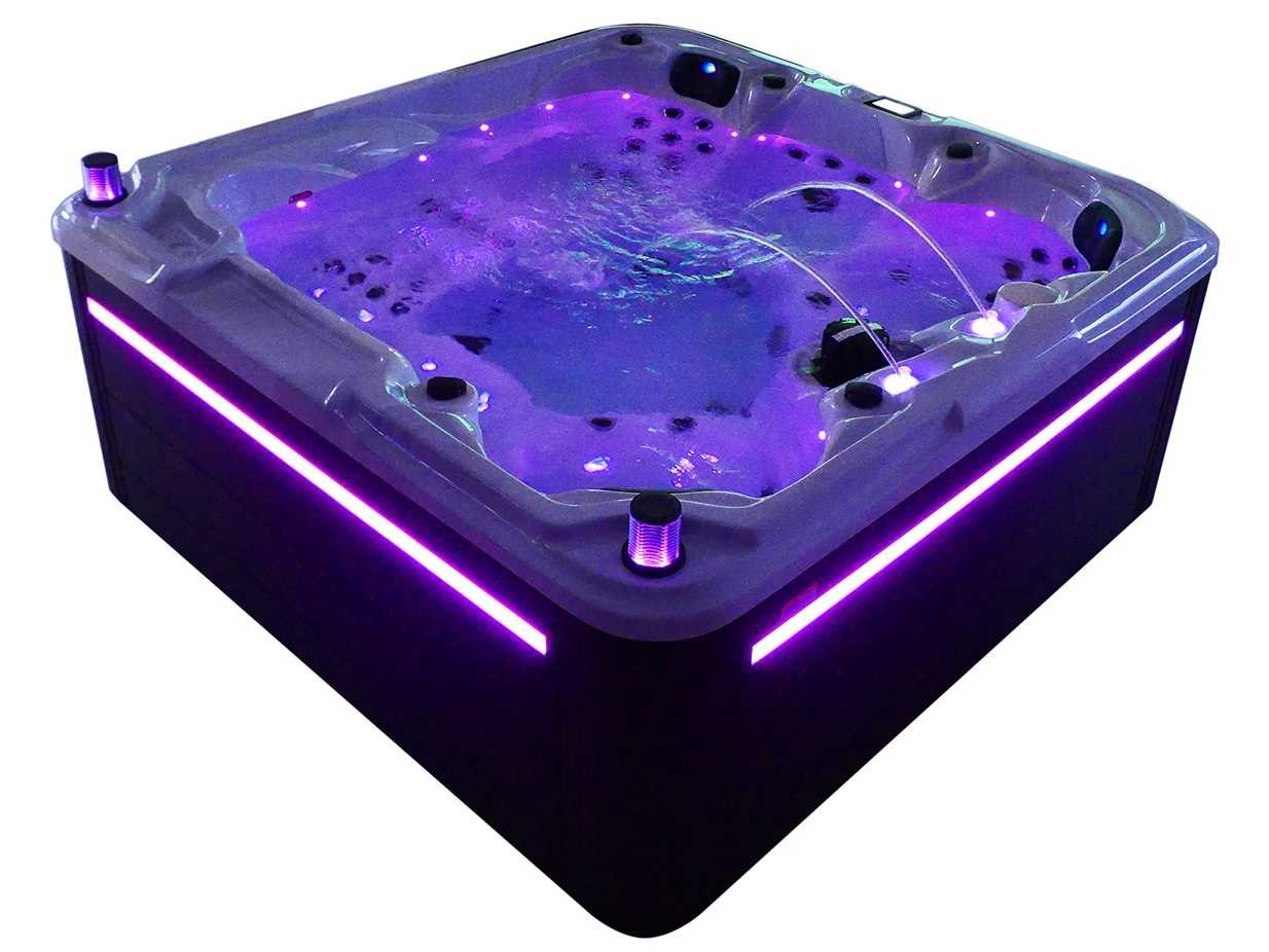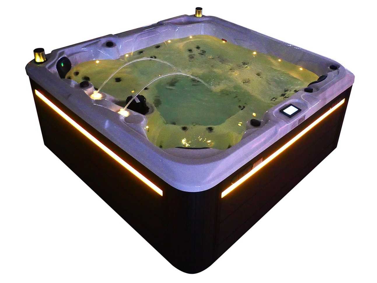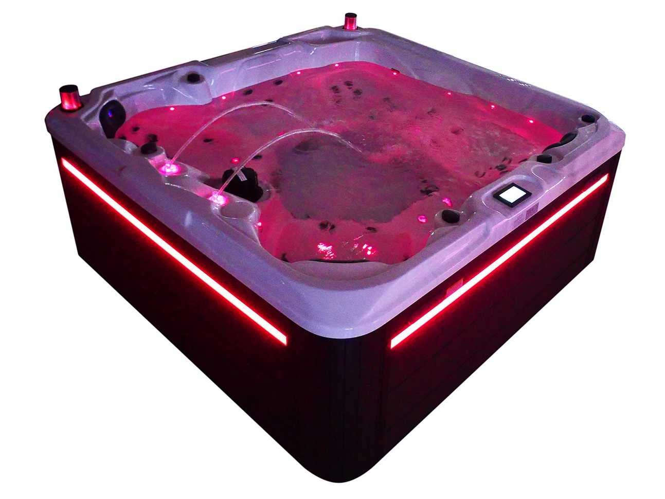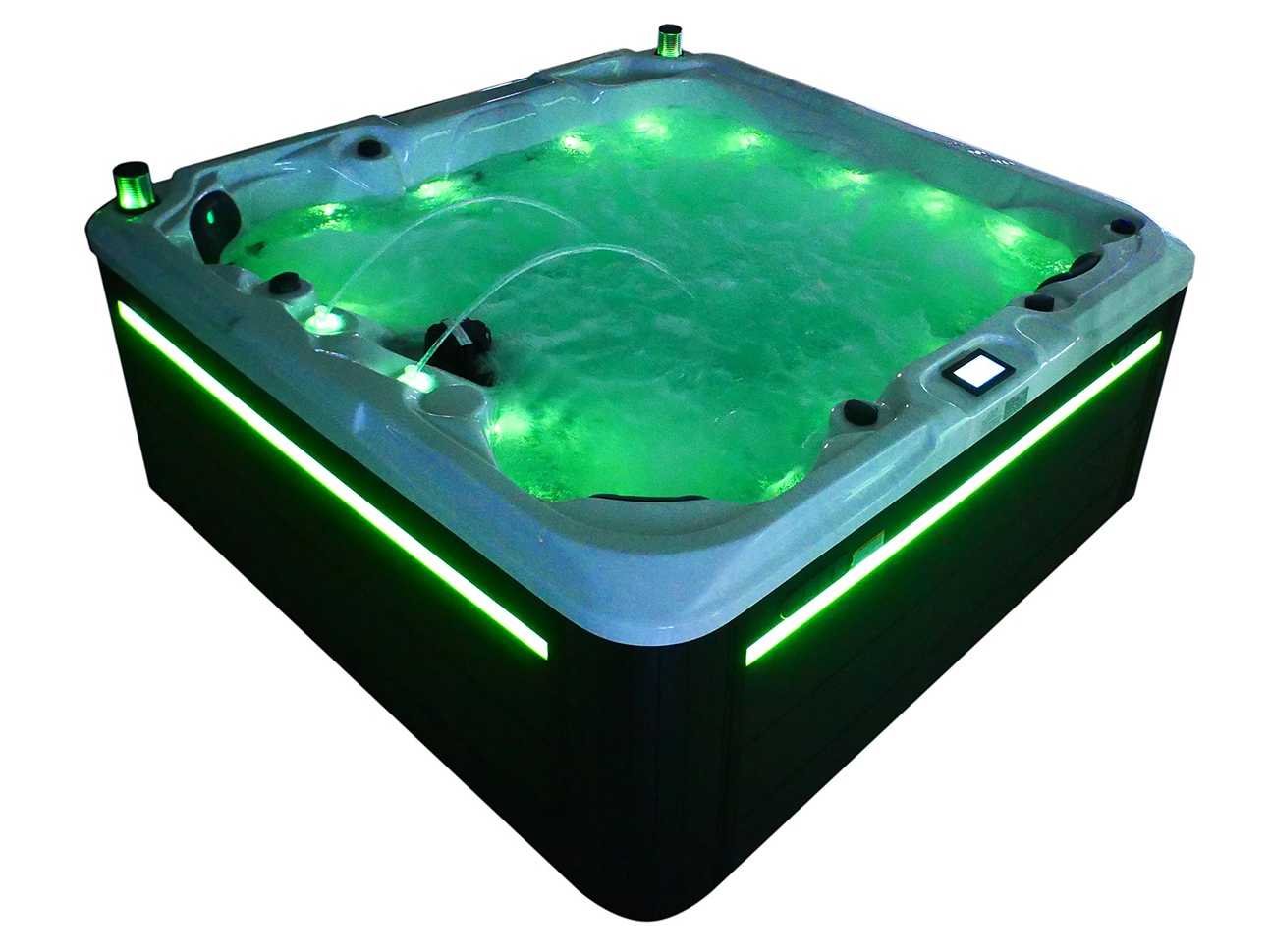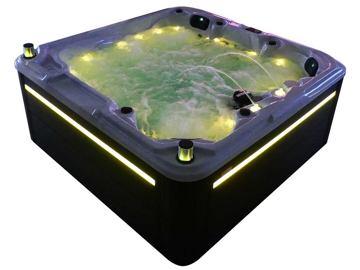 Besturing balboa (Balboa BP21 computer + nieuwste Spa touch 3 display), Balboa heater (3000 watt), Balboa wifi (voor besturing op afstand met de telefoon/tablet), Balboa bluetooth audio, 2 popup speakers met ledverlichting, Subwoofer, kunststof onderhoudsvrije ombouw met ledverlichting rondom in de zijpanelen, 4 massage pompen (1* 2,5pk, 2* 2pk en 1* 400 watt luchtpomp), 24h circulatiepomp (0,5pk), 4 zitplaatsen en 1 ligplaats (3 plaatsen voorzien van hoofdkussen), dikke (zwarte) afdek cover inclusief, totaal 83 rvs stainless steel RVS jets waarvan 14 luchtjets met ledverlichting (diverse maten en verschillende hydro stralen), extra nek en voet massage jets, vorst beveiliging, ozone desinfectie systeem 50mg/h, diverse leds (36 stuks) verlichting langs de waterrand, aroma feeder, 2x pop-up water fontein met ledverlichting, 1x grote waterval met ledverlichting, diverse regelknoppen om de de kracht en de verdeling naar de jets te regelen, 1x oppervlakte en reinigingsfilter, kuip extra dikke foam isolatie (minimaal 45mm) + extra isolatie aan de buitenwanden met folie + 5mm dikke isolatie op de PVC gesloten bdem, waterafvoer, inclusief trapje, Aluminium frame (zeer sterk en roest bestendig) deze spa zit vol met alle mogelijk bestelbare opties, dit betreft een nieuw product in verpakking. De spa kan zowel op 220volt als 380volt worden aangesloten (27a of 41a). Merk: Mawialux Model: Mia Vermogen: 8500W Spanning: 220-380V Filters: 1 Verlichting: diverse leds met kleurentherapie (7 kleuren) op waterniveau Inhoud: 1500l Pompen: 5 Jets: 83 Aantal personen: 5 Kleur: Binnenkuip keuze uit 3 kleuren (H03 zwart, of H06 wit of H12 grijs) met donker zwarte ombouw (kleurkeuze graag doorgeven per email op info@mawialux.nl) Gewicht: 420kg Lengte: 220cm Breedte: 220cm Hoogte: 95cm Materiaal: USA Aristech acryl + Aluminium frame + kunststof ombouw + PVC gesloten bodem