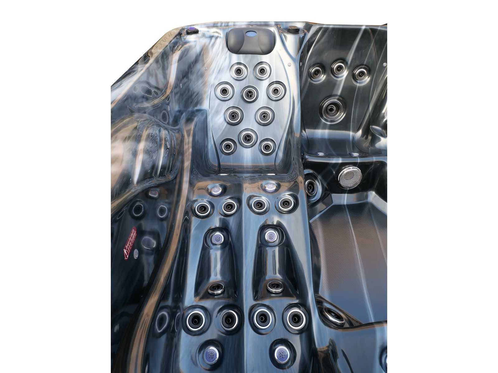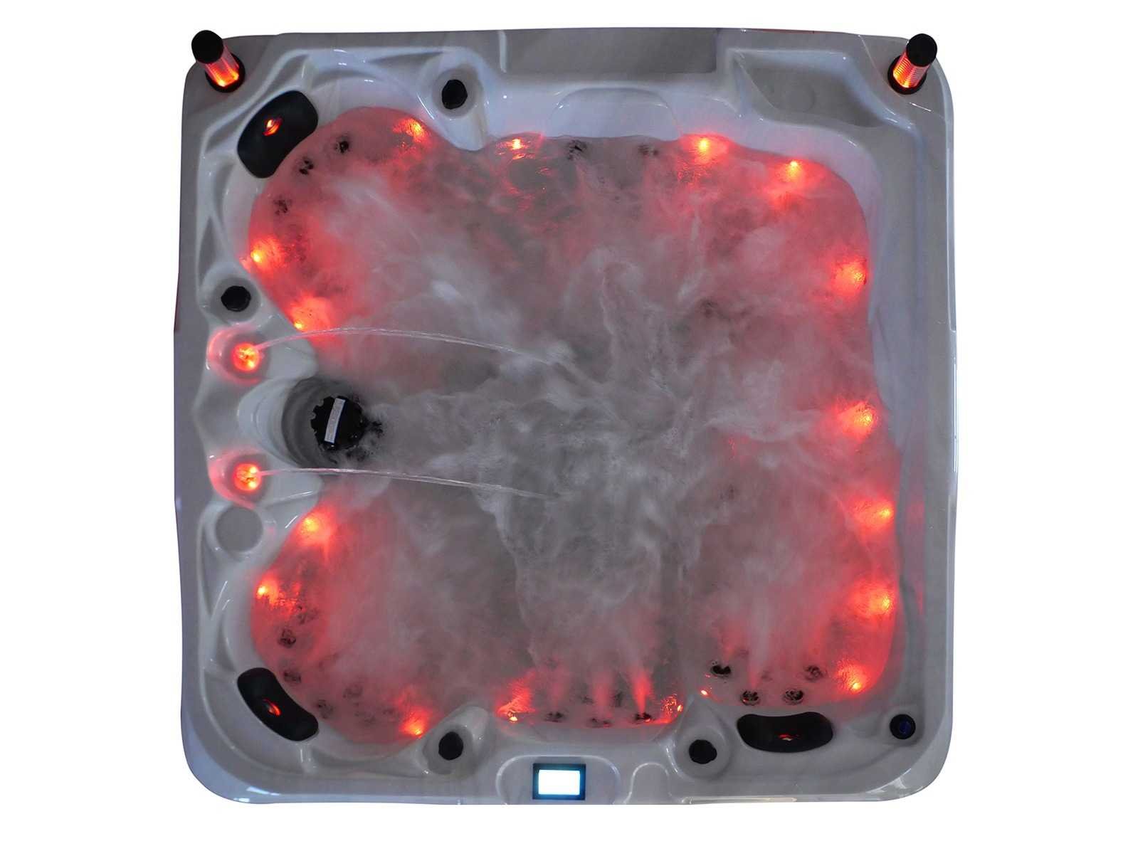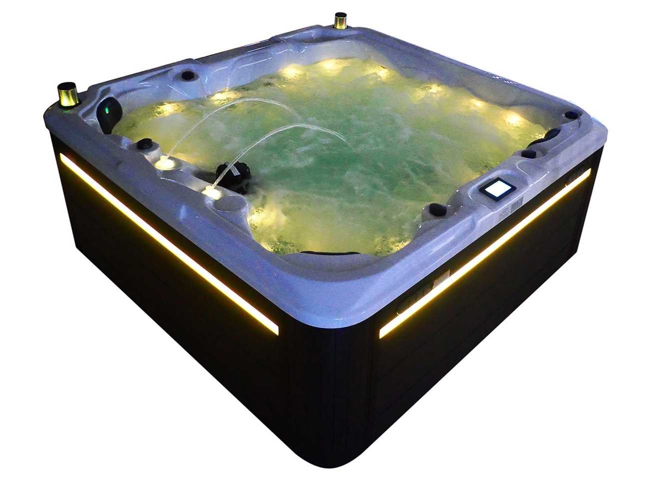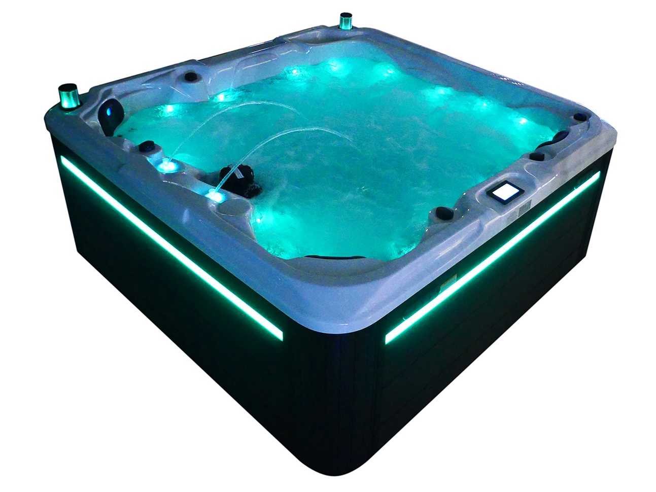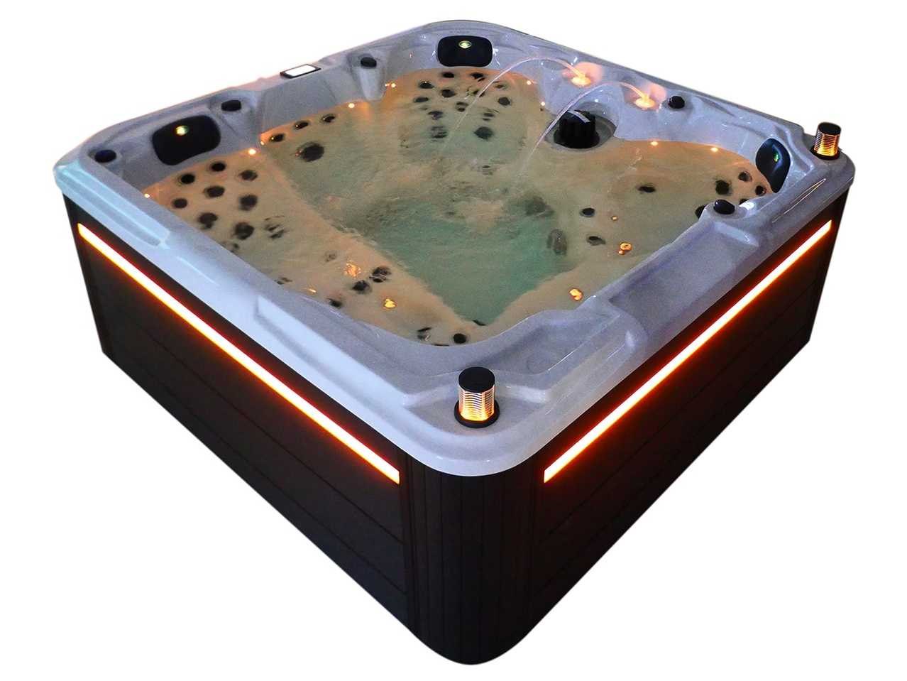 Besturing balboa (Balboa BP21 computer + nieuwste Spa touch 3 display), Balboa heater (3000 watt), Balboa wifi (voor besturing op afstand met de telefoon/tablet), Balboa bluetooth audio, 2 popup speakers met ledverlichting, Subwoofer, kunststof onderhoudsvrije ombouw met ledverlichting rondom in de zijpanelen, 4 massage pompen (1* 2,5pk, 2* 2pk en 1* 400 watt luchtpomp), 24h circulatiepomp (0,5pk), 4 zitplaatsen en 1 ligplaats (3 plaatsen voorzien van hoofdkussen), dikke (zwarte) afdek cover inclusief, totaal 83 rvs stainless steel RVS jets waarvan 14 luchtjets met ledverlichting (diverse maten en verschillende hydro stralen), extra nek en voet massage jets, vorst beveiliging, ozone desinfectie systeem 50mg/h, diverse leds (36 stuks) verlichting langs de waterrand, aroma feeder, 2x pop-up water fontein met ledverlichting, 1x grote waterval met ledverlichting, diverse regelknoppen om de de kracht en de verdeling naar de jets te regelen, 1x oppervlakte en reinigingsfilter, kuip extra dikke foam isolatie (minimaal 45mm) + extra isolatie aan de buitenwanden met folie + 5mm dikke isolatie op de PVC gesloten bdem, waterafvoer, inclusief trapje, Aluminium frame (zeer sterk en roest bestendig) deze spa zit vol met alle mogelijk bestelbare opties, dit betreft een nieuw product in verpakking. De spa kan zowel op 220volt als 380volt worden aangesloten (27a of 41a). Merk: Mawialux Model: Mia Vermogen: 8500W Spanning: 220-380V Filters: 1 Verlichting: diverse leds met kleurentherapie (7 kleuren) op waterniveau Inhoud: 1500l Pompen: 5 Jets: 83 Aantal personen: 5 Kleur: Binnenkuip keuze uit 3 kleuren (H03 zwart, of H06 wit of H12 grijs) met donker zwarte ombouw (kleurkeuze graag doorgeven per email op info@mawialux.nl) Gewicht: 420kg Lengte: 220cm Breedte: 220cm Hoogte: 95cm Materiaal: USA Aristech acryl + Aluminium frame + kunststof ombouw + PVC gesloten bodem