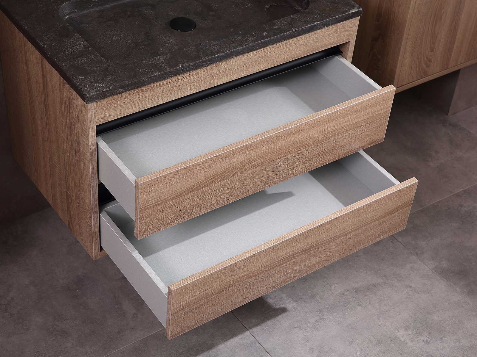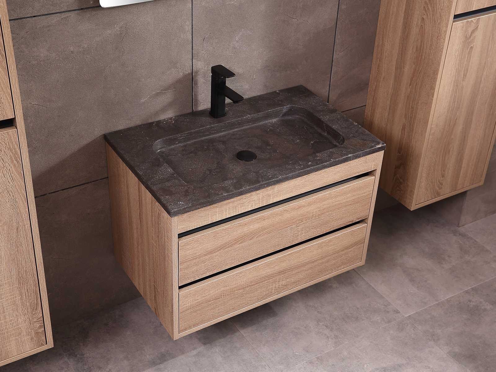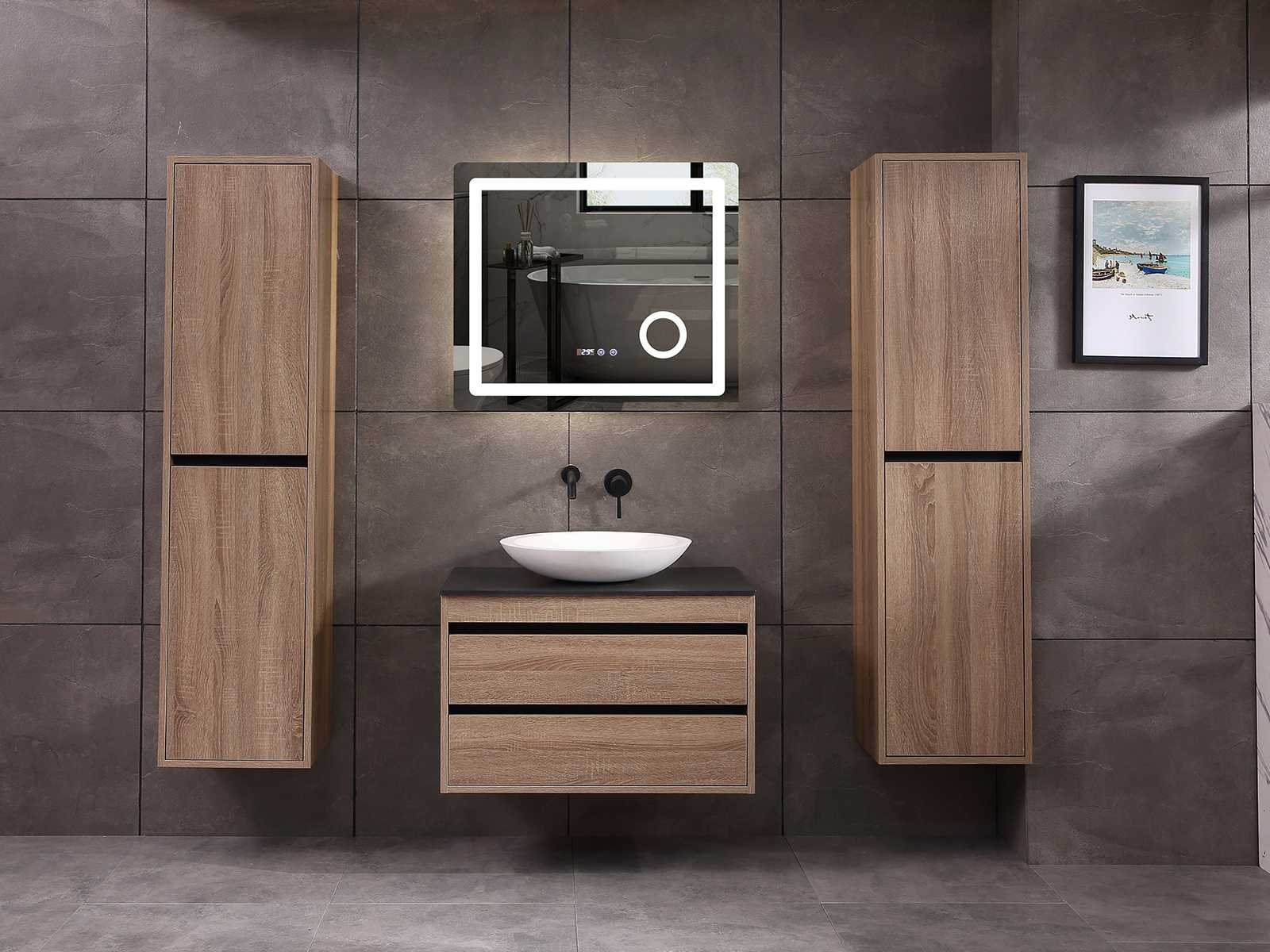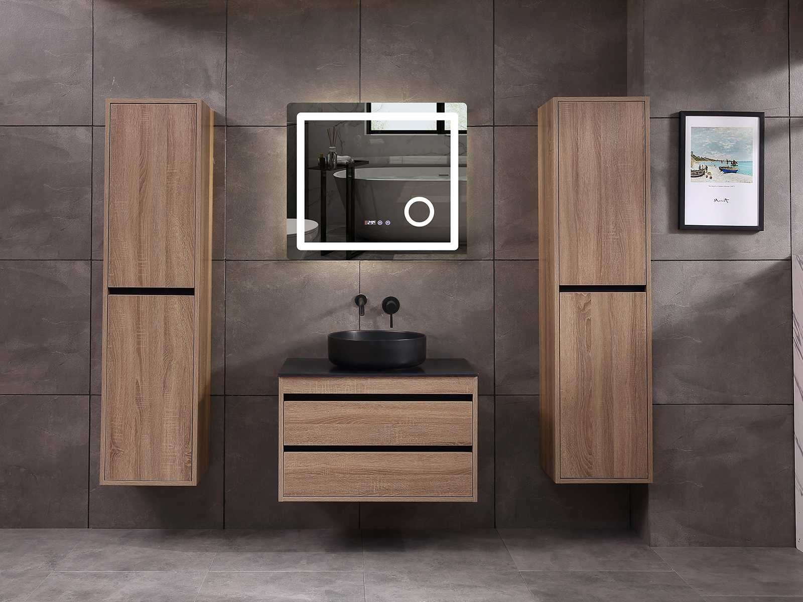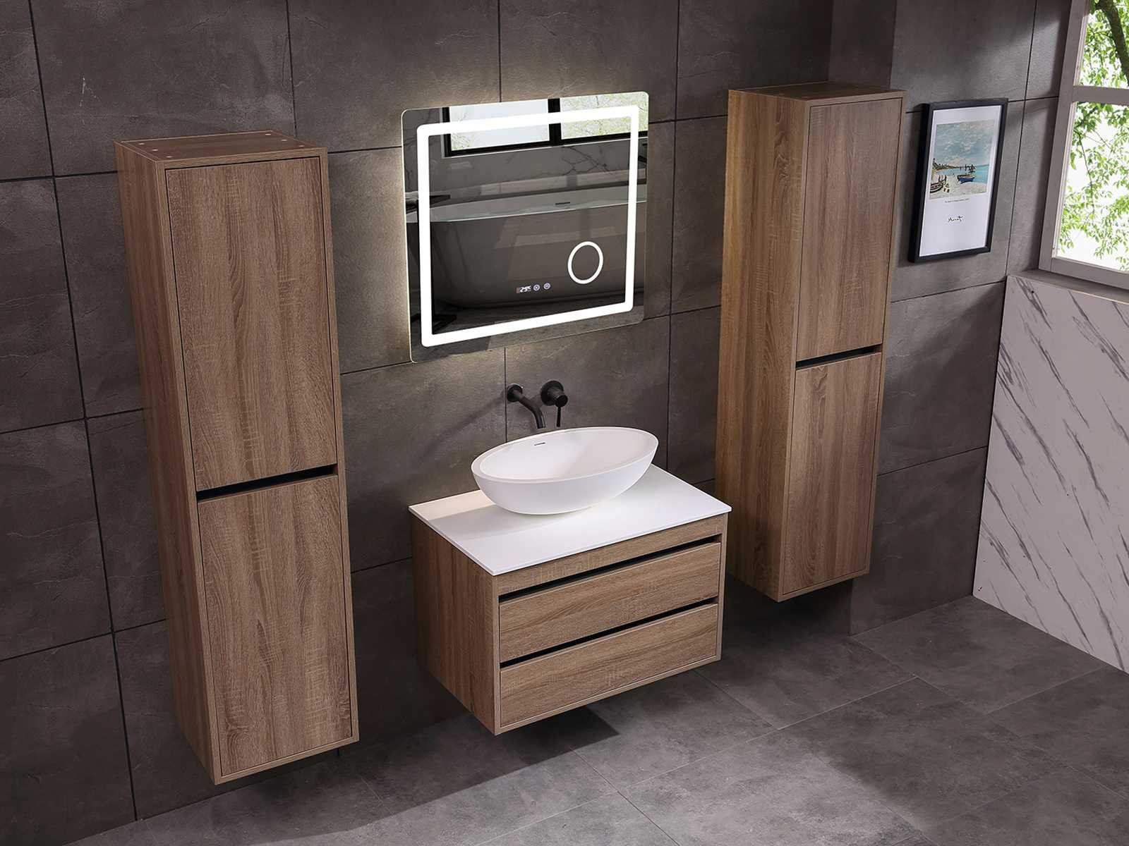 Afmeting meubel: bxdxh 80x49x50cm - hangkast 40x35x160cm, Kleur bruin eiken, Materiaal 2cm 5-laags multiplex(zeer sterk en vochtbestendig), Hangkast softclose deuren en extra planchets (hangkast is universeel en kan zowel links als rechts naast het meubel gehangen worden), Kranen exclusief, Lades 2 stuks met softclose, Wastafel natuursteen of solid surface (keuze uit diverse modellen van de laatste foto's vaste of losse wasbakken met een mat witte of mat zwarte solid surface top, vaste bakken zijn ook zonder kraangaten beschikbaar zodat u een muurkraan kunt gebruiken! keuze graag aangeven per email op info@mawialux.nl, Spiegel ledspiegel met ledverlichting(6000K led-dioden)/vergrootglas/verwarming(anti condens)/klok met touchscreen (mag ook voor een ronde spiegel geruild worden indien gewenst of tegen een kleine meerprijs een luxure variant met display, bluetooth en speakers, neem daarvoor contact met ons op voor een passende aanbieding op info@mawialux.nl), Afvoeren exclusief , Conditie: Nieuw in doos, Bijzonderheden 2 jaar garantie, compleet met installatiekit, mat zwarte aluminium grepen achter de inkepingen van de lades en deuren, natuursteen wastafel is behandeld met coating, zeer hoge kwaliteit, Extra's de hangkast mag geruild worden voor een kraan en afvoerset naar keus(graag aangeven per email op info@mawialux.nl) of als u een extra hangkast nodig heeft kunt u ons ook mailen voor een passende aanbieding Merk: mawialux Hoogte: 50cm Lengte: 49cm Breedte: 80cm Materiaal: 2cm 5-laags multiplex(zeer sterk en vochtbestendig) Kleur: bruin eiken Spiegel met verlichting: ja Lades: 2