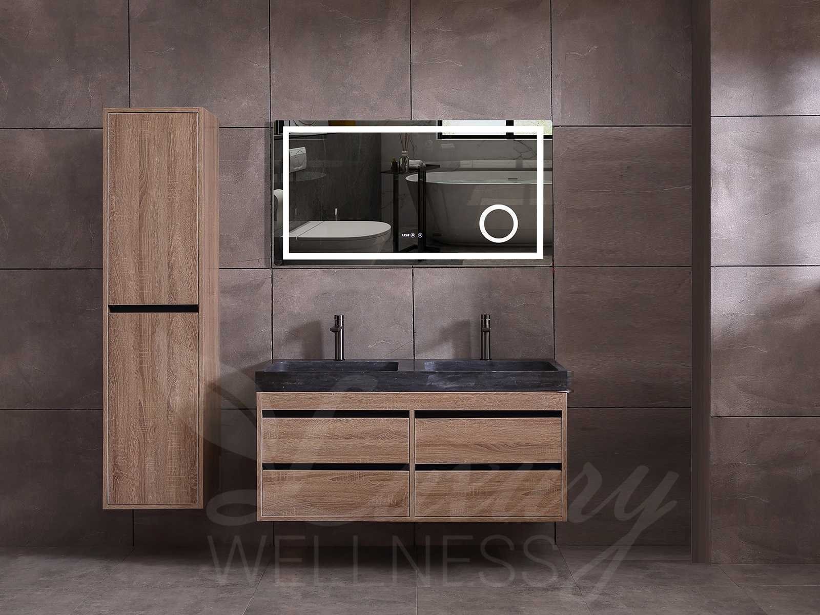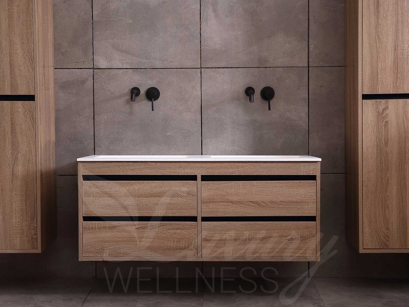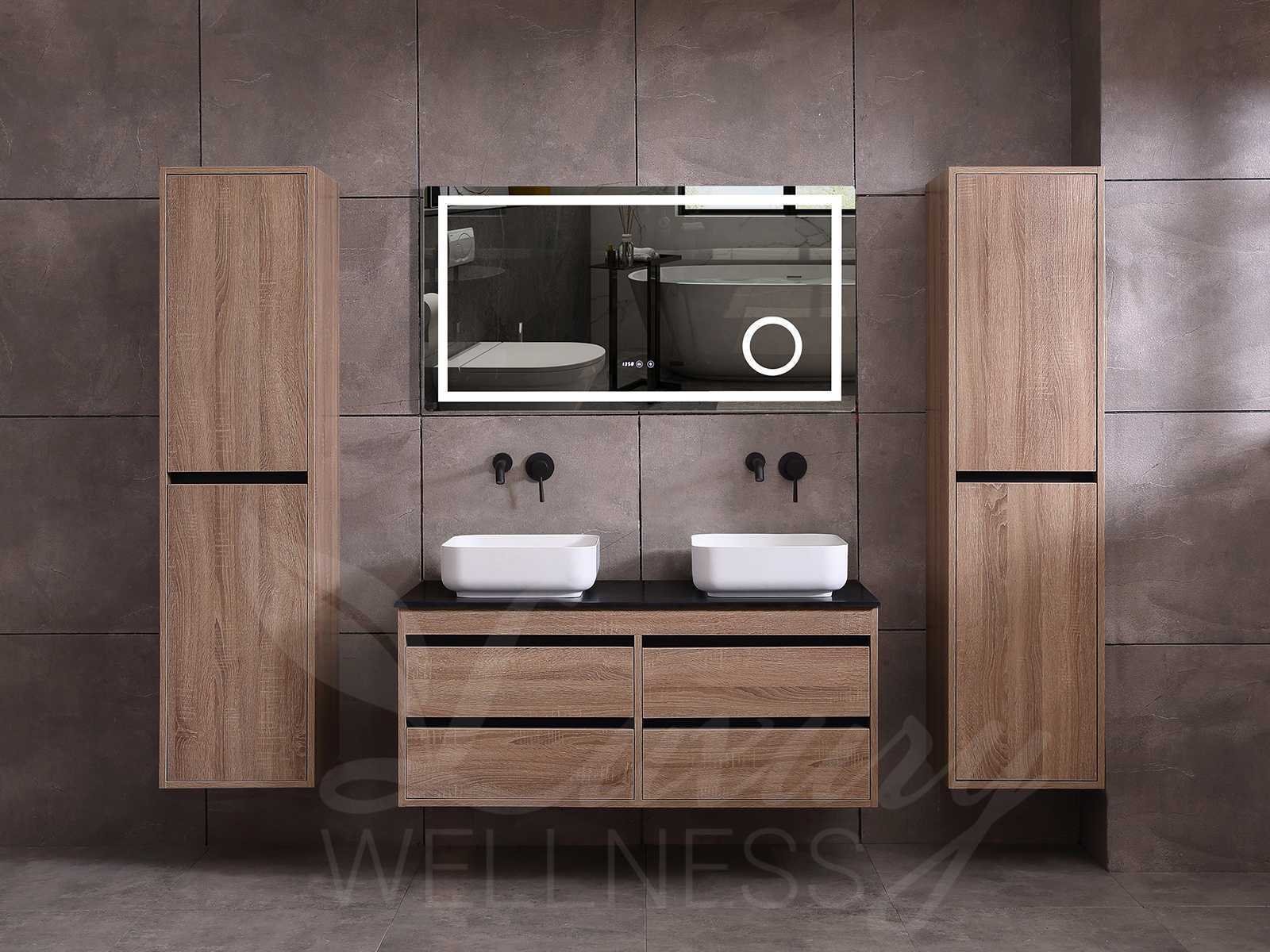 Afmeting meubel: bxdxh 120x49x50cm - hangkast 40x35x160cm, Kleur bruin eiken, Materiaal 2cm 5-laags multiplex(zeer sterk en vochtbestendig), Hangkast softclose deuren en extra planchets (hangkast is universeel en kan zowel links als rechts naast het meubel gehangen worden), Kranen exclusief , Lades 4 stuks met softclose, Wastafel natuursteen of solid surface (keuze uit diverse modellen van de laatste foto's vaste of losse wasbakken met een mat witte of mat zwarte solid surface top, vaste bakken zijn ook zonder kraangaten beschikbaar zodat u muurkranen kunt gebruiken! Keuze graag aangeven per email op info@mawialux.nl), Spiegel ledspiegel met ledverlichting(6000K led-dioden)/vergrootglas/verwarming(anti condens)/klok met touchscreen (mag ook voor een 80 of 100cm ronde spiegel geruild worden indien gewenst of tegen een kleine meerprijs een luxure variant met display, bluetooth en speakers, neem daarvoor contact met ons op voor een passende aanbieding op info@mawialux.nl), Afvoeren exclusief , Conditie: Nieuw in doos, Bijzonderheden 2 jaar garantie, compleet met installatiekit, mat zwarte aluminium grepen achter de inkepingen van de lades en deuren, natuursteen wastafel is behandeld met coating, zeer hoge kwaliteit, Extra's de hangkast mag geruild worden voor een set kranen en popup afvoeren naar keus(graag aangeven per email op info@mawialux.nl) of als u een extra hangkast nodig heeft kunt u ons ook mailen voor een passende aanbieding Merk: mawialux Hoogte: 50cm Lengte: 49cm Breedte: 120cm Materiaal: 2cm 5-laags multiplex(zeer sterk en vochtbestendig) Kleur: bruin eiken Spiegel met verlichting: ja Lades: 4
