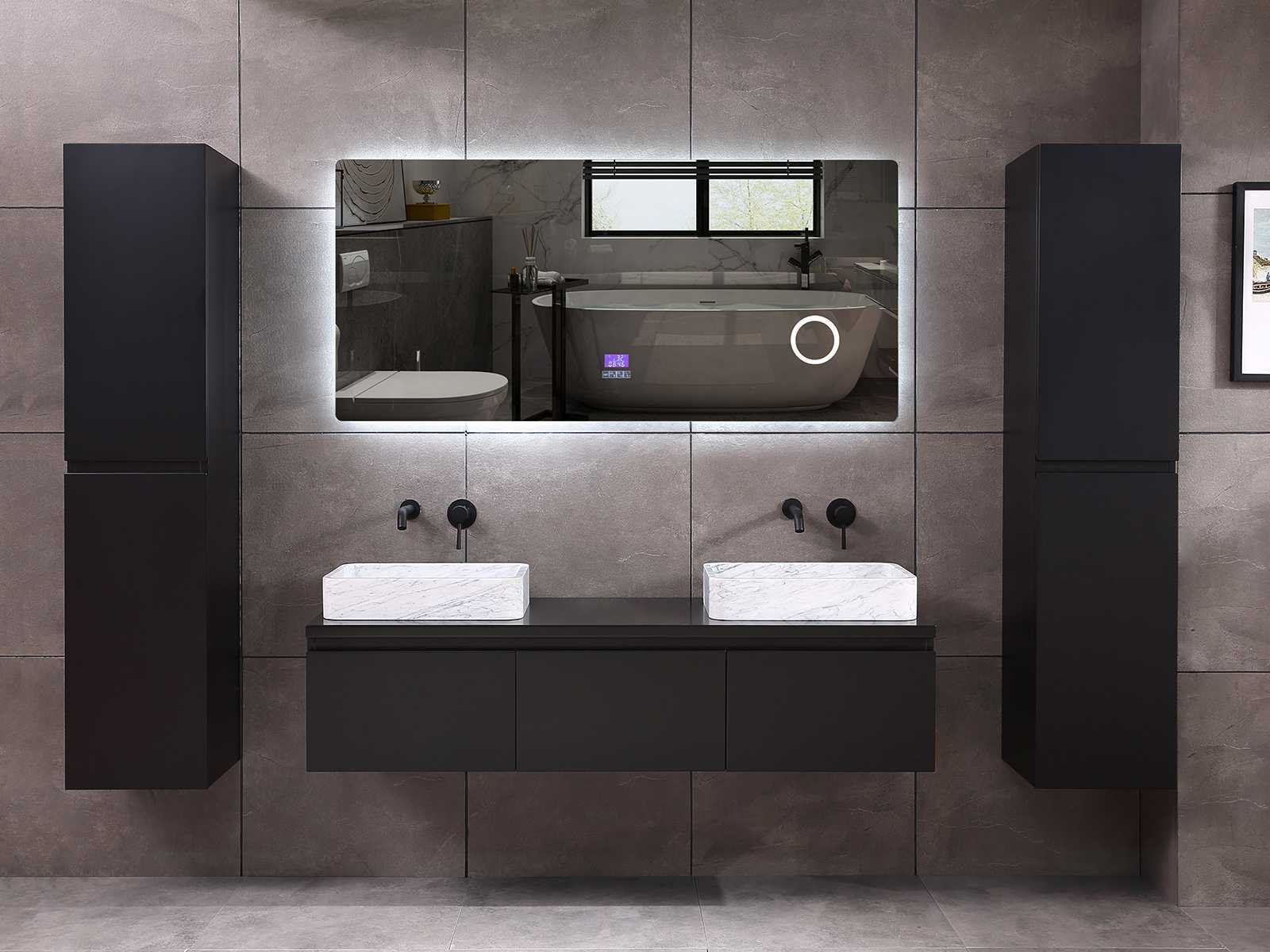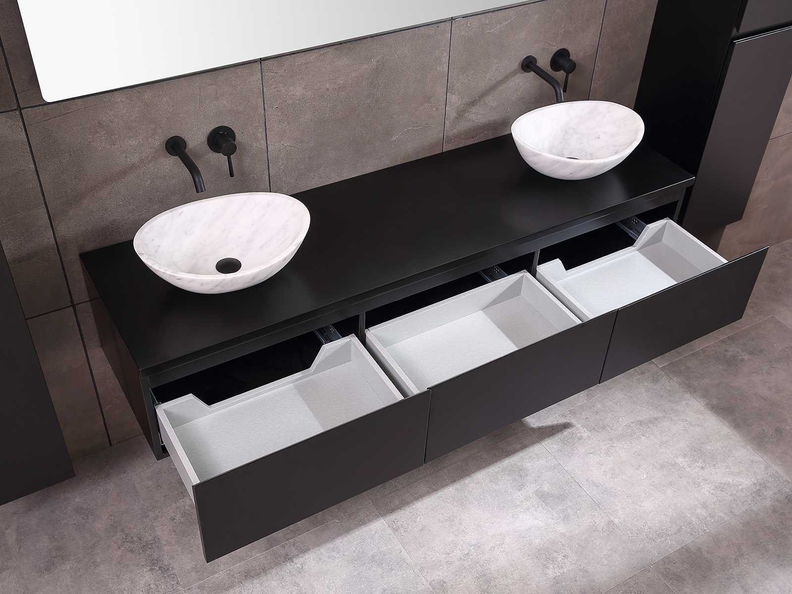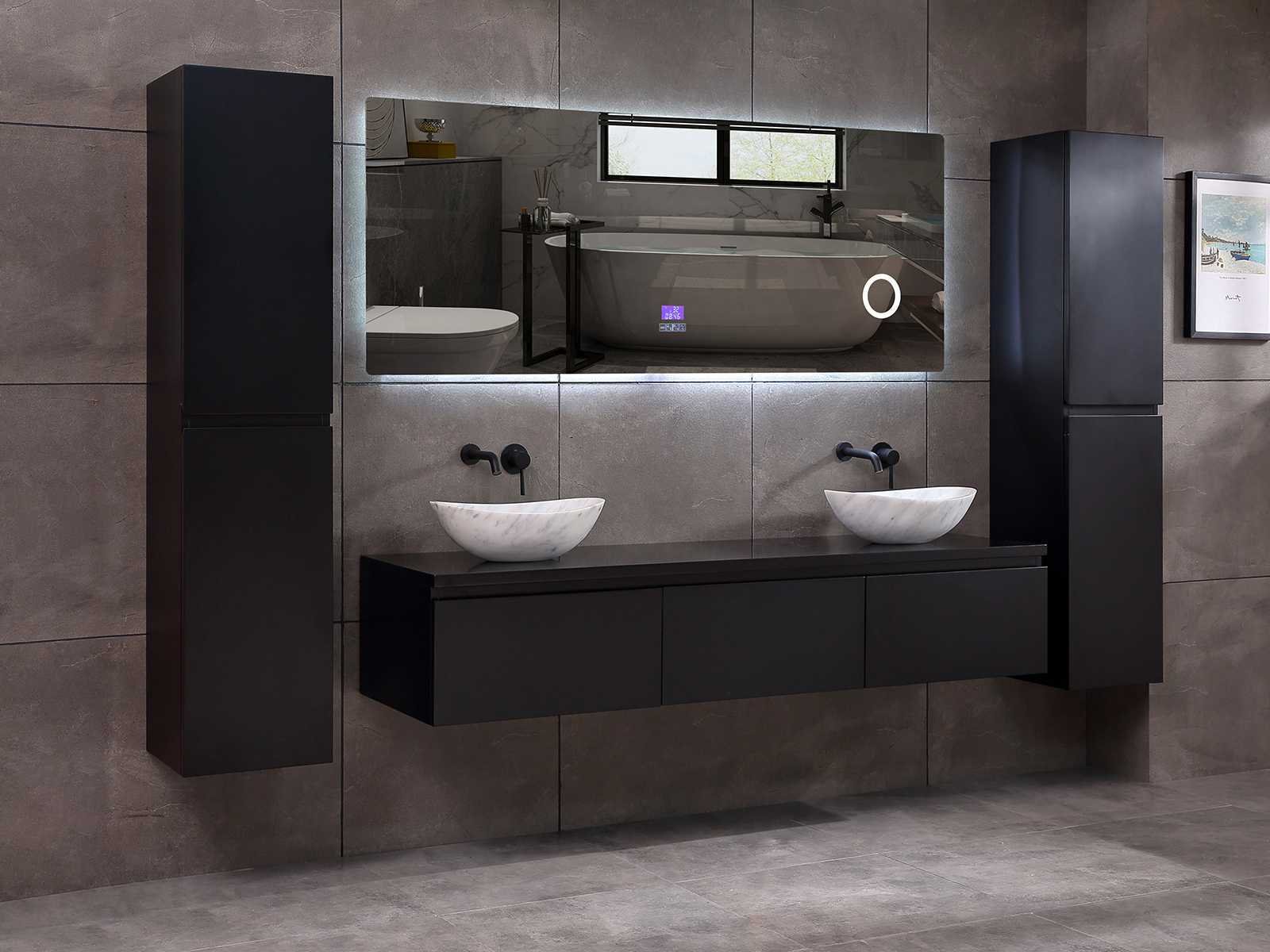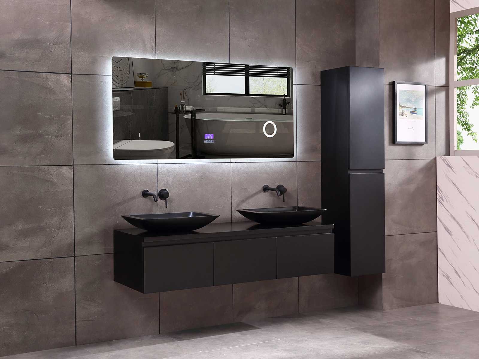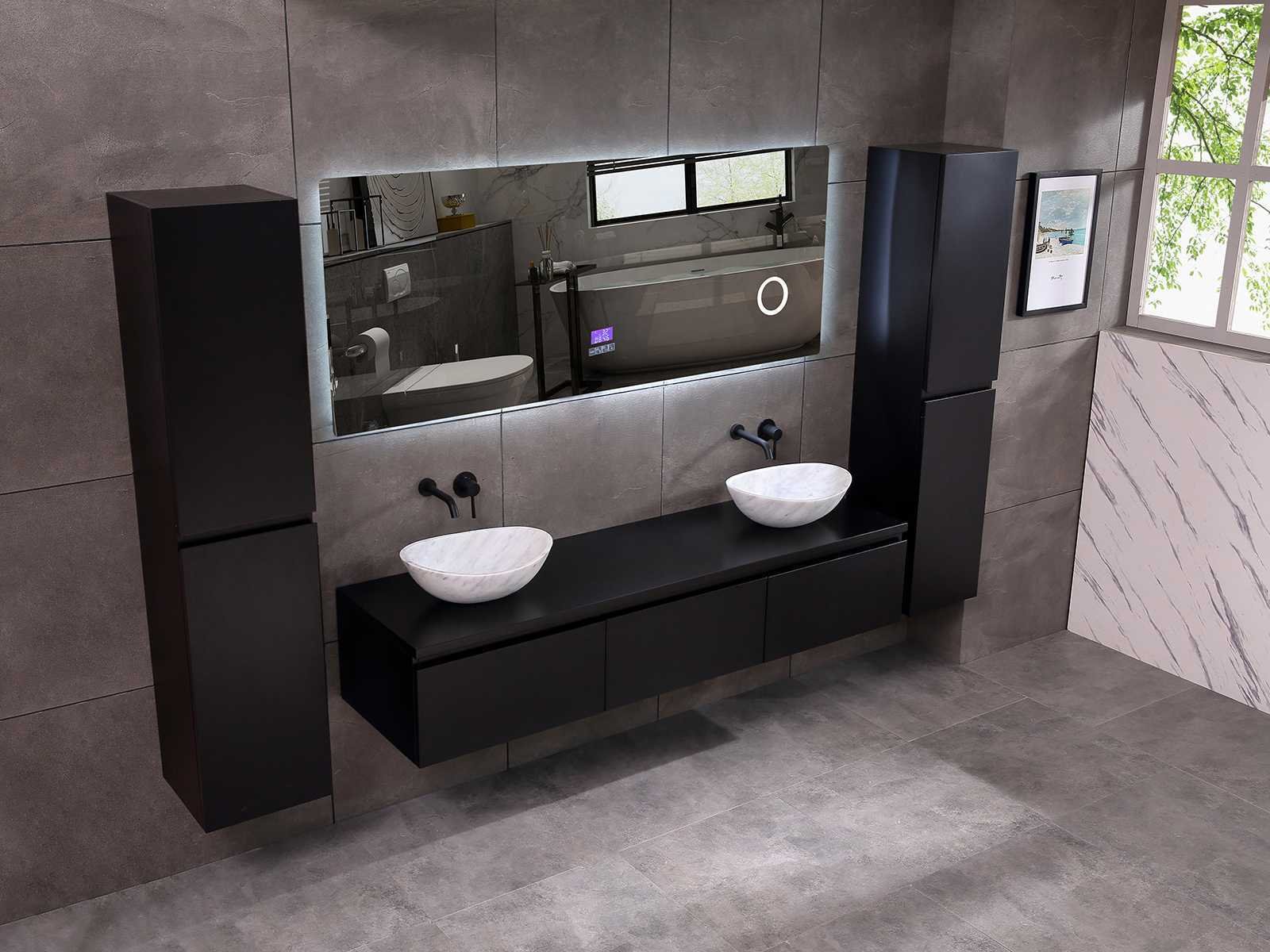Afmeting meubel bxdxh 150/180x50x35cm (keuze breedte 150 of 180cm graag doorgeven op de afhaaldag - hangkast 35x35x160cm (wordt met 1 hangkast geleverd), kleur mat zwart, materiaal 5-laags multiplex met 3cm eiken top(zeer sterk en vochtbestendig), Hangkast softclose deuren en extra planchets (hangkast kan zowel links als rechts van het meubel worden gehangen), kranen exclusief , Lades 3 stuks met softclose, Wasbakken solid surface, natuursteen of italiaans marmer (keuze uit diverse modellen van de laatste 3 foto's, graag keuze doormailen op info@mawialux.nl), spiegel met verwarming/bluetooth/radio/klok en vergrootglas met ledverlichting rondom aan de achterkant met 3 verstelbare kleuren led 3000/4500/6000k led-dioden (geel/blauw/wit licht) met de volgende opties: digitaal display, geïntegreerde vergrotingsspiegel van 10cm doorsnede met ledverlichting(vergroot 3x), bluetooth met speaker, digitale klok, digitale temperatuur aanduiding, 220volt stekker(plug and play), verwarming ter voorkoming van condens, 1.5mm kopervrij met explosion-proof laag met dezelfde functie als gehard glas , afvoeren exclusief, Conditie: Nieuw in doos, Bijzonderheden 2 jaar garantie, gaten zijn niet in het topblad voorgeboord zodat u zowel muurkranen als kranen vanaf het blad kunt gebruiken of zelf 1 wastafel in plaats van 2 stuks(gaten boren door een installateur is zelf gemakkelijk uit te voeren), compleet met installatie materiaal, zeer hoge kwaliteit, let op! de hangkast mag geruild worden voor een set kranen en popup afvoeren naar keus of als u een extra hangkast nodig graag op de afhaaldag aangeven voor een passende aanbieding Merk: Mawialux Model: Jeremy Hoogte: 35cm Lengte: 50cm Breedte: 150-180cm Materiaal: 5-laags multiplex met 3cm massief top(zeer sterk en vochtbestendig) Kleur: mat zwart Kraan: exclusief Waskom: Diverse keuzes Spiegel met verlichting: ja Verlichting: ja Onderkast: ja Lades: 3 Softclose: true Bevestigingsmateriaal: true Zijkast: ja 1x