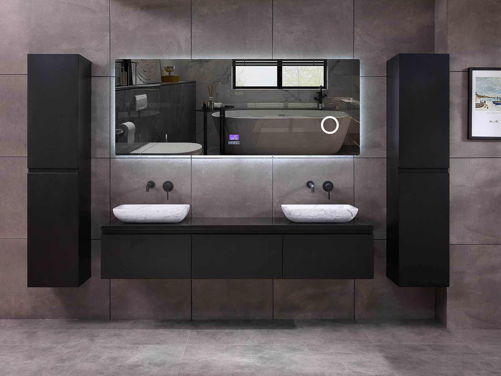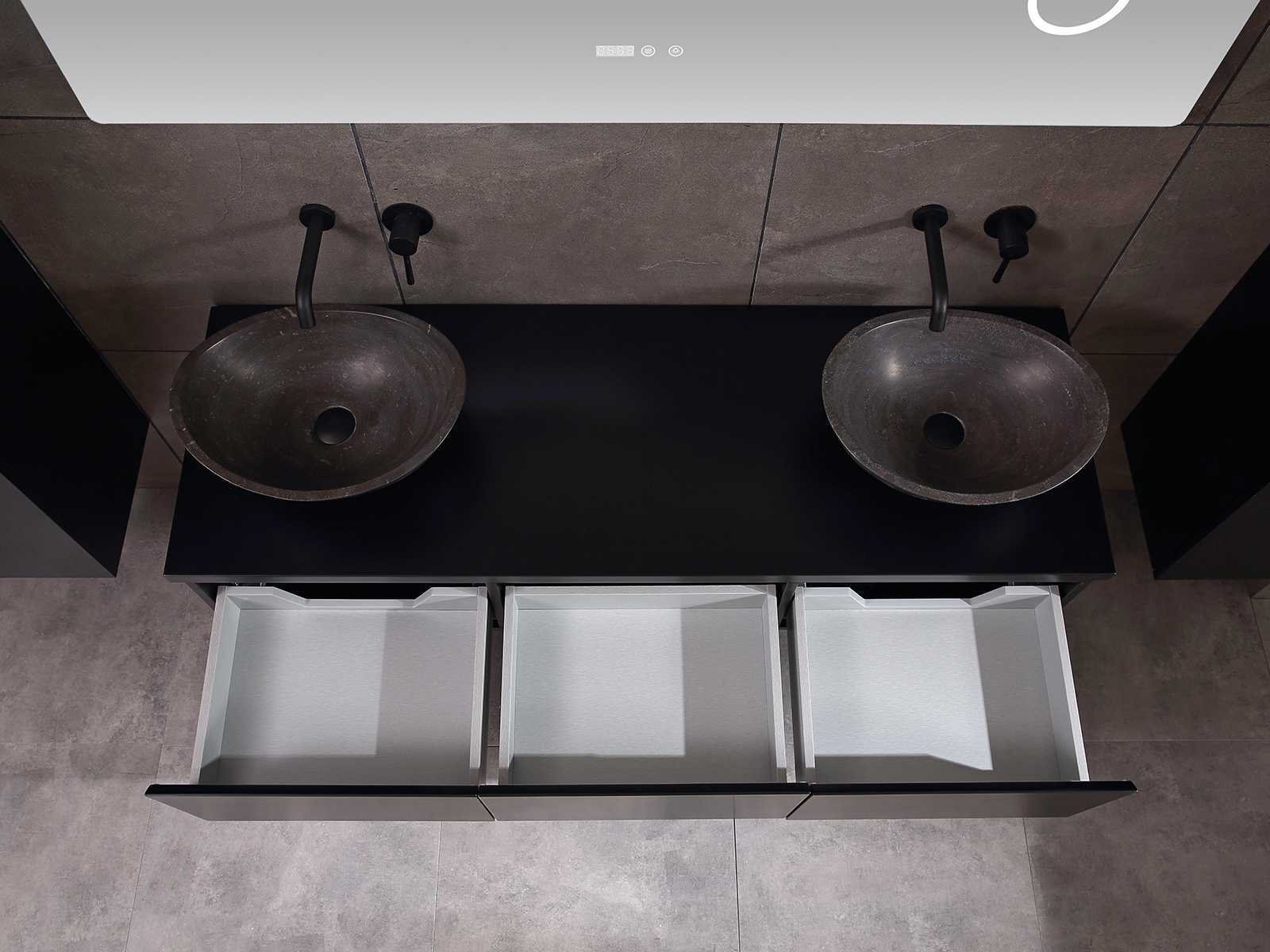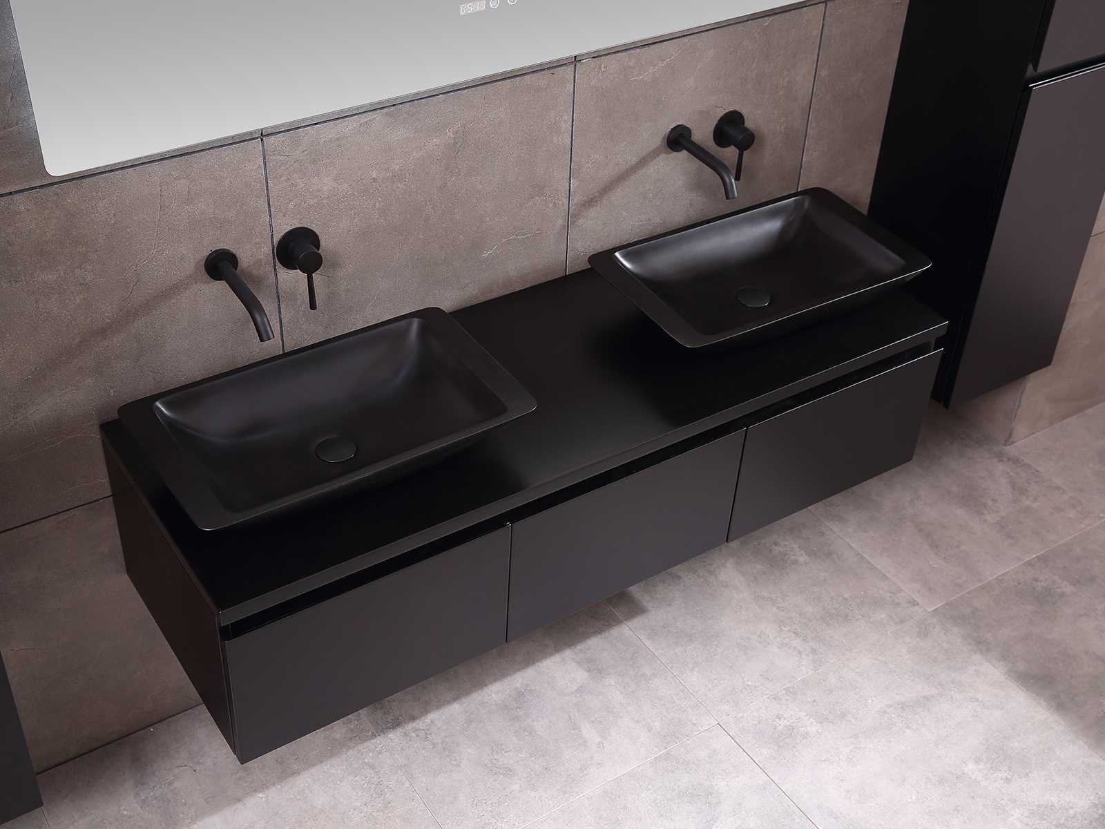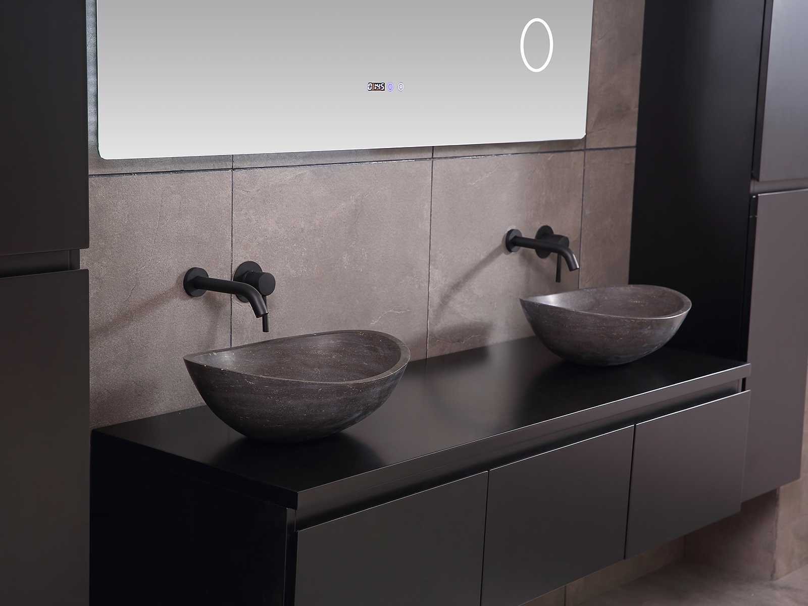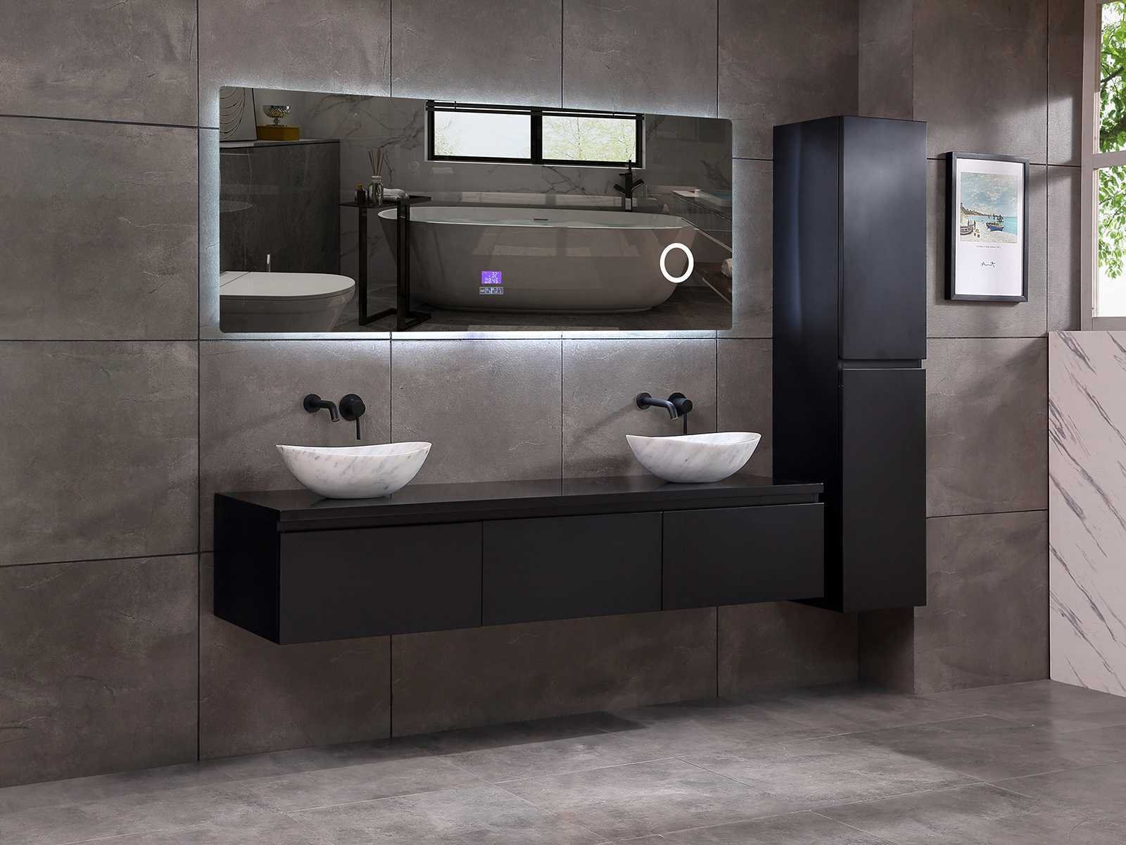 Afmeting meubel bxdxh 150/180x50x35cm (keuze breedte 150 of 180cm graag doorgeven op de afhaaldag - hangkast 35x35x160cm (wordt met 1 hangkast geleverd), kleur mat zwart, materiaal 5-laags multiplex met 3cm eiken top(zeer sterk en vochtbestendig), Hangkast softclose deuren en extra planchets (hangkast kan zowel links als rechts van het meubel worden gehangen), kranen exclusief , Lades 3 stuks met softclose, Wasbakken solid surface, natuursteen of italiaans marmer (keuze uit diverse modellen van de laatste 3 foto's, graag keuze doormailen op info@mawialux.nl), spiegel met verwarming/bluetooth/radio/klok en vergrootglas met ledverlichting rondom aan de achterkant met 3 verstelbare kleuren led 3000/4500/6000k led-dioden (geel/blauw/wit licht) met de volgende opties: digitaal display, geïntegreerde vergrotingsspiegel van 10cm doorsnede met ledverlichting(vergroot 3x), bluetooth met speaker, digitale klok, digitale temperatuur aanduiding, 220volt stekker(plug and play), verwarming ter voorkoming van condens, 1.5mm kopervrij met explosion-proof laag met dezelfde functie als gehard glas , afvoeren exclusief, Conditie: Nieuw in doos, Bijzonderheden 2 jaar garantie, gaten zijn niet in het topblad voorgeboord zodat u zowel muurkranen als kranen vanaf het blad kunt gebruiken of zelf 1 wastafel in plaats van 2 stuks(gaten boren door een installateur is zelf gemakkelijk uit te voeren), compleet met installatie materiaal, zeer hoge kwaliteit, let op! de hangkast mag geruild worden voor een set kranen en popup afvoeren naar keus of als u een extra hangkast nodig graag op de afhaaldag aangeven voor een passende aanbieding Merk: Mawialux Model: Jeremy Hoogte: 35cm Lengte: 50cm Breedte: 150-180cm Materiaal: 5-laags multiplex met 3cm massief top(zeer sterk en vochtbestendig) Kleur: mat zwart Kraan: exclusief Waskom: Diverse keuzes Spiegel met verlichting: ja Verlichting: ja Onderkast: ja Lades: 3 Softclose: true Bevestigingsmateriaal: true Zijkast: ja 1x