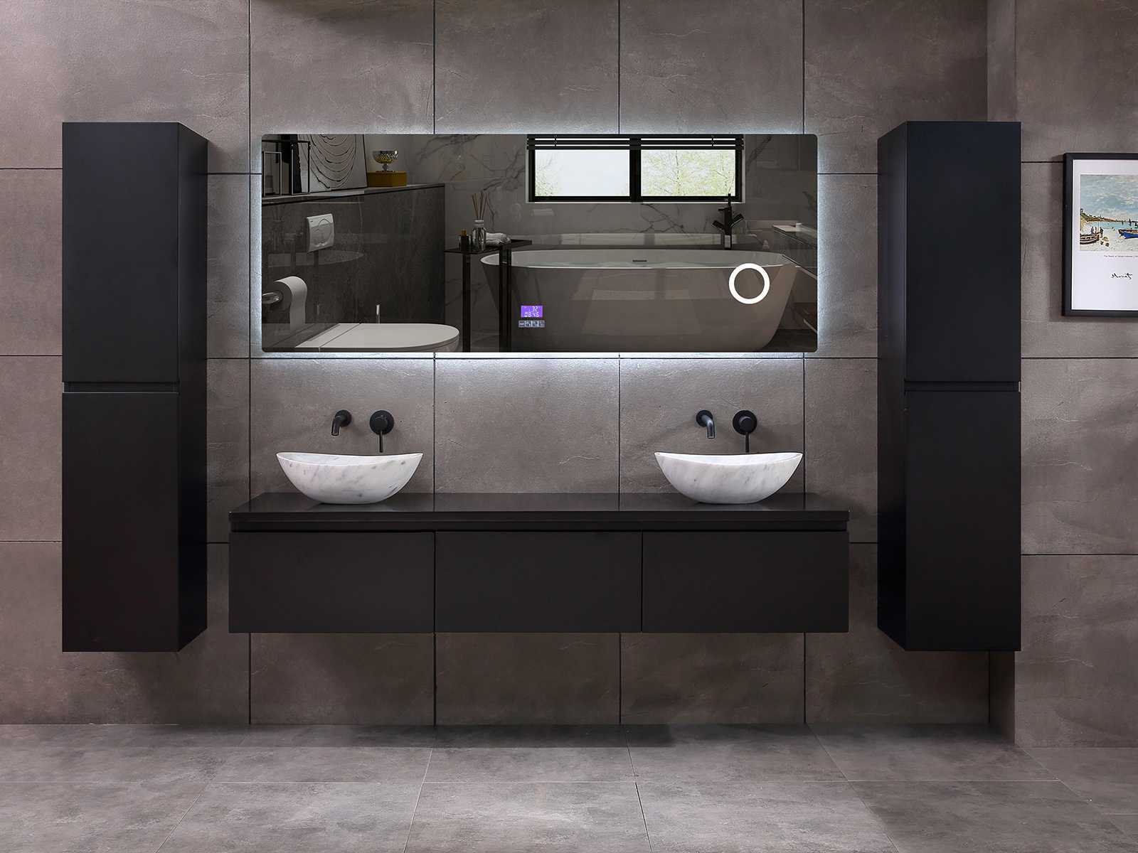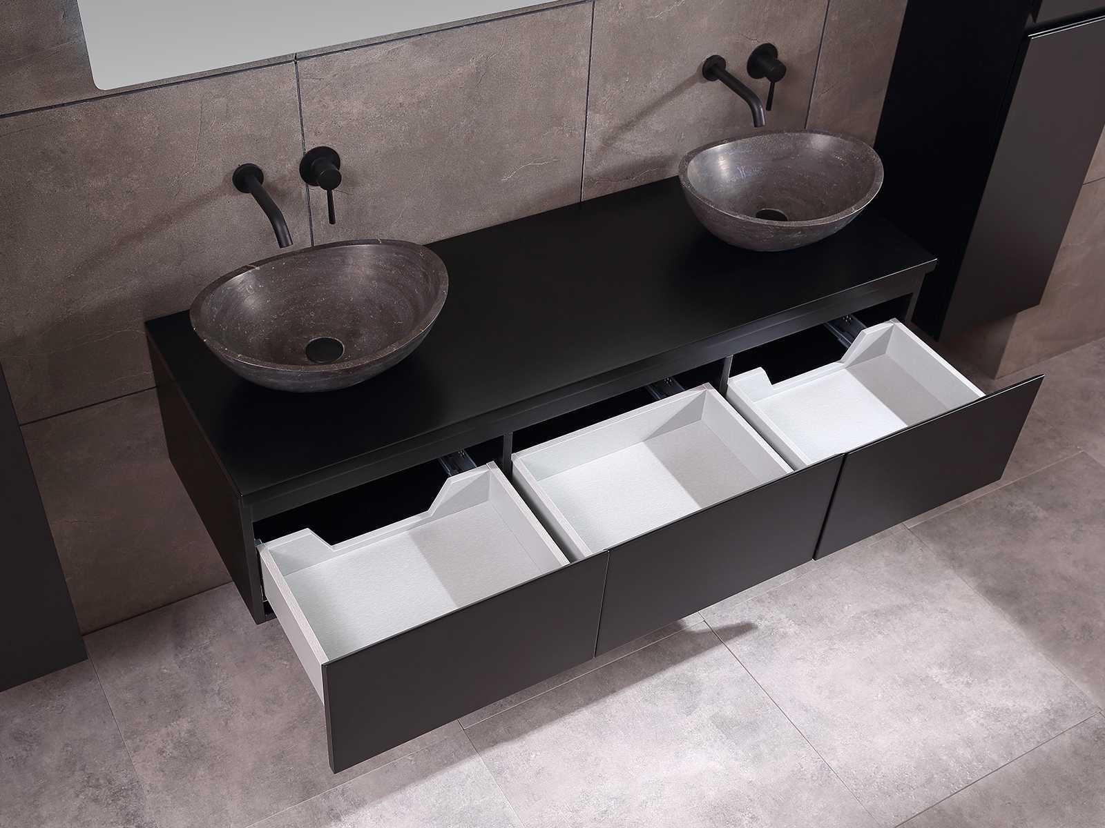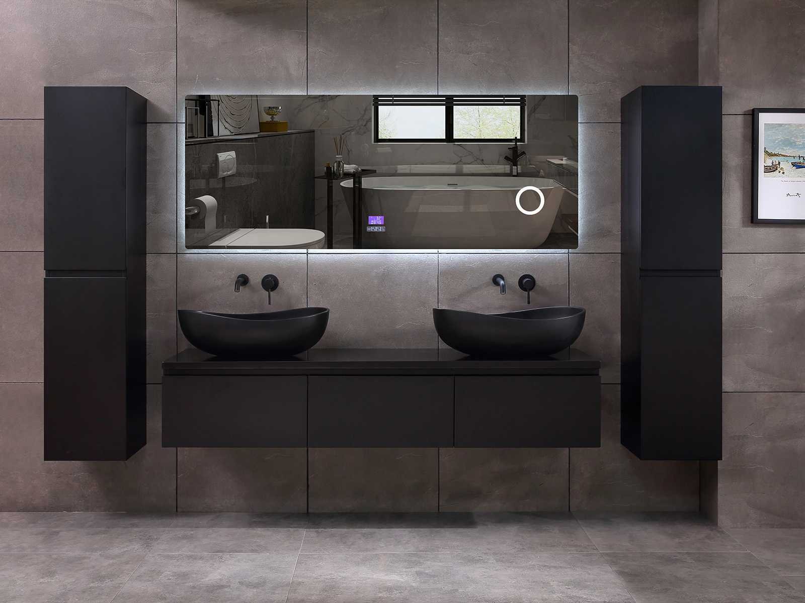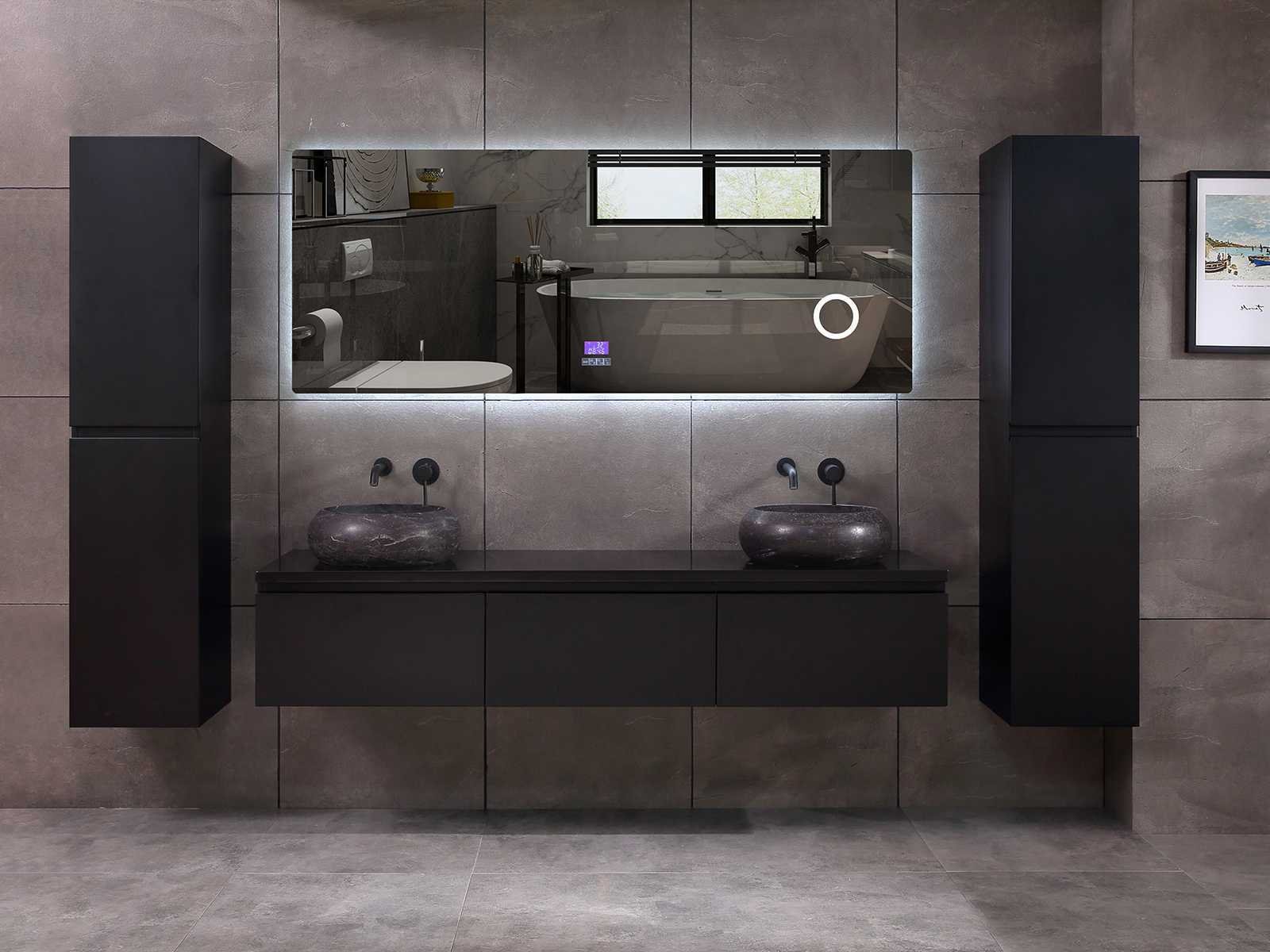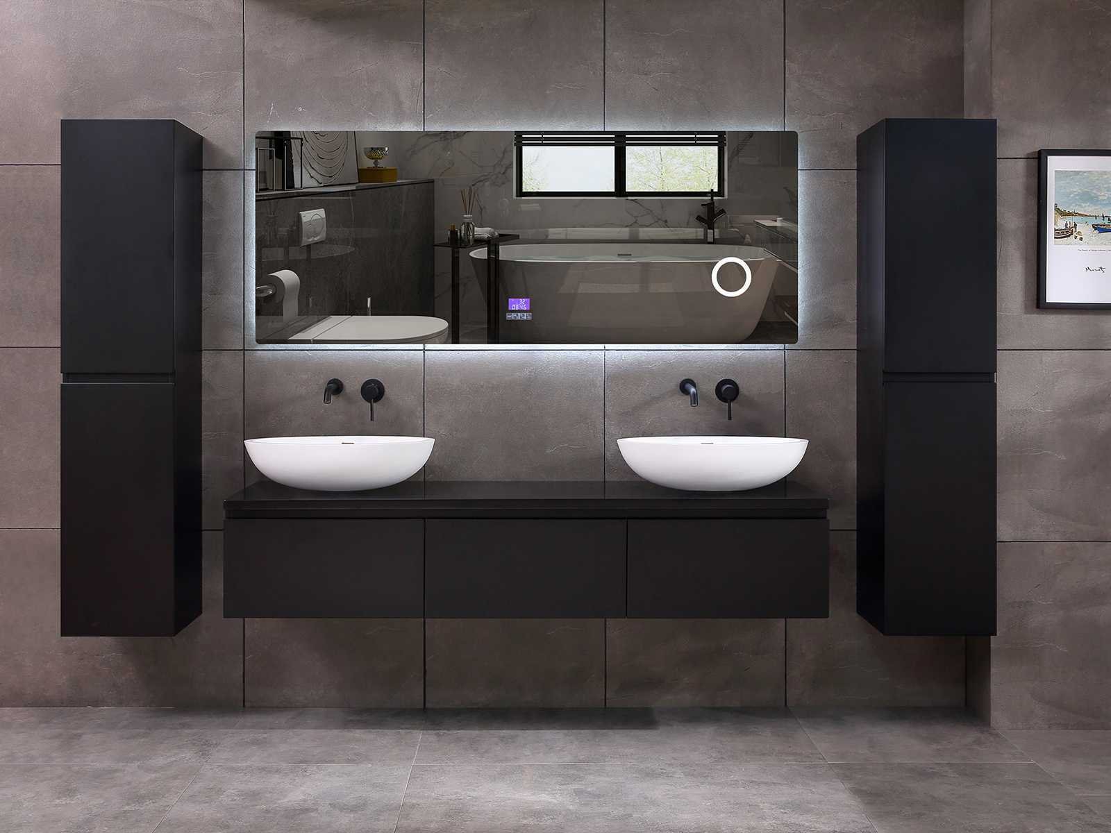 Afmeting meubel bxdxh 150/180x50x35cm (keuze breedte 150 of 180cm graag doorgeven op de afhaaldag - hangkast 35x35x160cm (wordt met 1 hangkast geleverd), kleur mat zwart, materiaal 5-laags multiplex met 3cm eiken top(zeer sterk en vochtbestendig), Hangkast softclose deuren en extra planchets (hangkast kan zowel links als rechts van het meubel worden gehangen), kranen exclusief , Lades 3 stuks met softclose, Wasbakken solid surface, natuursteen of italiaans marmer (keuze uit diverse modellen van de laatste 3 foto's, graag keuze doormailen op info@mawialux.nl), spiegel met verwarming/bluetooth/radio/klok en vergrootglas met ledverlichting rondom aan de achterkant met 3 verstelbare kleuren led 3000/4500/6000k led-dioden (geel/blauw/wit licht) met de volgende opties: digitaal display, geïntegreerde vergrotingsspiegel van 10cm doorsnede met ledverlichting(vergroot 3x), bluetooth met speaker, digitale klok, digitale temperatuur aanduiding, 220volt stekker(plug and play), verwarming ter voorkoming van condens, 1.5mm kopervrij met explosion-proof laag met dezelfde functie als gehard glas , afvoeren exclusief, Conditie: Nieuw in doos, Bijzonderheden 2 jaar garantie, gaten zijn niet in het topblad voorgeboord zodat u zowel muurkranen als kranen vanaf het blad kunt gebruiken of zelf 1 wastafel in plaats van 2 stuks(gaten boren door een installateur is zelf gemakkelijk uit te voeren), compleet met installatie materiaal, zeer hoge kwaliteit, let op! de hangkast mag geruild worden voor een set kranen en popup afvoeren naar keus of als u een extra hangkast nodig graag op de afhaaldag aangeven voor een passende aanbieding Merk: Mawialux Model: Jeremy Hoogte: 35cm Lengte: 50cm Breedte: 150-180cm Materiaal: 5-laags multiplex met 3cm massief top(zeer sterk en vochtbestendig) Kleur: mat zwart Kraan: exclusief Waskom: Diverse keuzes Spiegel met verlichting: ja Verlichting: ja Onderkast: ja Lades: 3 Softclose: true Bevestigingsmateriaal: true Zijkast: ja 1x