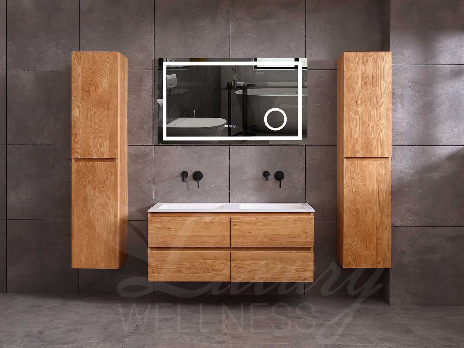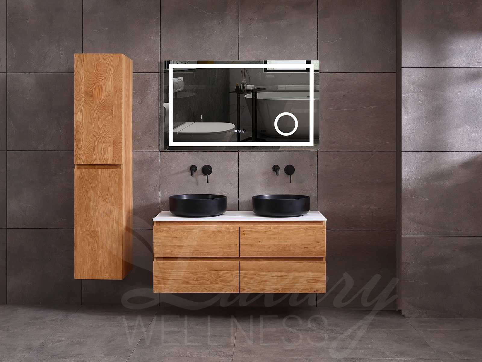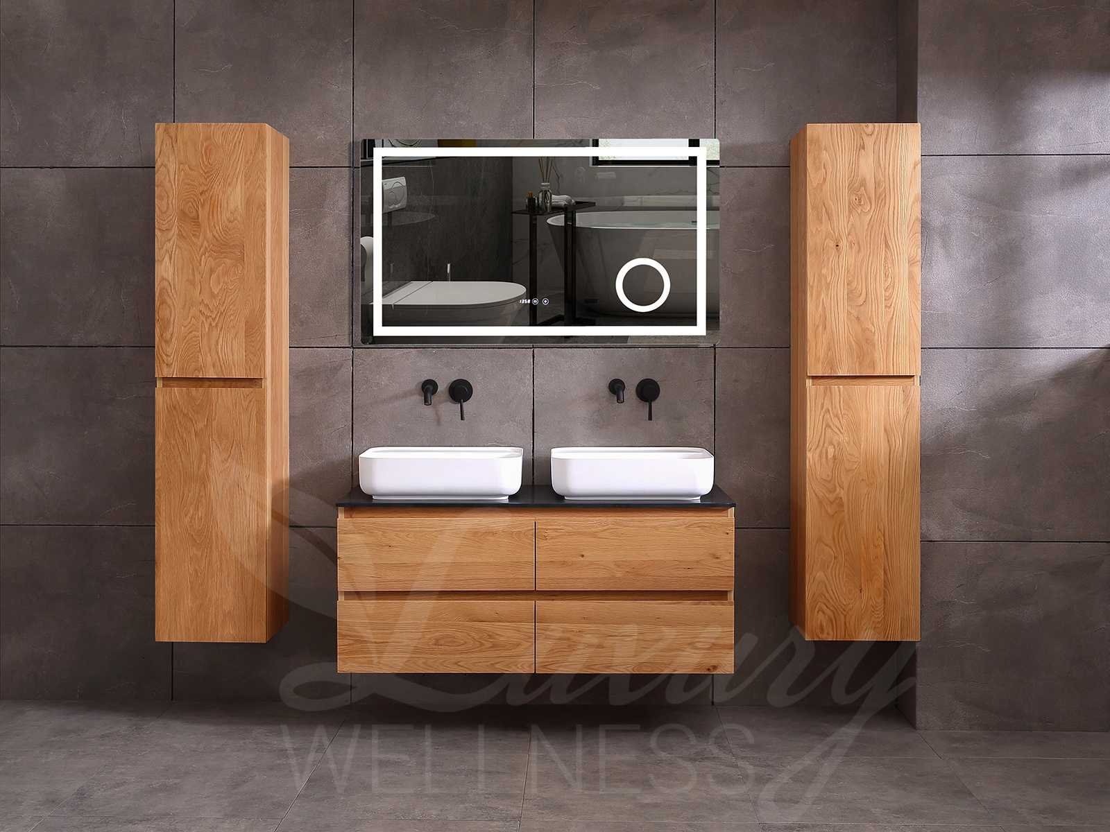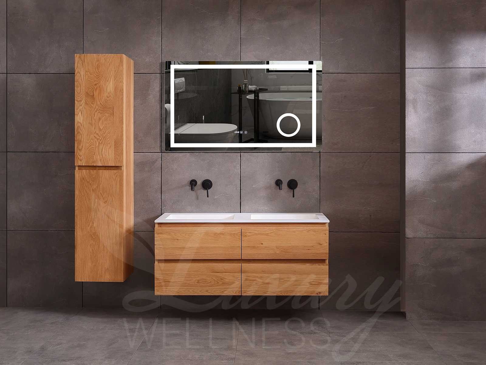 Afmeting meubel bxdxh 120x49x50cm - hangkast 40x28x168cm (1 hangkast zit bij de aankoop), kleur eiken natural, materiaal 2cm massief eiken (front) en 5-laags multiplex(zeer sterk en vochtbestendig) met solid surface topplaat indien gewenst(mat wit of mat zwart), Hangkast softclose deuren en extra planchets (hangkast is universeel en kan zowel links als rechts naast het meubel gehangen worden), kranen exclusief , Lades 4 stuks met softclose, Wasbakken solid surface, natuursteen(met en zonder kraangaten beschikbaar de vaste wastafels) of italiaans marmer (keuze uit diverse modellen en kleuren van de laatste foto's graag doorgeven per email op info@mawialux.nl), led spiegel met verwarming en ledverlichting met 3 verstelbare kleuren led 3000/4500/6000k led-dioden (geel/blauw/wit licht), 220volt stekker(plug and play), afvoeren exclusief, Conditie: Nieuw in doos, Bijzonderheden 2 jaar garantie, gaten zijn niet in het topblad voorgeboord in u voor deze keuze gaat zodat u zowel muurkranen als kranen vanaf het blad kunt gebruiken of zelf 1 wastafel in plaats van 2 stuks(gaten boren is geen enkel probleem en zeer gemakkelijk uit te voeren bij solid surface) compleet met installatiekit, natuursteen wastafels zijn behandeld met coating, zeer hoge kwaliteit, let op! de hangkast mag geruild worden voor een set kranen en popup afvoeren naar keus of als u een extra hangkast nodig graag doorgeven per email op info@mawialux.nl voor een passende aanbieding Merk: Mawialux Model: Brandon Hoogte: 50cm Lengte: 49cm Breedte: 120cm Materiaal: Eiken Kleur: Eiken natural Kraan: exclusief Wastafel: diverse keuzes Waskom: diverse keuzes Spiegel met verlichting: ja Verlichting: ja Lades: 4 Softclose: true Bevestigingsmateriaal: true Zijkast: ja 1x