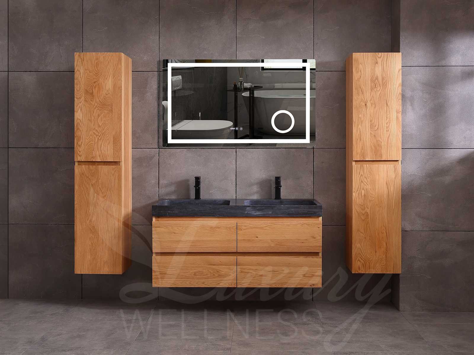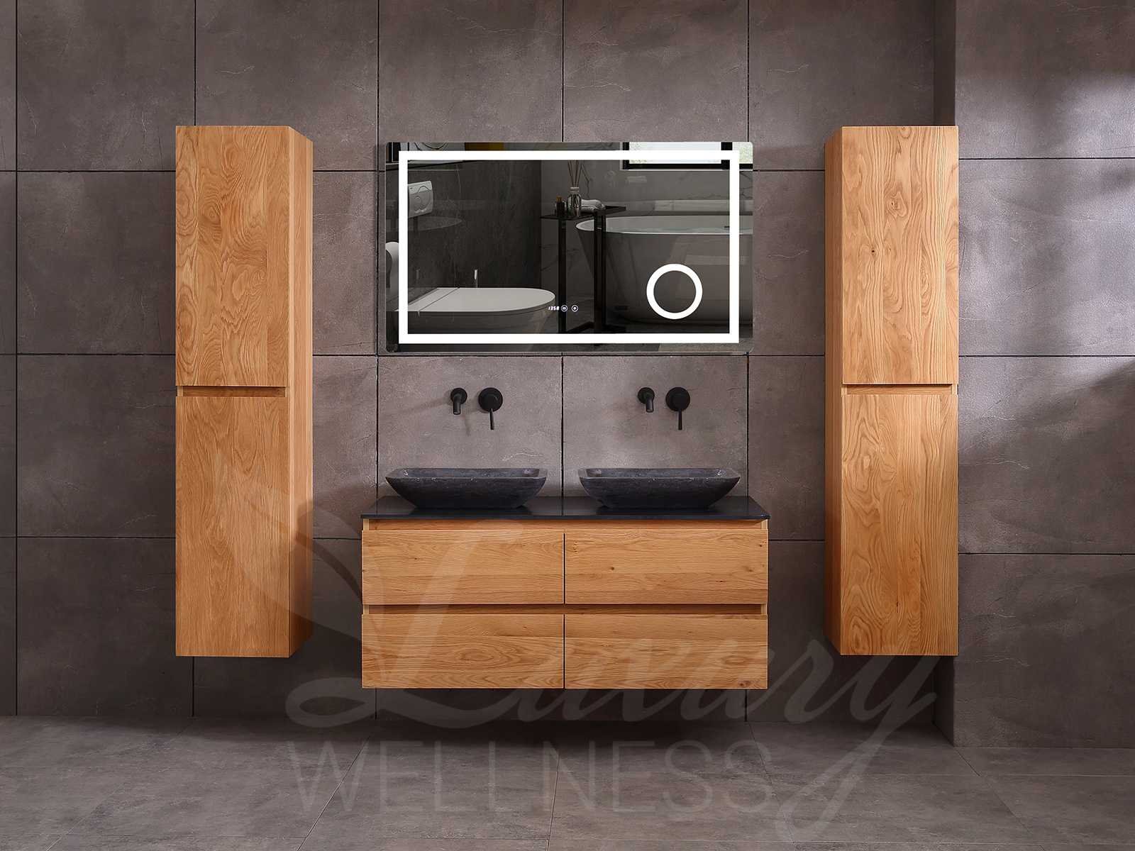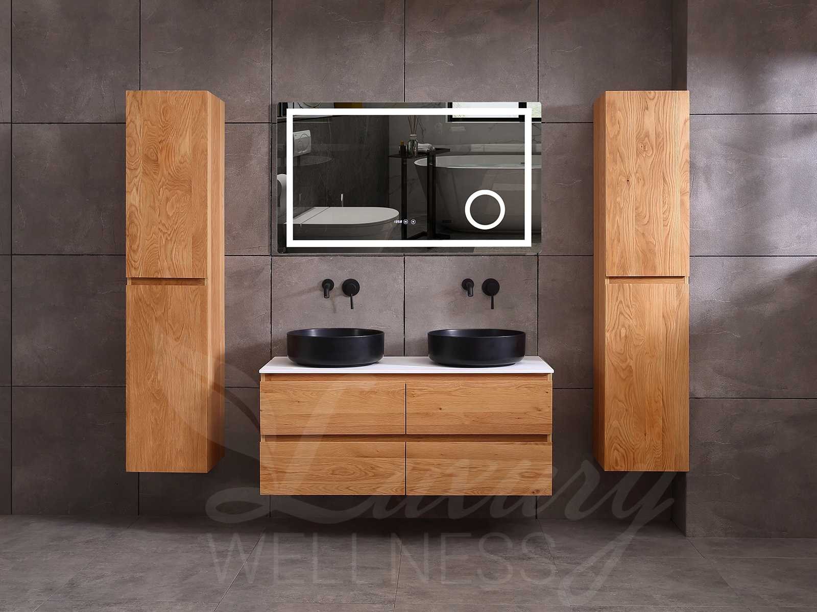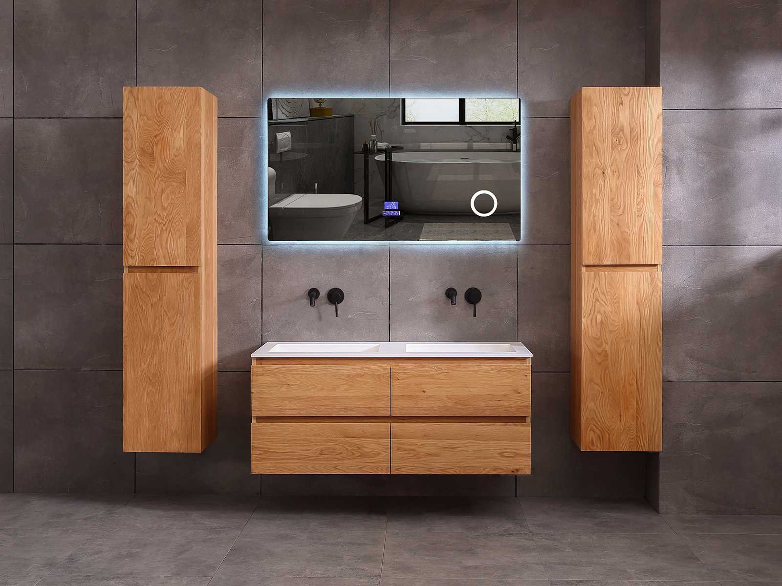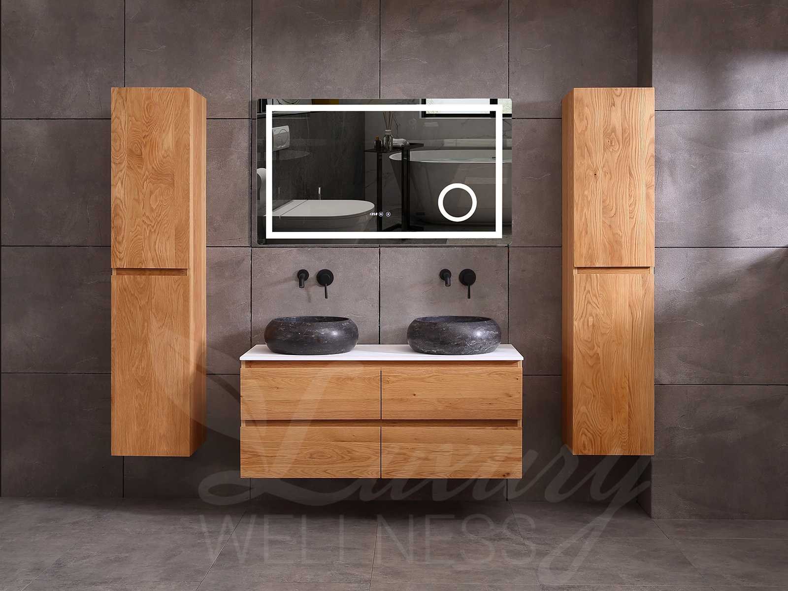 Afmeting meubel bxdxh 120x49x50cm - hangkast 40x28x168cm (1 hangkast zit bij de aankoop), kleur eiken natural, materiaal 2cm massief eiken (front) en 5-laags multiplex(zeer sterk en vochtbestendig) met solid surface topplaat indien gewenst(mat wit of mat zwart), Hangkast softclose deuren en extra planchets (hangkast is universeel en kan zowel links als rechts naast het meubel gehangen worden), kranen exclusief , Lades 4 stuks met softclose, Wasbakken solid surface, natuursteen(met en zonder kraangaten beschikbaar de vaste wastafels) of italiaans marmer (keuze uit diverse modellen en kleuren van de laatste foto's graag doorgeven per email op info@mawialux.nl), led spiegel met verwarming en ledverlichting met 3 verstelbare kleuren led 3000/4500/6000k led-dioden (geel/blauw/wit licht), 220volt stekker(plug and play), afvoeren exclusief, Conditie: Nieuw in doos, Bijzonderheden 2 jaar garantie, gaten zijn niet in het topblad voorgeboord in u voor deze keuze gaat zodat u zowel muurkranen als kranen vanaf het blad kunt gebruiken of zelf 1 wastafel in plaats van 2 stuks(gaten boren is geen enkel probleem en zeer gemakkelijk uit te voeren bij solid surface) compleet met installatiekit, natuursteen wastafels zijn behandeld met coating, zeer hoge kwaliteit, let op! de hangkast mag geruild worden voor een set kranen en popup afvoeren naar keus of als u een extra hangkast nodig graag doorgeven per email op info@mawialux.nl voor een passende aanbieding Merk: Mawialux Model: Brandon Hoogte: 50cm Lengte: 49cm Breedte: 120cm Materiaal: Eiken Kleur: Eiken natural Kraan: exclusief Wastafel: diverse keuzes Waskom: diverse keuzes Spiegel met verlichting: ja Verlichting: ja Lades: 4 Softclose: true Bevestigingsmateriaal: true Zijkast: ja 1x
