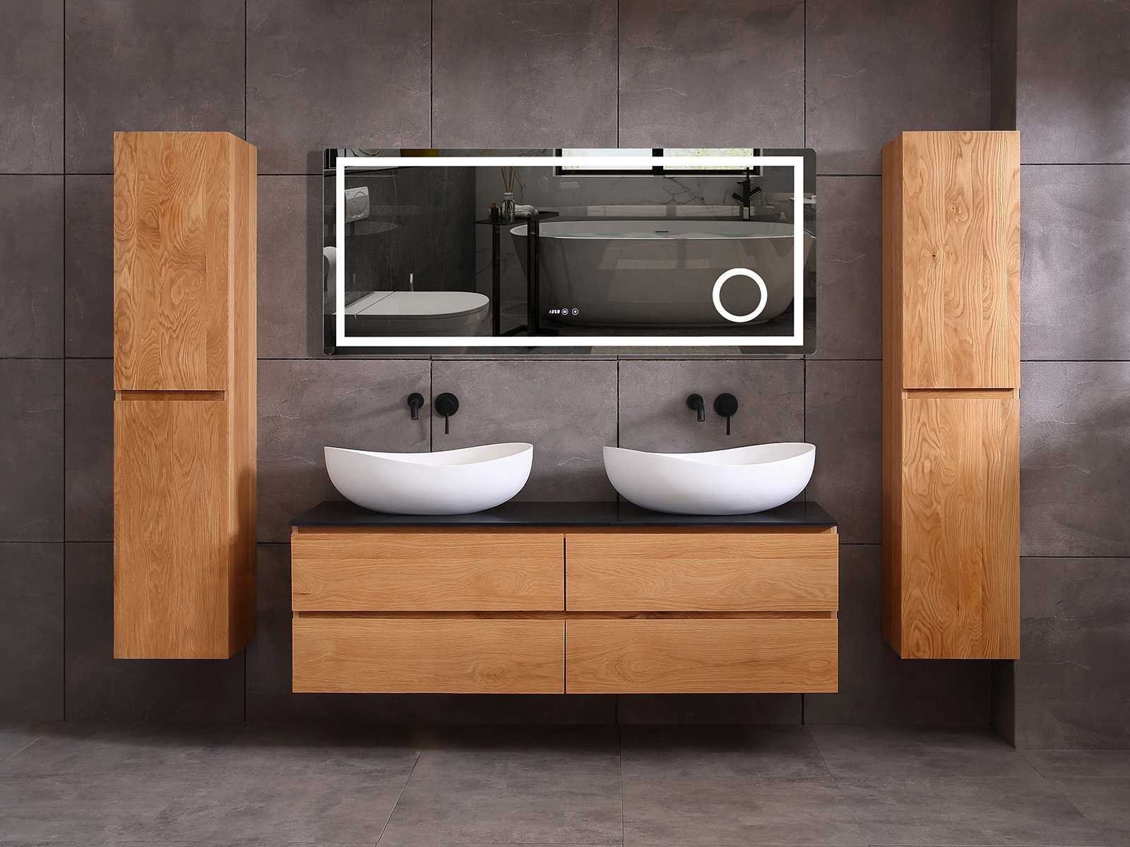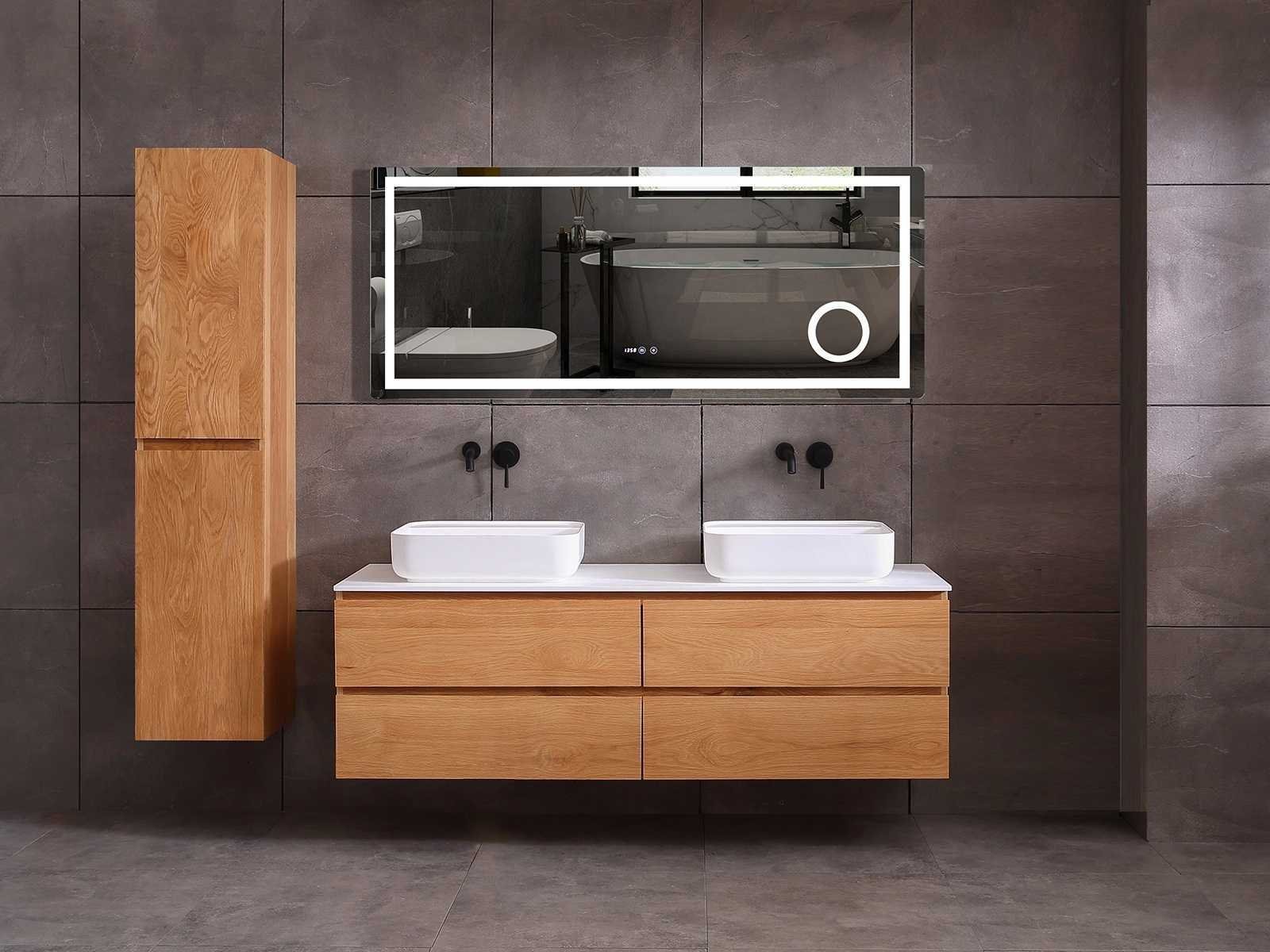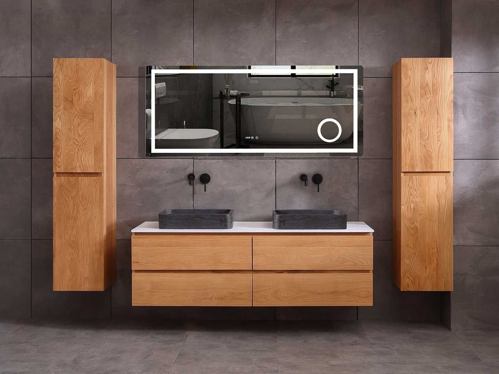 Afmeting meubel bxdxh 160x49x50cm - hangkast 35x35x160cm (1 hangkast zit bij de aankoop), kleur eiken natural, materiaal 2cm massief eiken (front) en 5-laags multiplex(zeer sterk en vochtbestendig) met solid surface topplaat indien gewenst(mat wit of mat zwart), Hangkast softclose deuren en extra planchets (hangkast is universeel en kan zowel links als rechts naast het meubel gehangen worden), kranen exclusief , Lades 4 stuks met softclose, Wasbakken solid surface, natuursteen(met en zonder kraangaten beschikbaar de vaste wastafels) of italiaans marmer (keuze uit diverse modellen en kleuren van de laatste foto's graag aangeven per email op info@mawialux.nl), led spiegel met verwarming/radio/klok en vergrootglas met ledverlichting rondom aan de voorkant met 3 verstelbare kleuren led 3000/4500/6000k led-dioden (geel/blauw/wit licht) met de volgende opties digitaal display, geïntegreerde vergrotingsspiegel van 10cm doorsnede met ledverlichting(vergroot 3x), digitale klok, digitale temperatuur aanduiding, 220volt stekker(plug and play), afvoeren exclusief, Conditie: Nieuw in doos, Bijzonderheden 2 jaar garantie, gaten zijn niet in het topblad voorgeboord in u voor deze keuze gaat zodat u zowel muurkranen als kranen vanaf het blad kunt gebruiken of zelf 1 wastafel in plaats van 2 stuks(gaten boren is geen enkel probleem en zeer gemakkelijk uit te voeren bij solid surface) compleet met installatiekit, natuursteen wastafels zijn behandeld met coating, zeer hoge kwaliteit, let op! de hangkast mag geruild worden voor een set kranen en popup afvoeren naar keus of als u een extra hangkast nodig graag per email aangeven voor een passende aanbieding Merk: Mawialux Model: Brandon Hoogte: 50cm Lengte: 49cm Breedte: 160cm Materiaal: Eiken Kleur: Eiken natural Kraan: exclusief Wastafel: diverse keuzes Waskom: diverse keuzes Spiegel met verlichting: ja Verlichting: ja Lades: 4 Softclose: true Bevestigingsmateriaal: true Zijkast: ja 1x