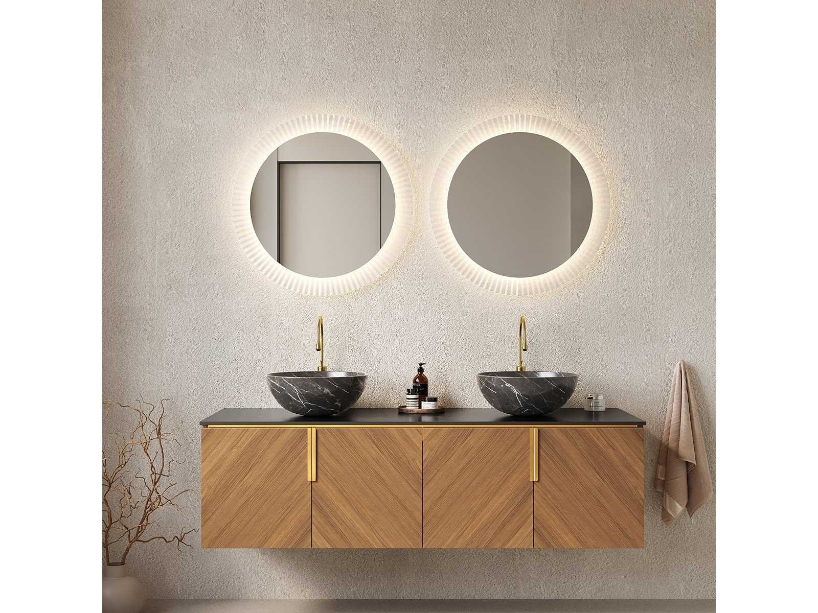 Verticaal ribbel structuur in het hout visgraad gelegd, RVS gouden deurgrepen, 5-laags multiplex met melamine toplaag(zeer sterk en vochtbestendig), topblad van sintered stone (met voorgeboorde gaten), hangkast 2 softclose deuren en extra planchets (hangkast is universeel en kan zowel links als rechts naast het meubel gehangen worden), Kranen en afvoeren exclusief, Lade(s) met softclose, standaard geleverd met de 2x de marmer zwarte wastafels welke op de afbeeldingen staan (tegen meerprijs wastafel s van natuursteen of solid surface (keuze uit diverse modellen van de laatste foto's (keuze graag aangeven per email op info@mawialux.nl of aangeven op de afhaaldag), Standaard geleverd met 2x kleine ronde spiegel in 60cm (type ivy) met ledverlichting(3000/4500/6000K led-dioden)/verwarming(anti condens), (mag ook voor een rechte spiegel geruild worden voor een ander model indien gewenst (bijvoorbeeld rond of rechthoekig) of tegen een kleine meerprijs een luxure variant met display, bluetooth en speakers, neem daarvoor contact met ons op voor een passende aanbieding op info@mawialux.nl), Conditie: Nieuw in doos, Bijzonderheden 2 jaar garantie, compleet met installatie kit, zeer hoge kwaliteit, Extra's: de hangkast mag geruild worden voor een kraan en afvoerset naar keus(graag aangeven per email op info@mawialux.nl) of als u een extra hangkast nodig heeft kunt u ons ook mailen voor een passende aanbieding Merk: mawialux Hoogte: 40cm Lengte: 49cm Breedte: 151cm Materiaal: Multixplek met melamine toplaag Kleur: walnoot Spiegel met verlichting: ja Lades: 4 Softclose: true Bevestigingsmateriaal: true Zijkast: ja Afmeting hangkast: 66x20x75