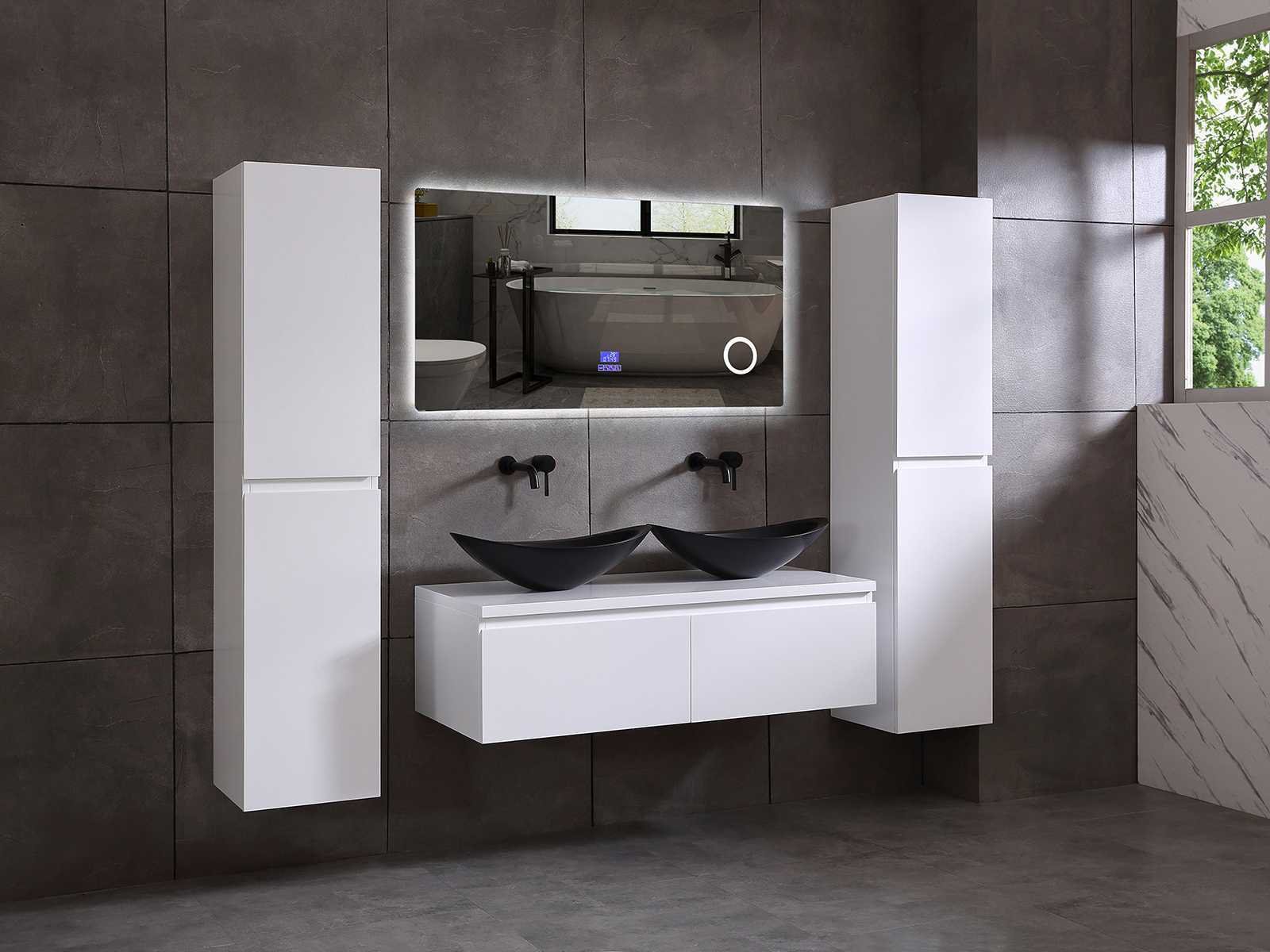 Keuze uit diverse breedte afmetingen: 80, 100, 120, 140, 150cm (breedte keuze aangeven op de afhaaldag), verwarming, bediening one-touch (voor heater, verlichting, bluetooth en instellingen), Verlichting aan de achterkant met met 3 verstelbare en dimbare kleuren LED 3000/4500/6000K LED-dioden (geel/blauw/wit licht), voorzien van digitaal display, geïntegreerde vergrotings spiegel van 10cm doorsnede met ledverlichting(vergroot 3x), bluetooth met speaker, digitale klok, digitale temperatuur aanduiding, 220volt stekker(plug and play), glas 1.5mm kopervrij met explosion-proof laag Merk: Mawialux Model: Yade Breedte: 80-150cm Hoogte: 70cm Touchscreen: true