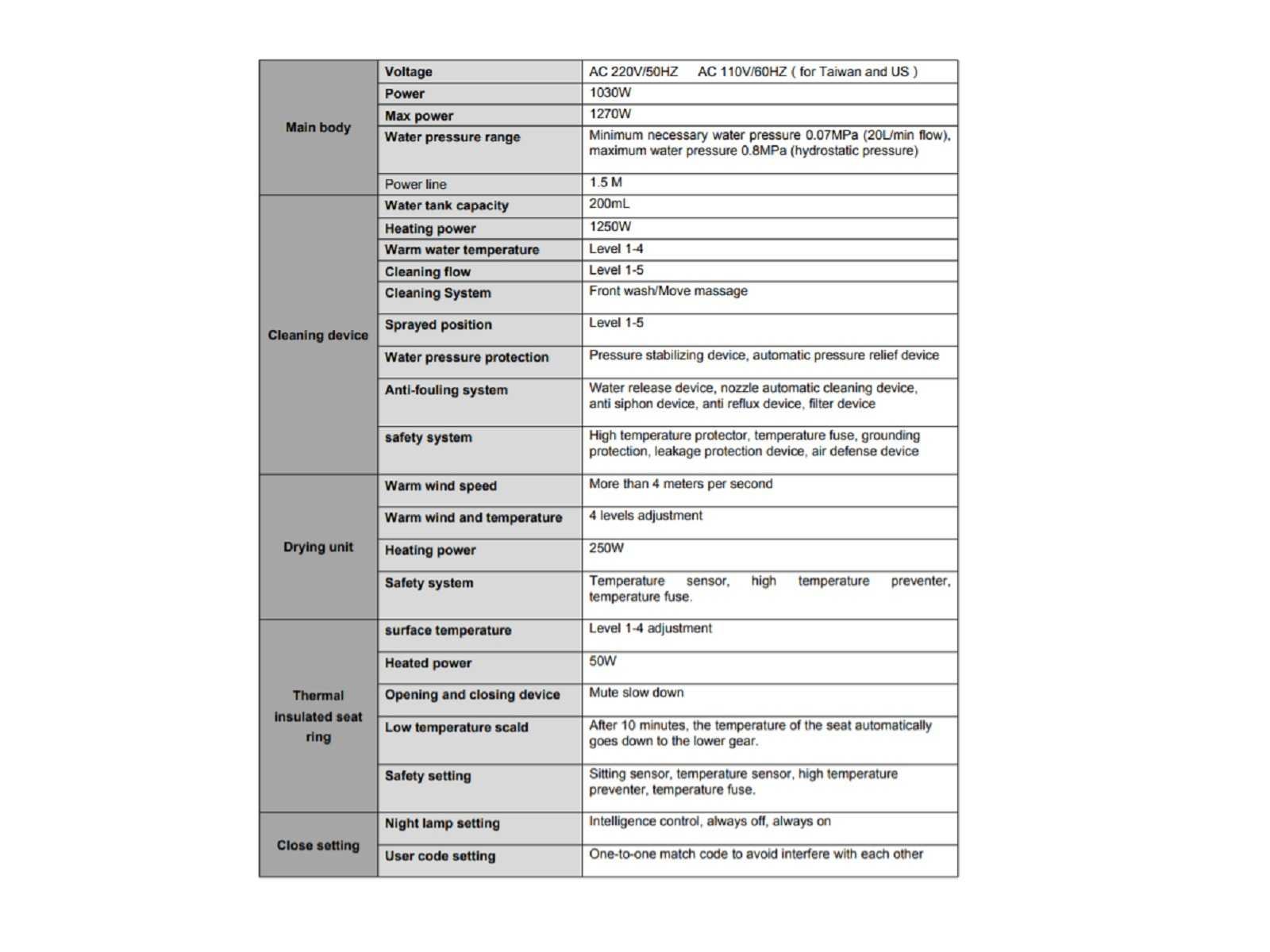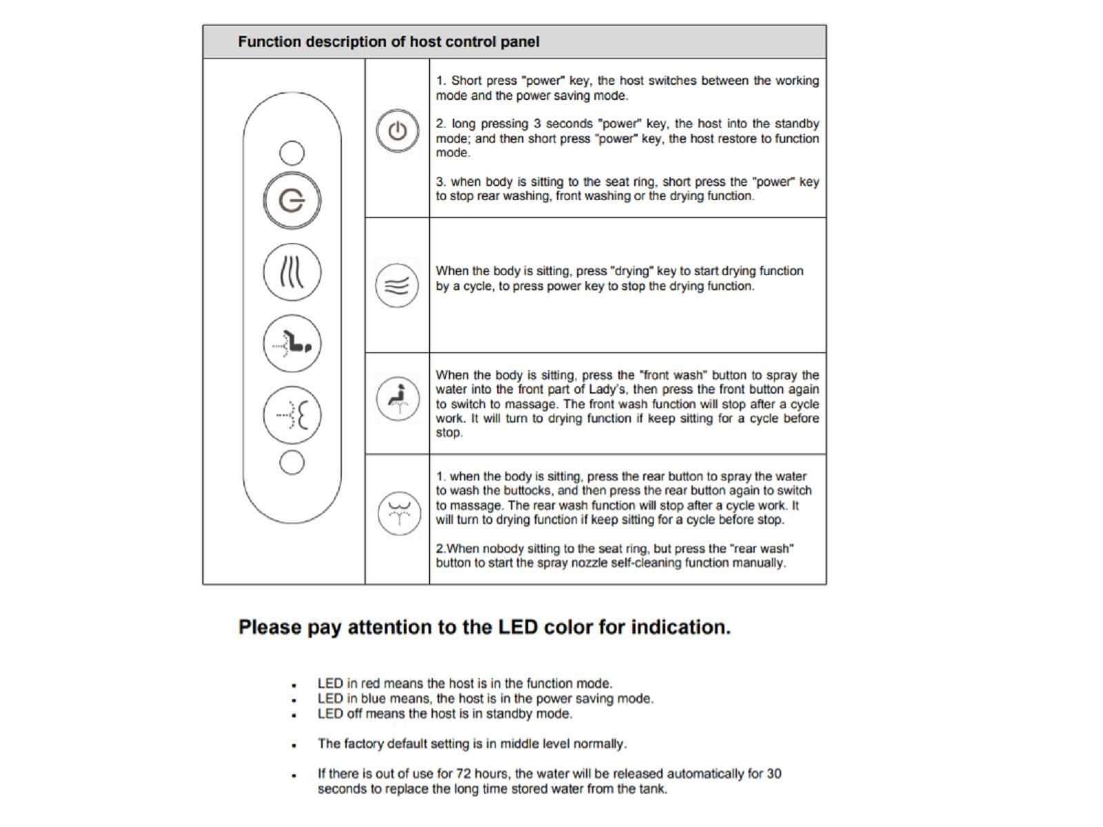 Toiletbril softclose met deksel, afvoer p-trap, diverse functies (zie foto's) waaronder toiletzit met verwarming (temperatuur instelbaar), warm water spoeling/cleaning (temperatuur instelbaar), droger (temperatuur instelbaar), waterflow en druk instelbaar, douchearm instelbaar, auto reiniger (nozzle), nozzle automatisch in-uitgaand, afstandsbediening, lekkage beveiliging, auto sensor, led nacht licht, 220v stekker, 1270 watt max, tornado rimless flushing systeem (geen spoelrand), compleet geleverd met bevestigings materiaal, universeel toepasbaar op ieder inbouwreservoir Merk: Mawialux Model: Texas Kleur: glans wit Gewicht: 30kg Lengte: 53cm Breedte: 37cm Hoogte: 36cm Materiaal: keramiek en kunststof