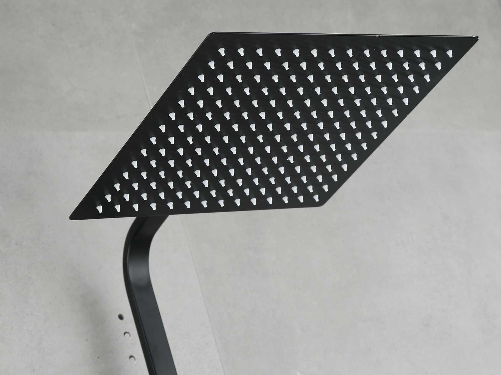 Materiaal: messing en RVS. Kraan: thermostaatkraan. Binnenwerk: keramisch. Douchekop: plat design 30 x 30 cm van RVS. Handdouche: verstelbaar met doucheslang. Hoogte: verstelbaar. Voorzien van: douchekop met kunststof wateruitlopen om gemakkelijk kalkaanslag te verwijderen. RVS douchekop en keramisch binnenwerk. Bijzonderheden: h.o.h. afstand van 150 mm (incl. s-koppelingen). Merk: Mawialux Model: Cynthia Kleur: mat zwart