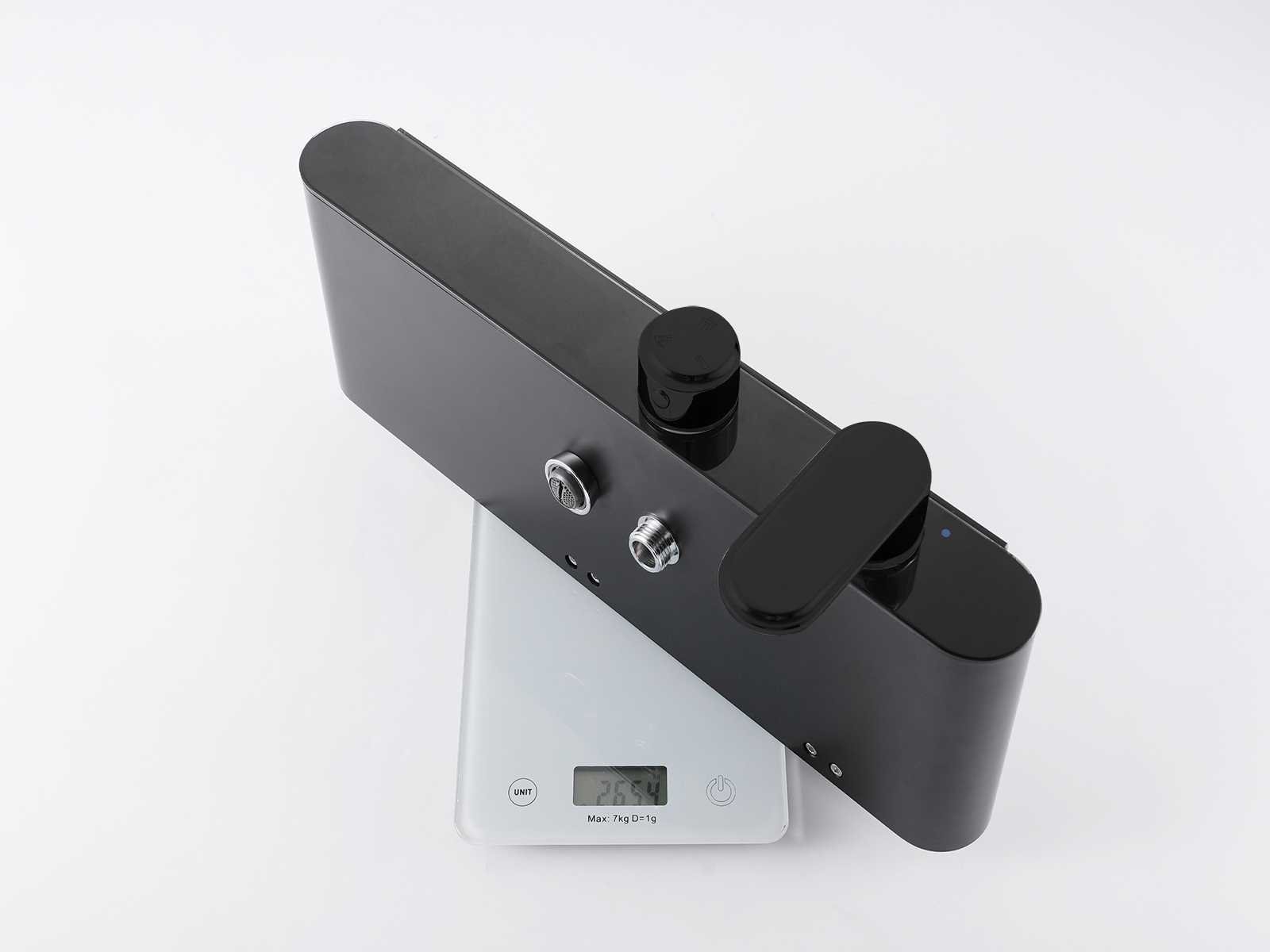 De doucheset is uitgerust met drie functies. De hoofddouche, handdouche en de baduitloop worden afzondelijk van elkaar gebruikt. Door de aanwezigheid van de baduitloop is deze doucheset uitermate geschikt voor douchebaden. Naast deze drie functies is de doucheset uitgerust met een digitaal display waarop je in een oogopslag de temperatuur van het water en de gebruiksduur kunt aflezen. Daarnaast word er gebruik gemaakt van keramische binnenwerken zodat je jarenlang plezier zult hebben van jouw regendoucheset. Doordat de doucheset in hoogte verstelbaar is past hij in vrijwel elke badkamer! Het digitale scherm word aangestuurd door de waterflow. Je hebt hier dus geen stroom voor nodig. De unit is gemaakt van 304 RVS en een gehard glazen top + front waardoor de lak niet zal beschadigen en u lang kunt genieten van de mat zwarte kleur. Hoogte: verstelbaar van 78 - 129 cm, Materiaal: 304 RVS behuizing met gehard glazen top + front en messing kraanwerk, Kraan: mengkraan, Binnenwerk: keramisch, Douchekop: 26 x 19 cm doorsnede kantel/draaibaar. Handdouche: verstelbaar, Voorzien van: digitale micromotor aansturing door middel van waterflow, Temperatuur en tijdsduur digitaal afleesbaar, Keramisch binnenwerk, Badkraan uitloop, Gehard zwart glazen planchet op bovenkant regelunit, Bijzonderheden: h.o.h. afstand van 150mm. Merk: Mawialux Model: Lava Kleur: Mat zwart