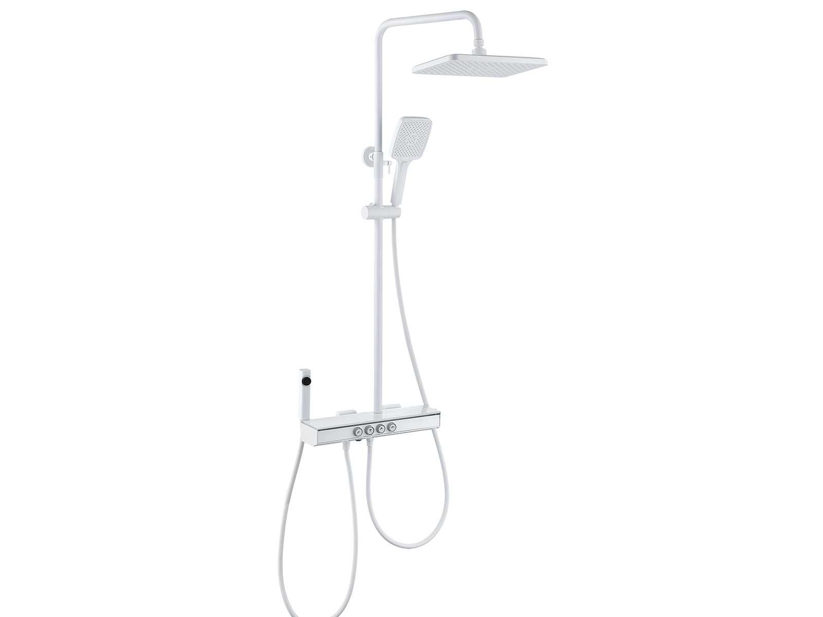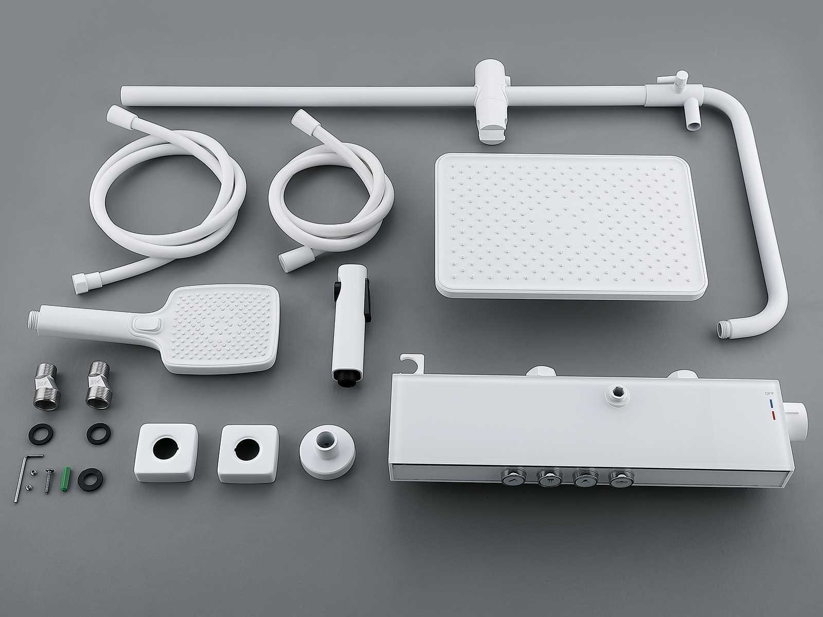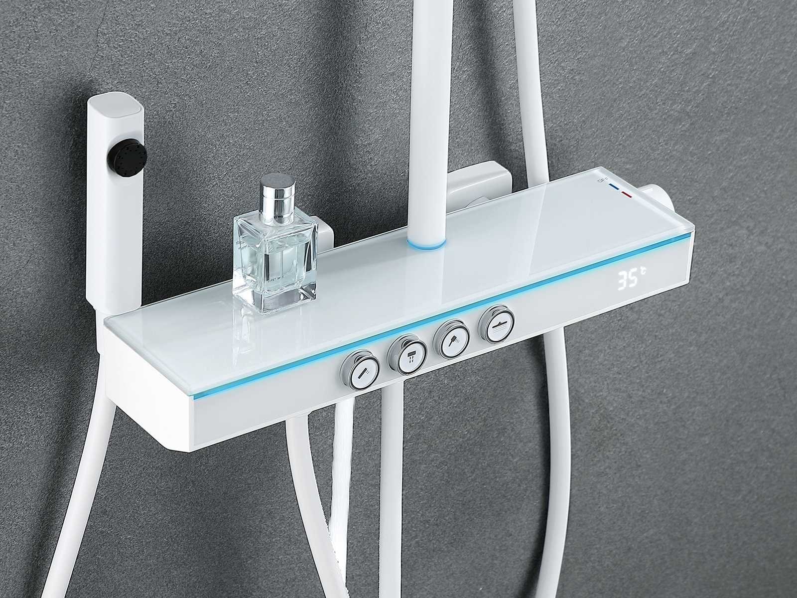 De doucheset is uitgerust met vier functies. De hoofddouche, 2x losse handdouche en badkraan uitloop. Door de aanwezigheid van de baduitloop is deze doucheset uitermate geschikt voor douchebaden. Naast deze vier functies is de doucheset uitgerust met een digitaal display waarop je in een oogopslag de temperatuur van het water kunt aflezen. Daarnaast word er gebruik gemaakt van keramische binnenwerken zodat je jarenlang plezier zult hebben van jouw regendoucheset. Doordat de doucheset in hoogte verstelbaar is past hij in vrijwel elke badkamer! Hoogte: verstelbaar 80 - 120 cm. Materiaal: RVS/messing. Kraan: mengkraan. Binnenwerk: keramisch. Douchekop: 30 x 20 cm kantel/draaibaar. Handdouche: verstelbaar met doucheslang en 2 functies. Voorzien van: digitale micromotor aansturing door middel van waterflow. Geen stroom nodig. Temperatuur en tijdsduur digitaal afleesbaar. Keramisch binnenwerk. Badkraan uitloop (waterval). Bijzonderheden: waterfuncties worden bediend door druktoetsen (meerdere functies hierdoor tegelijk mogelijk). h.o.h. afstand van 150 mm. Merk: Mawialux Model: Friso Kleur: mat wit