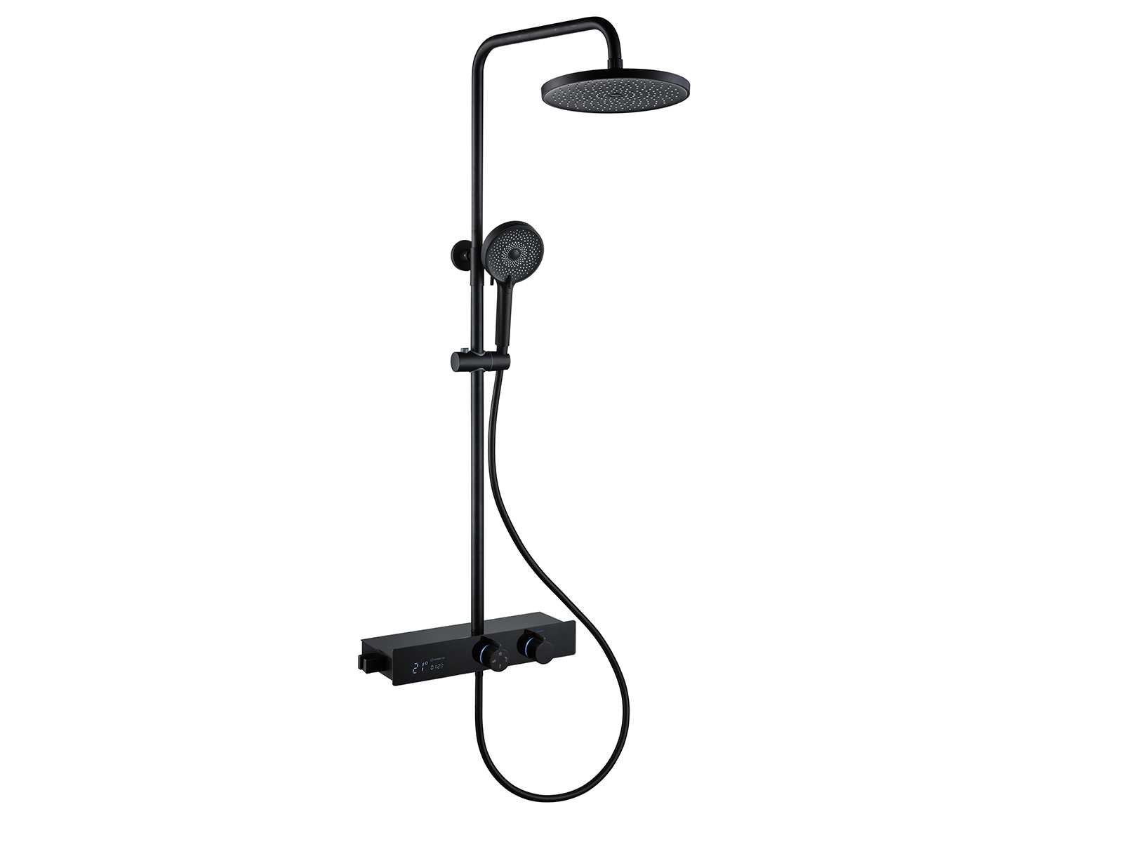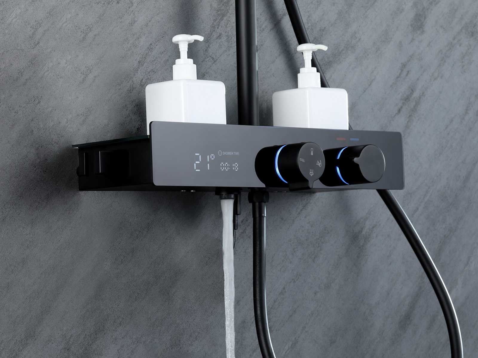 De doucheset is uitgerust met drie functies. Hoofddouche, handdouche en de baduitloop worden afzondelijk van elkaar gebruikt. Door de aanwezigheid van de baduitloop is deze doucheset uitermate geschikt voor douchebaden. Naast deze drie functies is de doucheset uitgerust met een digitaal display waarop je in een oogopslag de temperatuur van het water en de gebruiksduur kunt aflezen. Daarnaast word er gebruik gemaakt van keramische binnenwerken zodat je jarenlang plezier zult hebben van jouw regendoucheset. Doordat de doucheset in hoogte verstelbaar is past hij in vrijwel elke badkamer. Het digitale scherm word aangestuurd door de waterflow. Je hebt hier dus geen stroom voor nodig. Hoogte: verstelbaar 80 - 125 cm. Materiaal: aluminium en messing. Kleur: mat zwart. Kraan: thermostaatkraan. Binnenwerk: keramisch. Douchekop: 30 cm doorsnee. Handdouche: verstelbaar. Voorzien van: digitale micromotor aansturing door middel van waterflow, geen stroom nodig, temperatuur digitaal afleesbaar, digitale aanduiding tijdsduur, keramisch binnenwerk , baduitloop, gehard glazen front voor lange levensduur Bijzonderheden: h.o.h. afstand van 150mm. Merk: Mawialux Model: Yuri Kleur: mat zwart