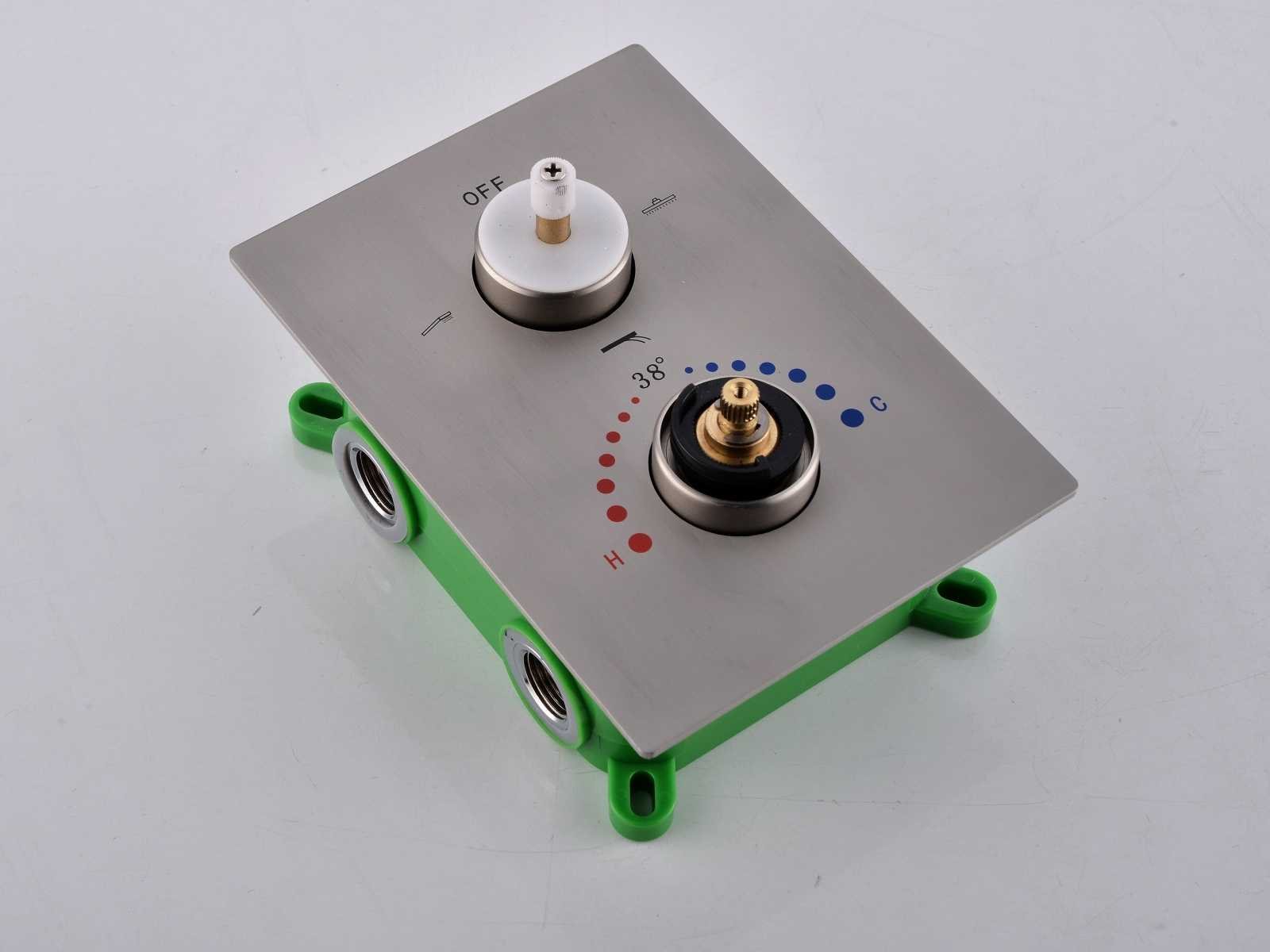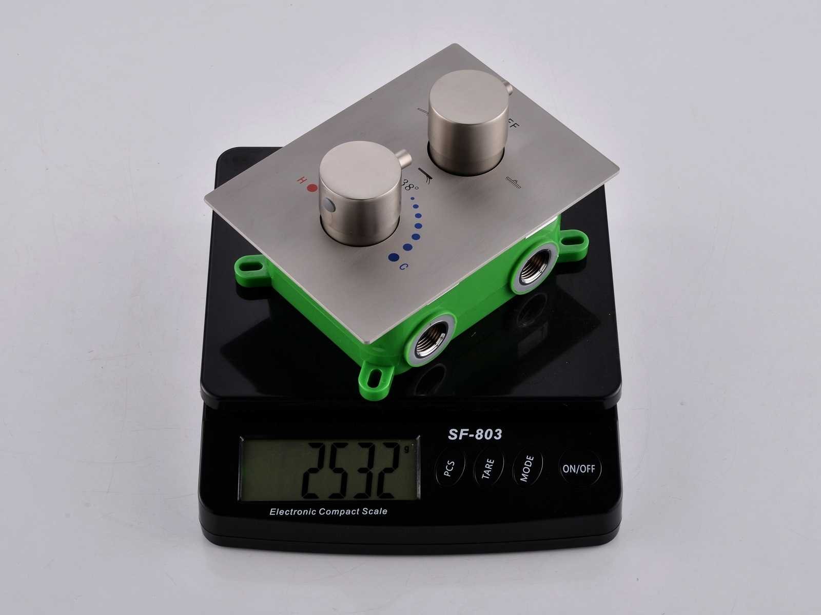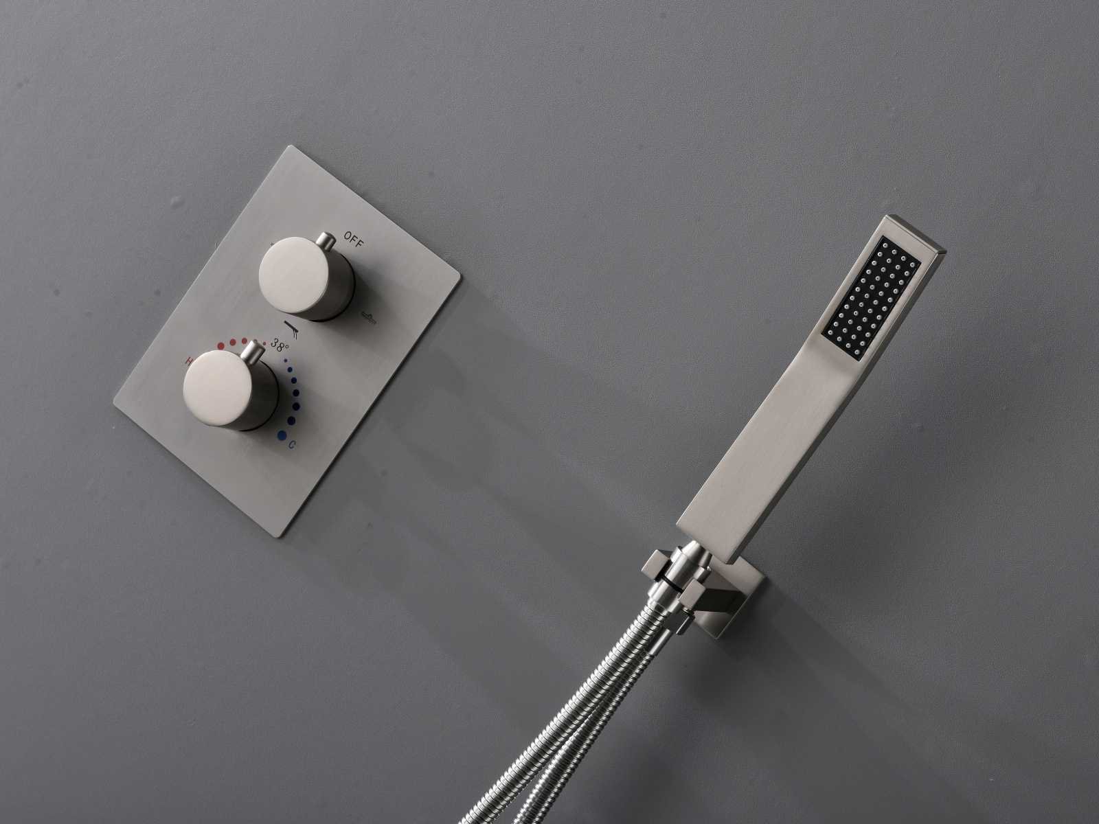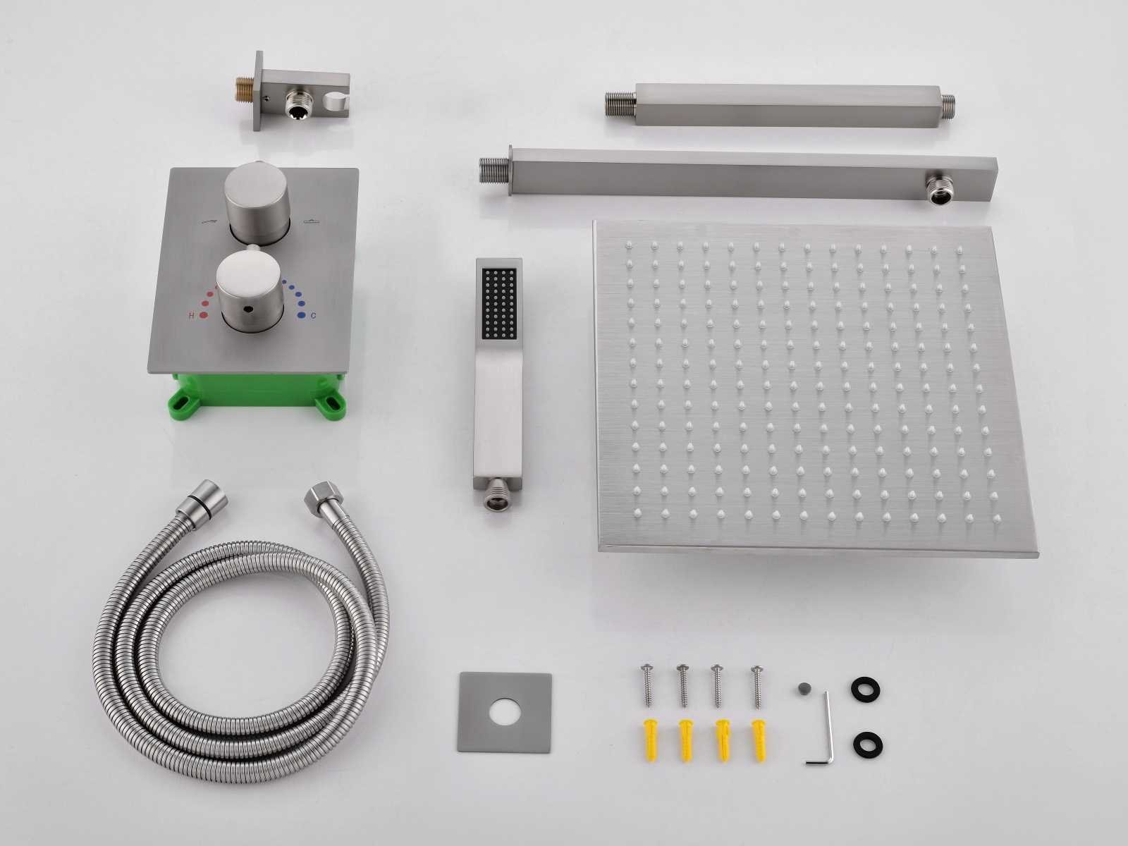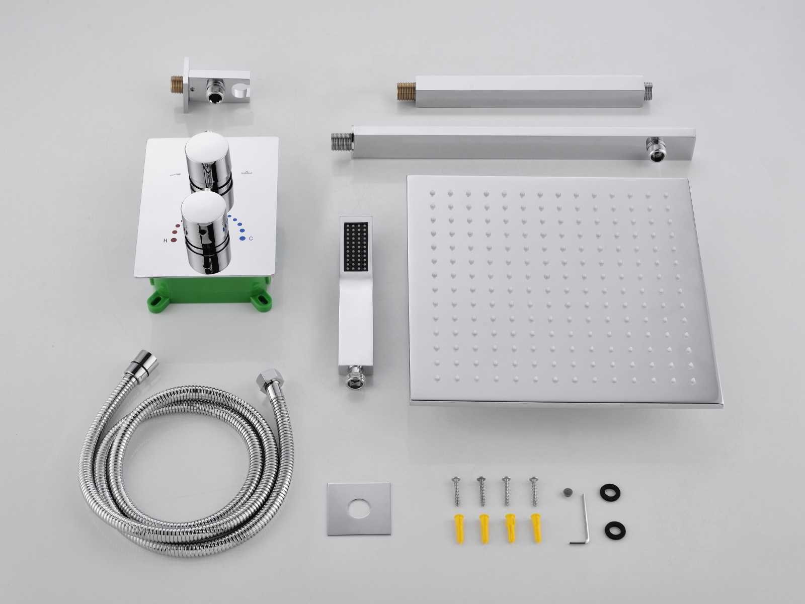 Keuze uit diverse kleuren: chroom of geborsteld RVS (kleurkeuze graag aangeven op de afhaaldag) materiaal messing , smart control thermostaatkraan, binnenwerk keramisch, douchekop 30x30 cm, handdouche verstelbaar met doucheslang en ophanging van messing, voorzien van badkraanuitloop, douchekop met kunststof wateruitlopen om gemakkelijk kalkaanslag te verwijderen, douchekop kantel en draaibaar, inclusief inbouwbox voor eenvoudige installatie, set wordt geleverd met zowel een muurstang als een plafond stang Merk: Mawialux Model: pointer