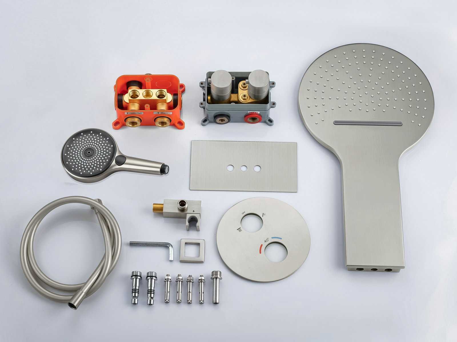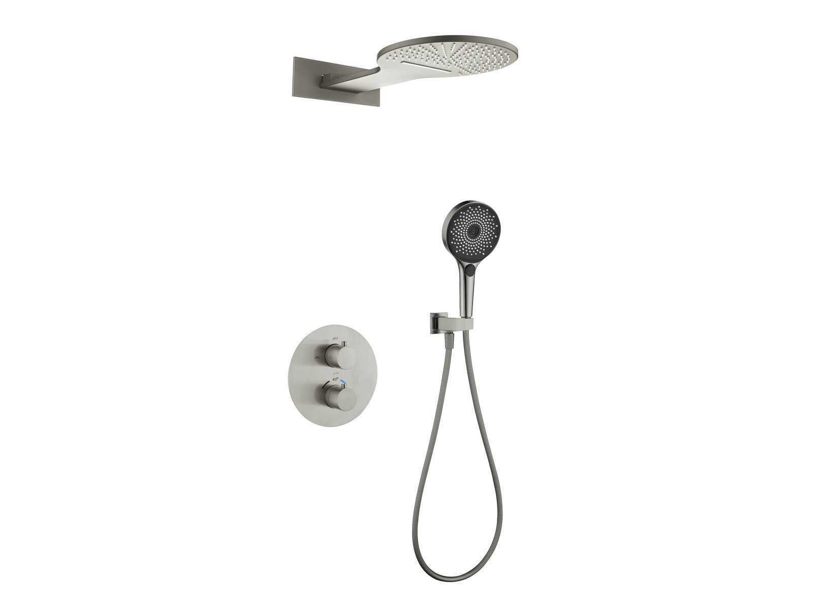 Materiaal messing en 304 rvs, mengkraan, binnenwerk keramisch, douchekop 25x30cm met 2 functies (waterval + regendouche), handdouche verstelbaar met doucheslang en ophanging van messing, met glijstang in hoogte verstelbaar en draaibaar met doucheslang, douchekop met kunststof wateruitlopen, douchekop kantel en draaibaar, anti kalk behandeld, messing muurplaat, met inbouwbox voor makkelijke installatie Merk: Mawialux Model: Jack Kleur: Geborsteld RVS