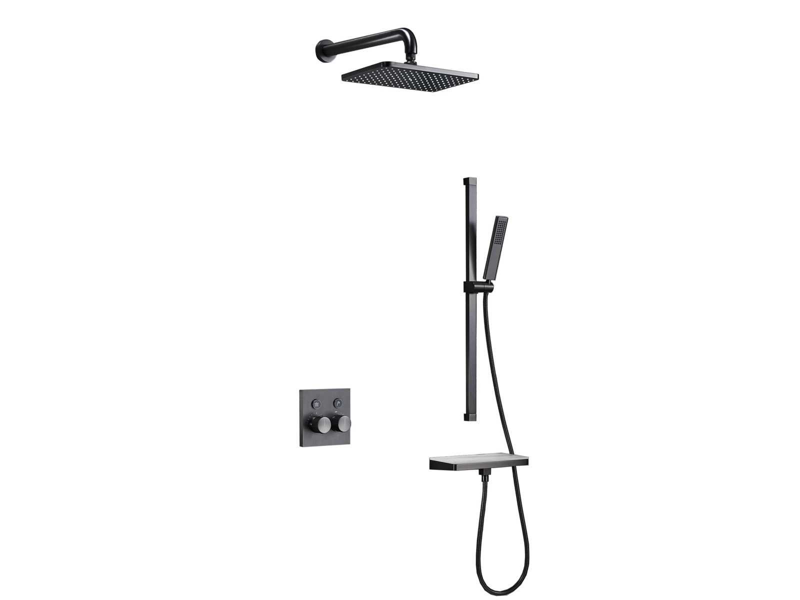 Doordat de inbouwunit is uitgerust met twee aparte stopkranen is het mogelijk beide functies tegelijkertijd te gebruiken, door de meegeleverde glijstang is de handdouche in hoogte verstelbaar. Kraan: thermostaatkraan, Binnenwerk: keramisch, Douchekop: 30 x 20 cm., Handdouche: Gemaakt van messing. Verstelbaar incl. doucheslang. Voorzien van: plateau met artifical stone top. 2 druktoetsen voor regelen gewenste waterfunctie (regendouche en handdouche). Beide functies kunnen tegelijk bediend worden door ingebouwde stopkraan. Waterdruk regelbaar met regelknop. Douchekop kantel en draaibaar, dit betreft een nieuw product in verpakking Merk: Mawialux Model: Fossa Kleur: Mat zwart Materiaal: messing en RVS