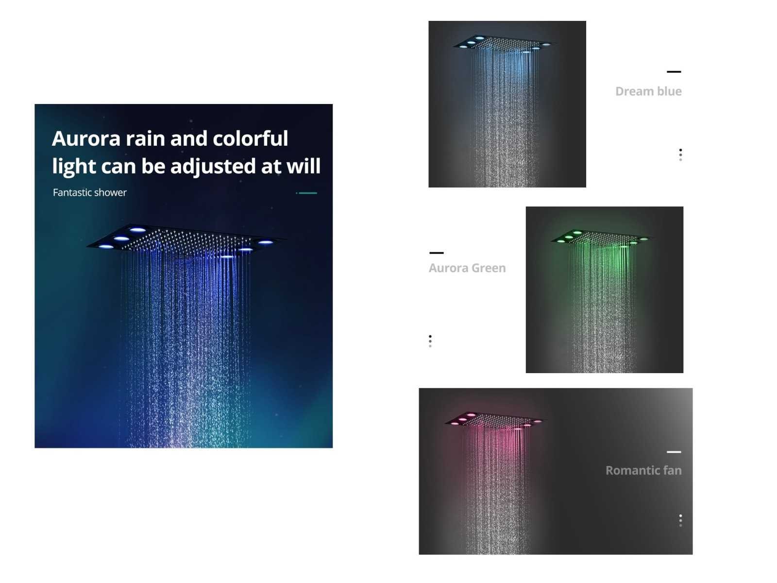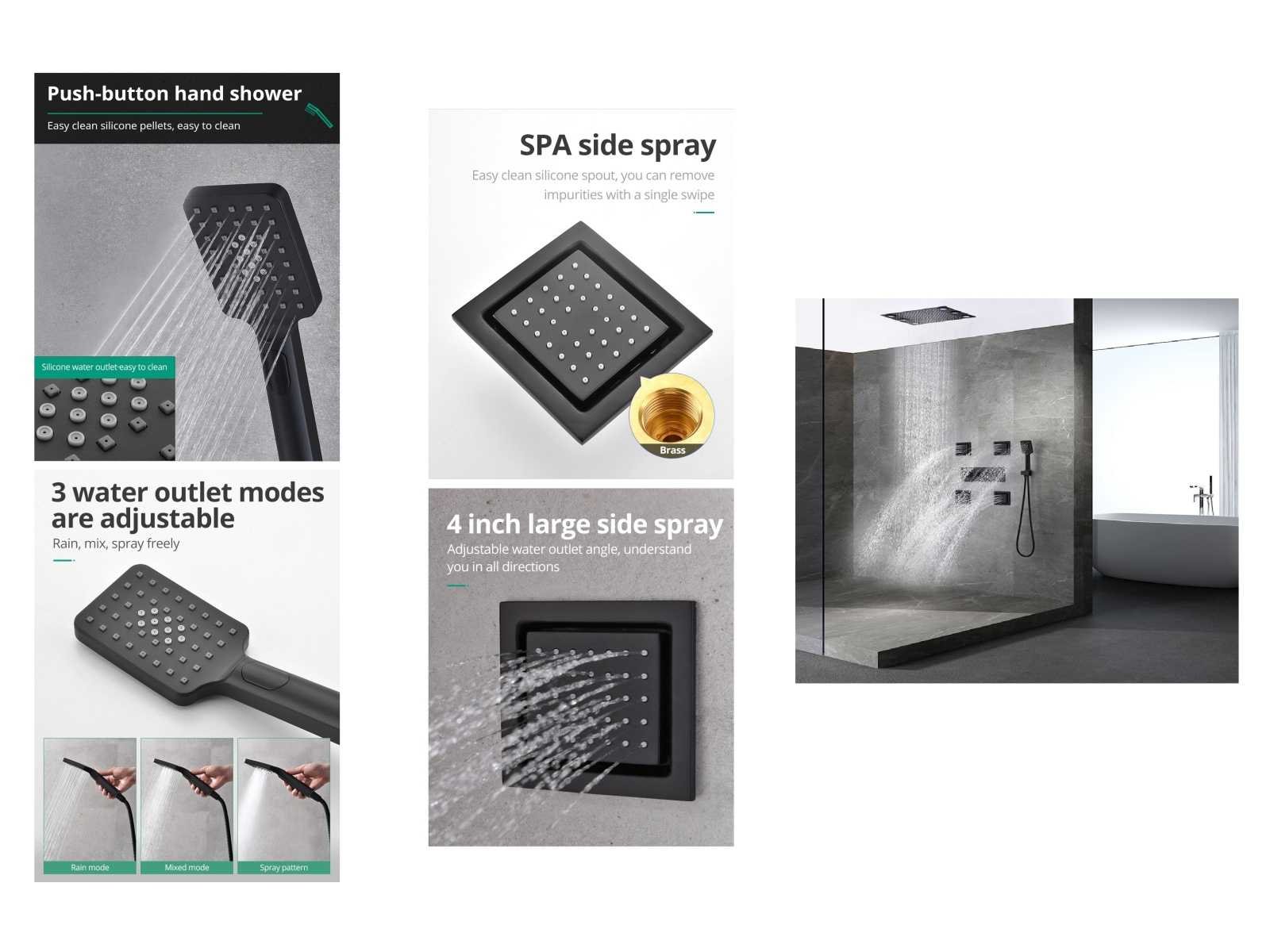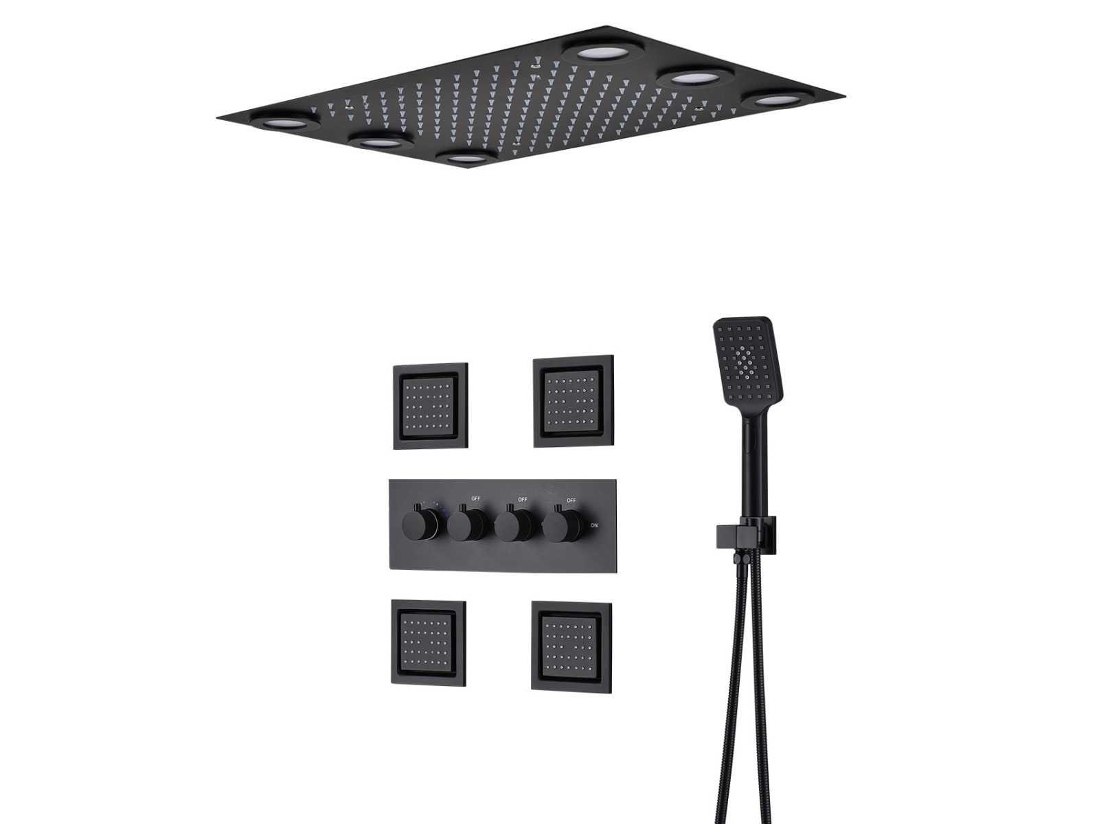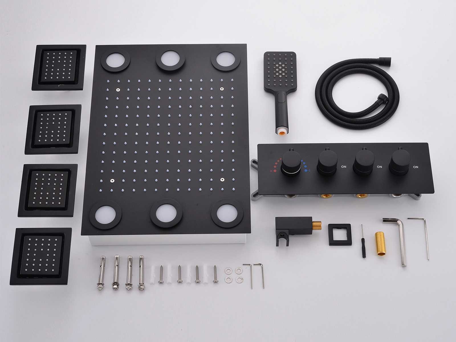 Materiaal messing en 304 rvs, kleur mat zwart, smart control thermostaatkraan met 3 regelknoppen, binnenwerk keramisch, douchekop 50x36 cm uit 304 rvs en 6 stuks ledverlichting, handdouche verstelbaar met 2 functies en doucheslang met draaibare messing ophanging, voorzien van 4 stuks messing massagejets van 10cm doorsnee (draaibaar), grote douchekop met kunststof wateruitlopen om gemakkelijk kalkaanslag te verwijderen, keramisch binnenwerk, werking temperatuur 0 tot 90 graden celsius, anti kalk behandelddouchekop en handdouche en massagejets kunnen allemaal tegelijk of onafzondelijk gebruikt/geregeld worden Merk: Mawialux Model: Boxer Kleur: mat zwart