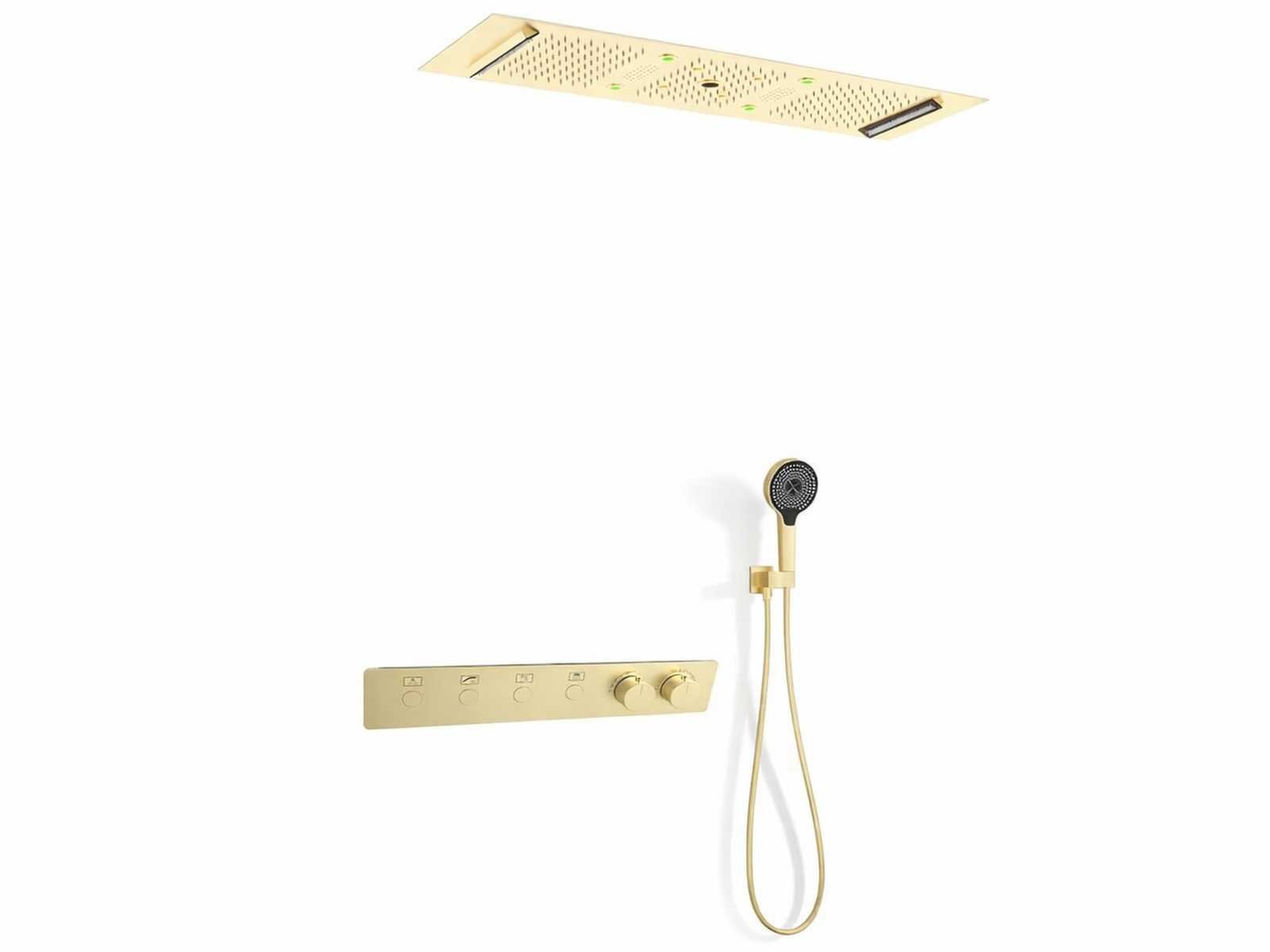 Bluetooth met speakers, materiaal messing en 304 rvs, smart control thermostaatkraan met 5 drukknoppen en 2 regelknoppen, binnenwerk keramisch, douchekop 90x30 cm met 5 functies uit 304 rvs en ingebouwde ledverlichting, handdouche verstelbaar met doucheslang en messing ophanging, douchekop met vernevelaars + waterval + sproeiers + 3 regendouche zones, afstandsbediening voor kleuren regeling, kunststof wateruitlopen om gemakkelijk kalkaanslag te verwijderen, alle water functies kunnen allemaal tegelijk of onafzonderlijk gebruikt/geregeld worden Merk: Mawialux Model: luxury line Kleur: geborsteld goud