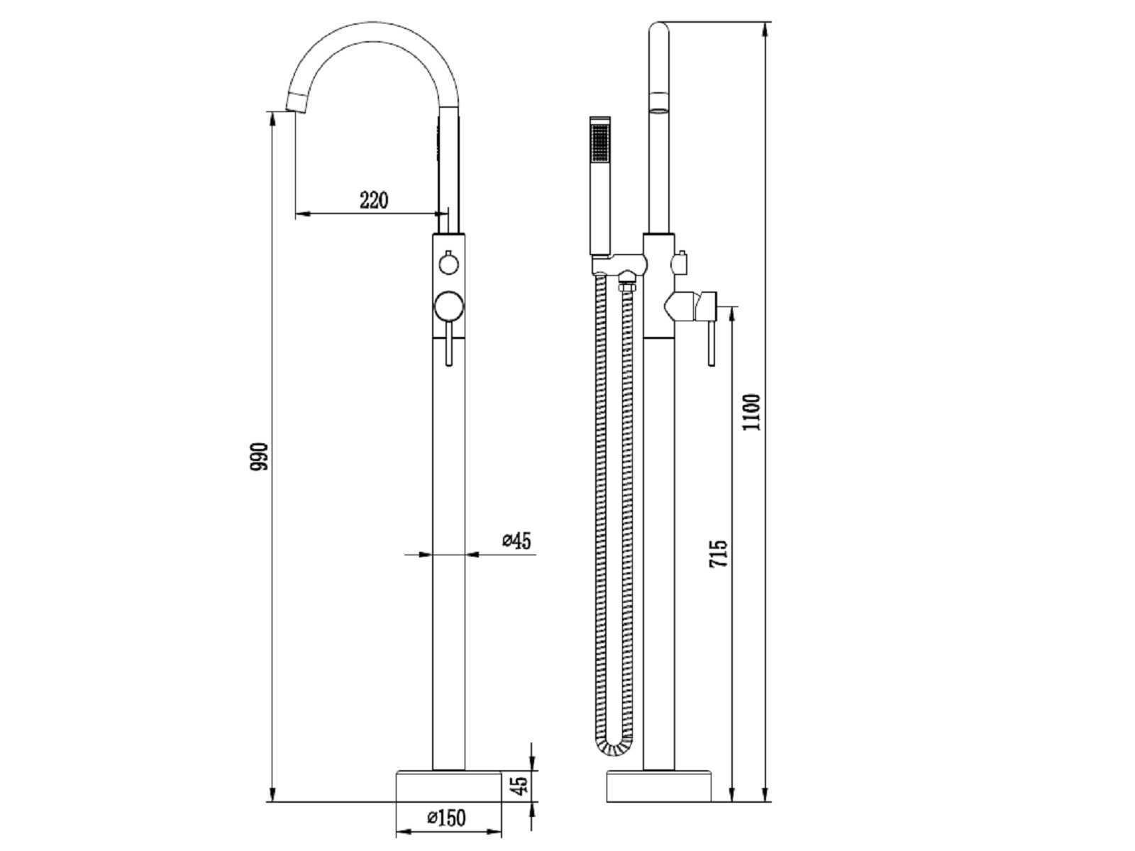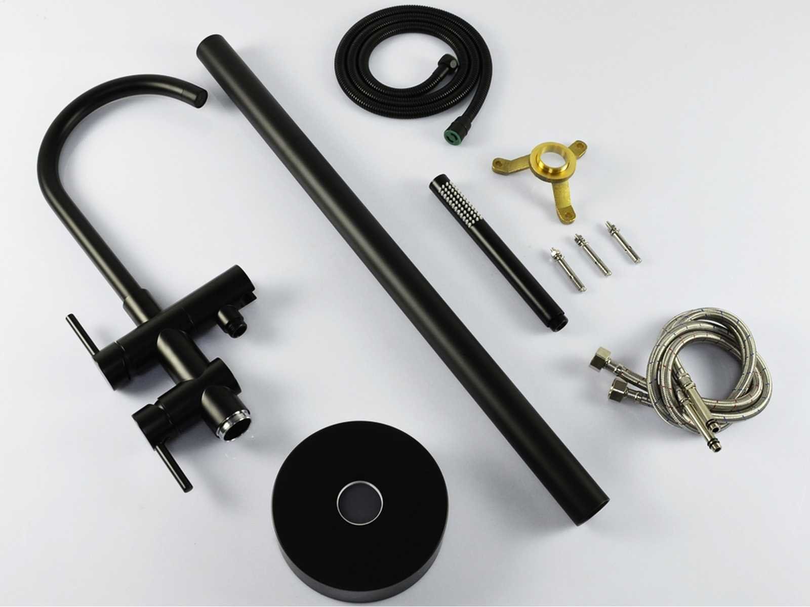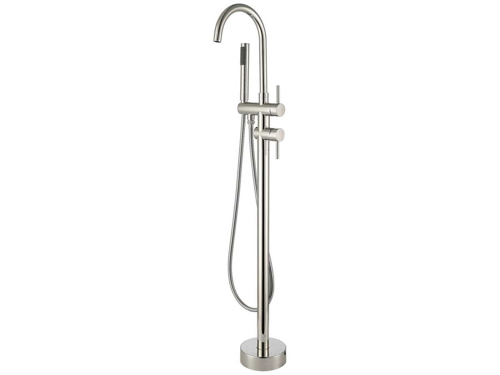 Materiaal messing, keuze kleuren; geborsteld goud, chroom, geborsteld rvs, geborsteld goud of koper (kleurkeuze aangeven op de afhaaldag), Binnenwerk keramisch, Hoogte 110 cm, Handdouche ja met flexibele doucheslang en verstelbare ophanging, Voorzien van mengkraan, hendel voor schakeling tussen Handdouche of badkraanuitloop, vloerplaat, waterleidingen, aansluitmateriaal Merk: Mawialux Model: Madrid Kleur: beschikbaar in 5 kleuren