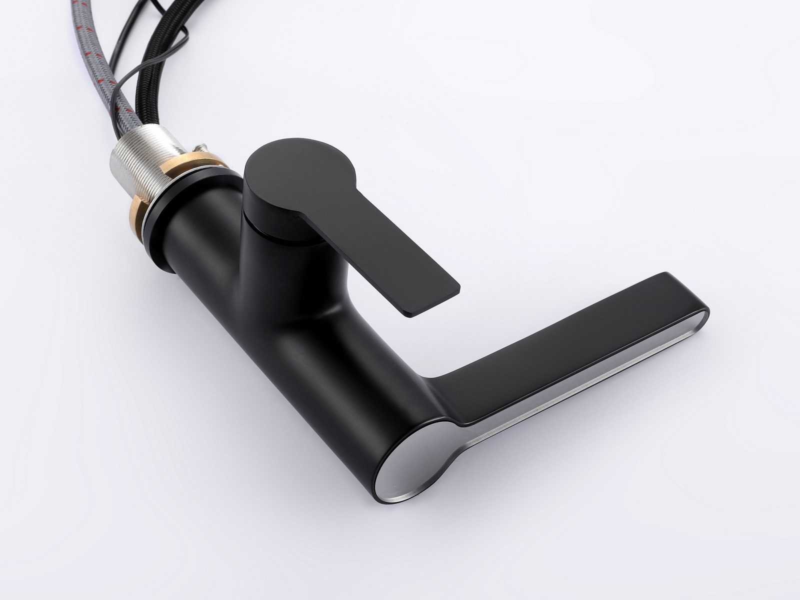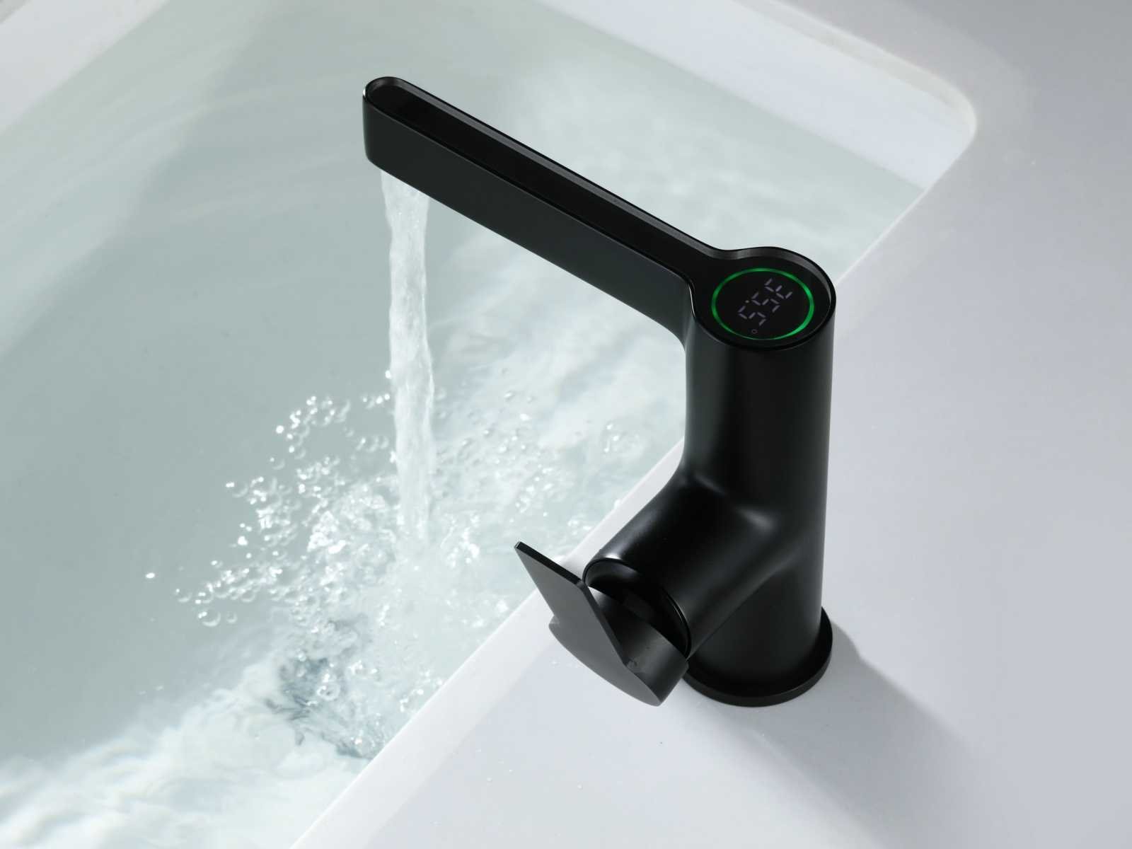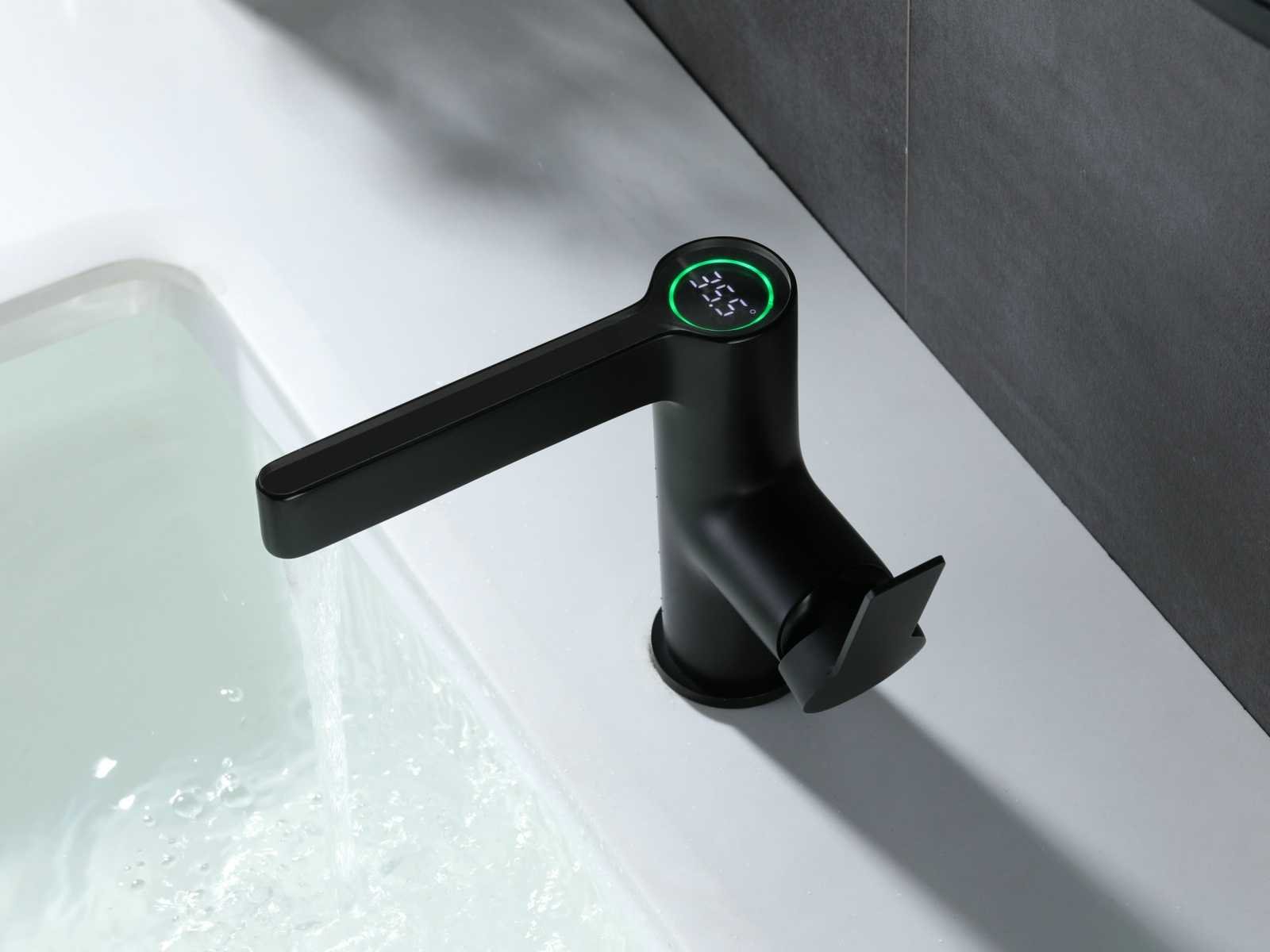 Deze moderne wastafelkraan met digitaal display is dé eyecatcher voor in de badkamer! Door zijn luxe uitstraling steelt hij echt de show. De wastafelkraan is eenvoudig te bedienen met de enkele hendel. De temperatuur aanduiding wordt zichtbaar op de bovenzijde van de kraan zodra het water loopt. Het display wordt aangestuurd door een inwendige dynamo welke op de stroom van het water werkt. Je hebt dus geen electra of batterijen nodig. Kraan: digitale wastafelkraankraan Materiaal: messing Kleur: mat zwart Hoogte: 15,5 cm Voorzien van: keramisch binnenwerk, digitale micromotor aansturing door middel van waterflow, geen stroom/batterijen nodig, temperatuur digitaal afleesbaar, warm en koud waterslang meegeleverd. LET OP: De bovenzijde van de kraan lijkt op de foto zwart. In werkelijkheid is de bovenzijde spiegelend. Merk: Mawialux Model: Cujo Kleur: mat zwart