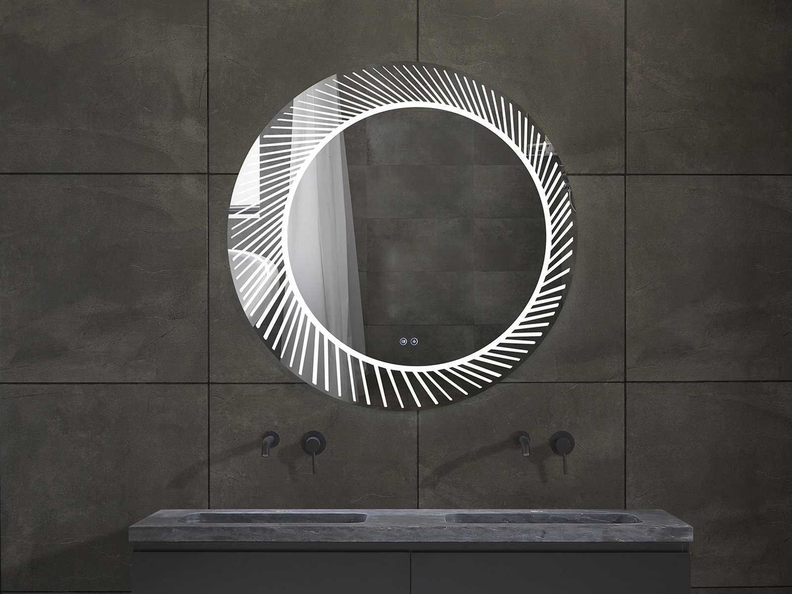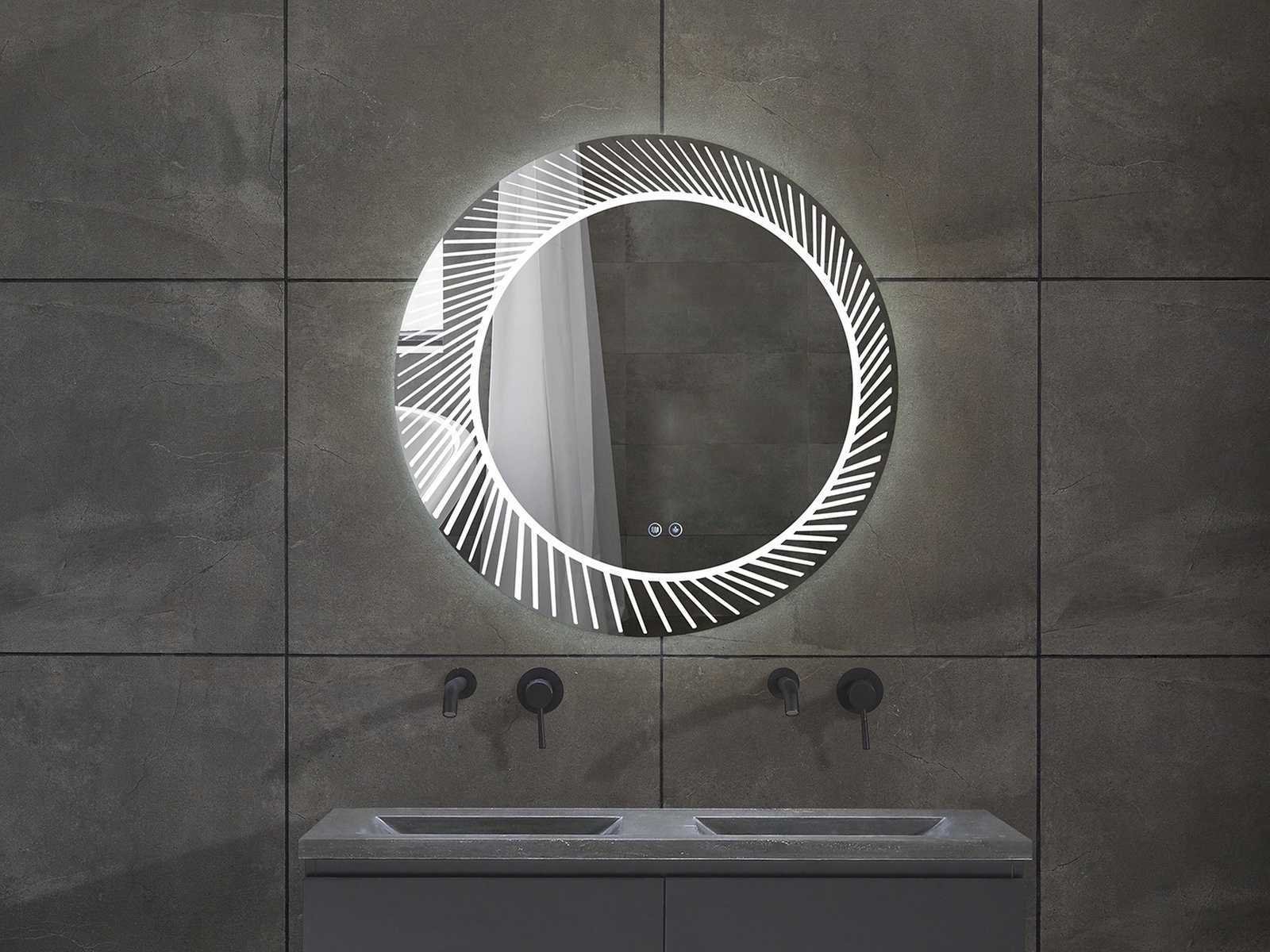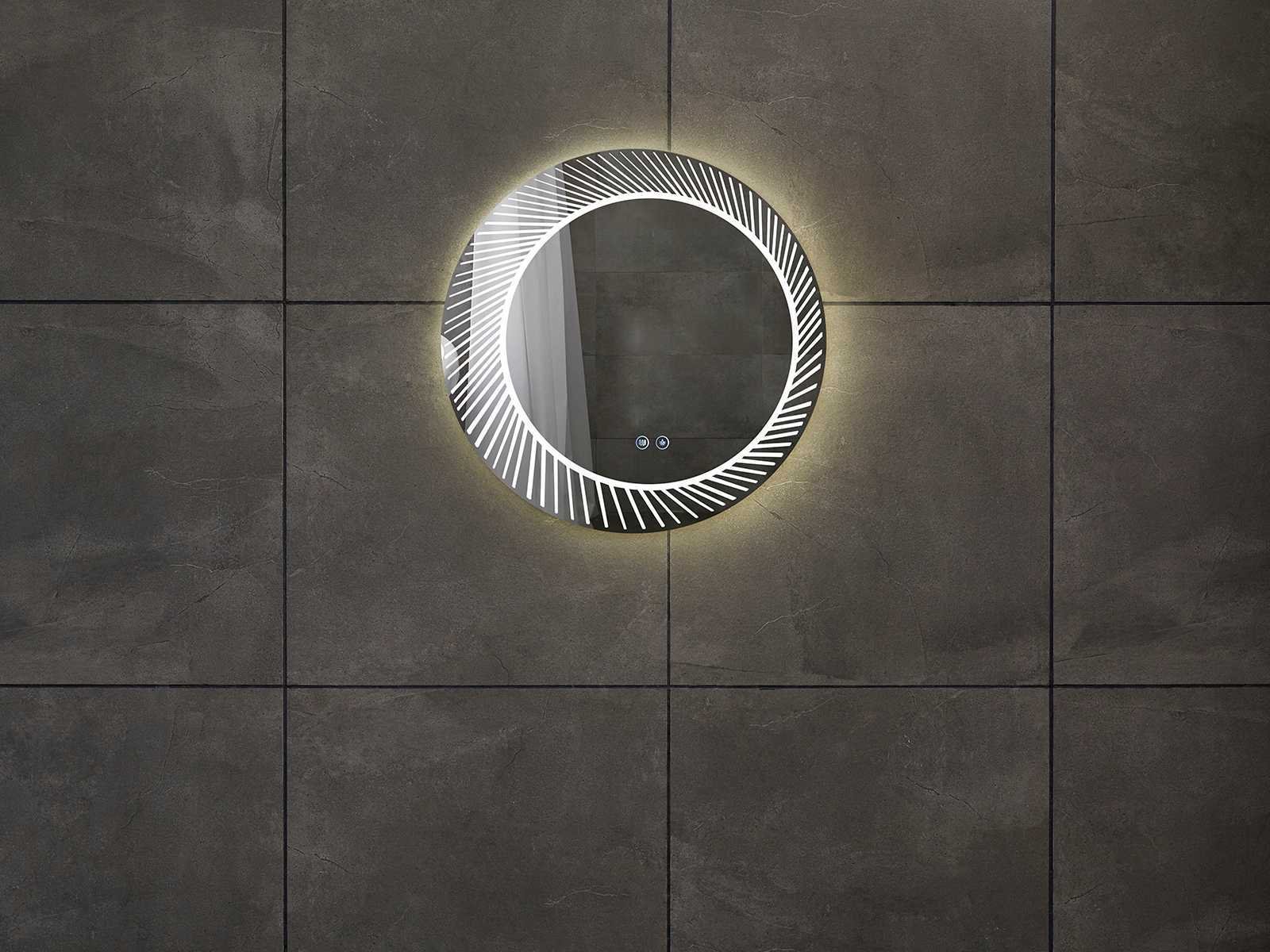 Keuze uit diverse diameters: 60,80,100cm (keuze graag doorgeven op de afhaaldag), verwarming, bediening one-touch, verlichting rondom aan de achterkant met 3 verstelbare kleuren led 3000/4500/6000k led-dioden(dimbaar) (geel/blauw/wit licht), 220volt stekker(plug and play), glas 1.5mm kopervrij met explosion-proof laag Merk: Mawialux Model: Imelda