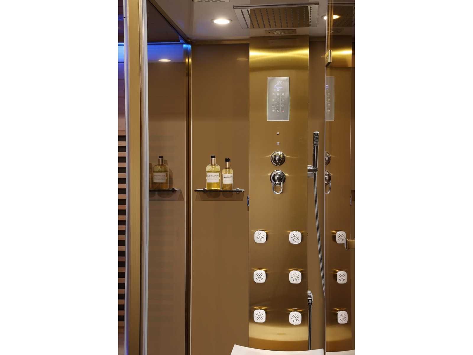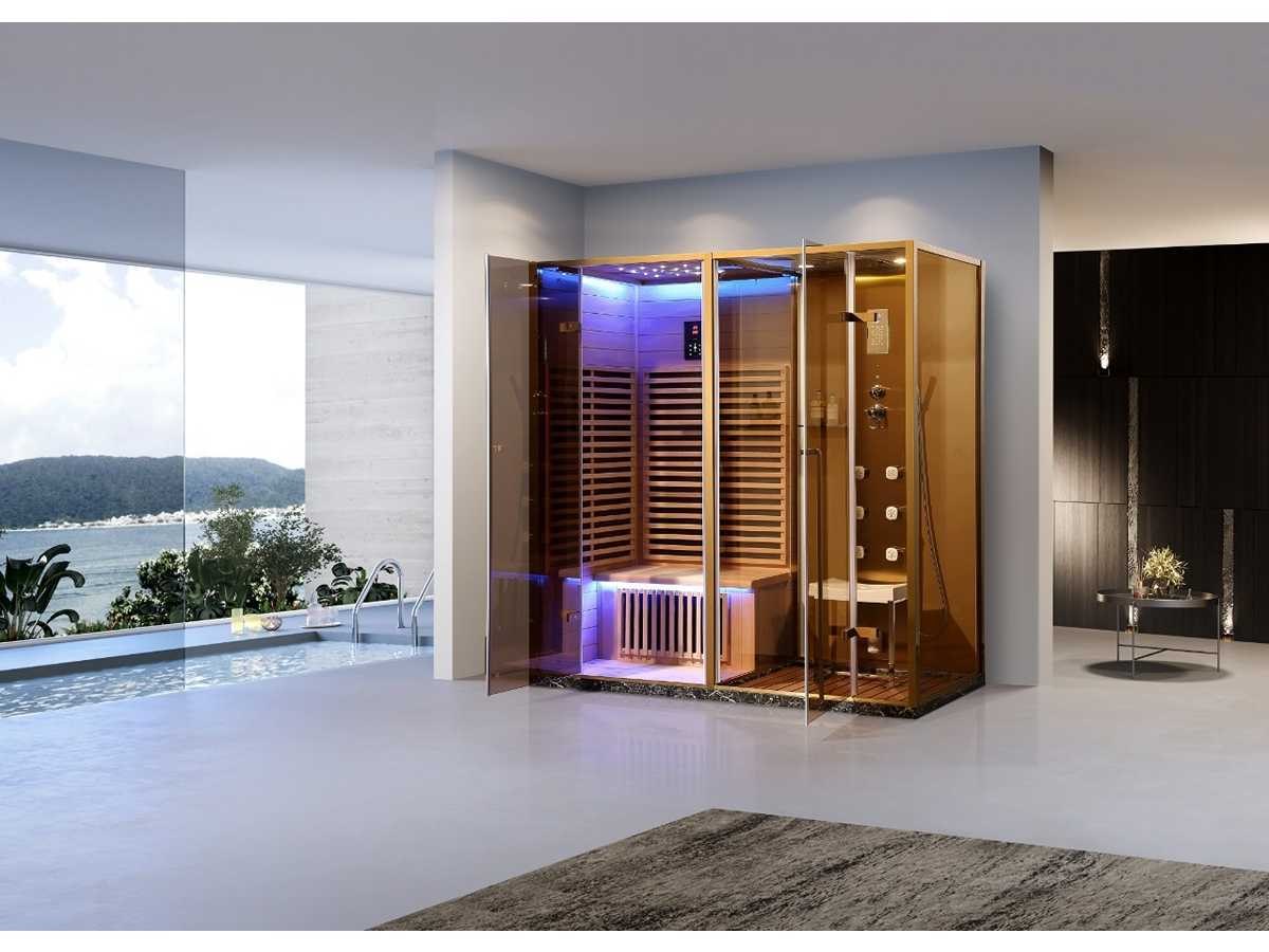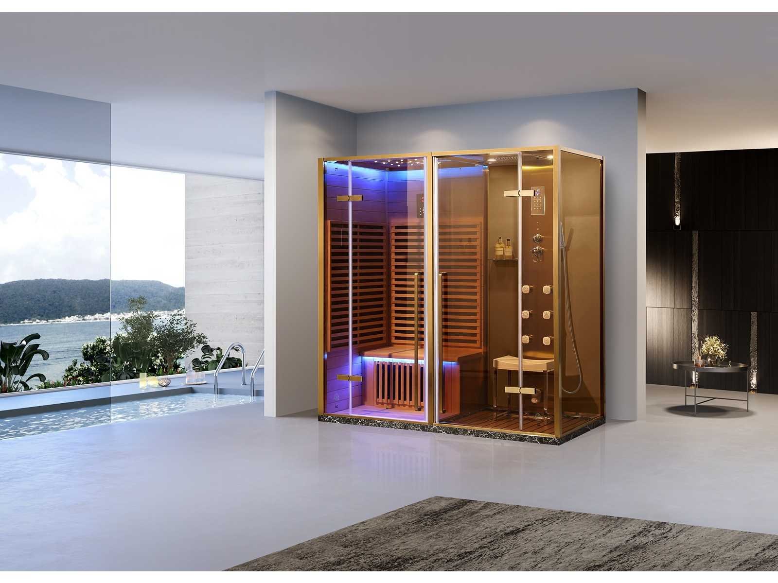 8mm veiligheidsglas, marmer bodem met PVC anti slip inleg (in stoomgedeelte) , digitaal bedieningspaneel (in zowel de sauna als het stoomcabine gedeelte), bluetooth met speakers, afvoer met flexibele waterslang, sauna deel 5 infrarood panelen totaal 3500 watt, stoomgenerator 2500 watt, totale stroom 220v 6000 watt 16a(met plug and play stekkers), 6 stuks massagejets in de achterwand verwerkt, afstandsbediening, sauna gedeelte bestaat uit hemlock hout. bankje geschikt voor 2 personen, thermometer sauna, diverse ledverlichting met kleurentherapie (7 kleuren), stoomcabine voorzien van design zitje, rvs deurgrepen (goud), aromatherapie, digitale temperatuur aanduiding, afzuiging met ventilator, ozone, waterdruk regelbaar, handdouche, planchet, verchroomd messing kraanwerk, 2 draaideuren met massieve RVS (gouden) ophangingen, regendouche in het plafond, handdouche Merk: Mawialux Model: Pico Kleur: Goud Gewicht: 400kg Lengte: 100cm Breedte: 200cm Hoogte: 200cm Materiaal: Hemlock hout en 8mm veiligheidsglas