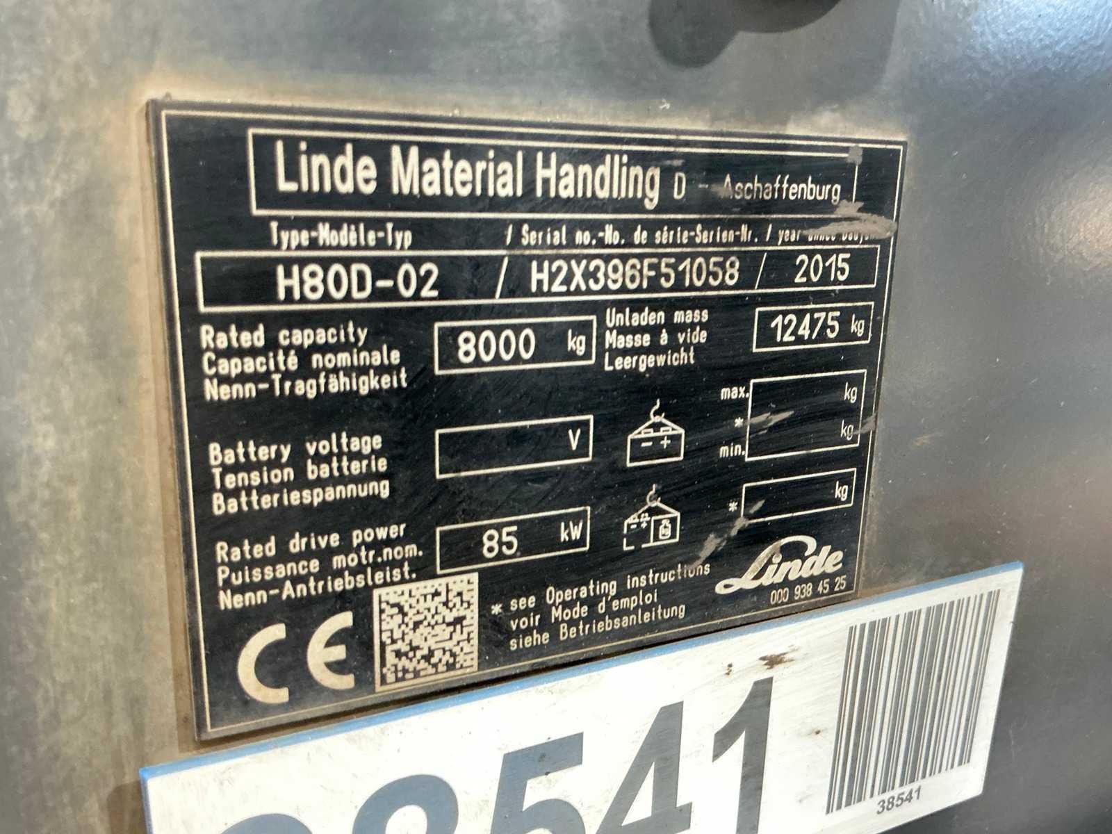 Merk: Linde Type: H80 Bouwjaar: 2015 Serienummer: H2X396F51058 Brandstof: Diesel Mast: Duplex Soort band: Volrubber Aantal wielen: 6 Afgelezen urenstand: 16566 Side-shift: true Hydraulisch verstelbare lepels: true Duplex mast: true Eigen gewicht: 12475kg Hefvermogen: 8000kg Lepellengte: 1990mm Hefhoogte: 5250mm Vol rubber banden: true Totale afmeting L: 3500mm Totale afmeting Breedte: 2232mm Totale afmeting Hoogte: 3740mm Diesel: true