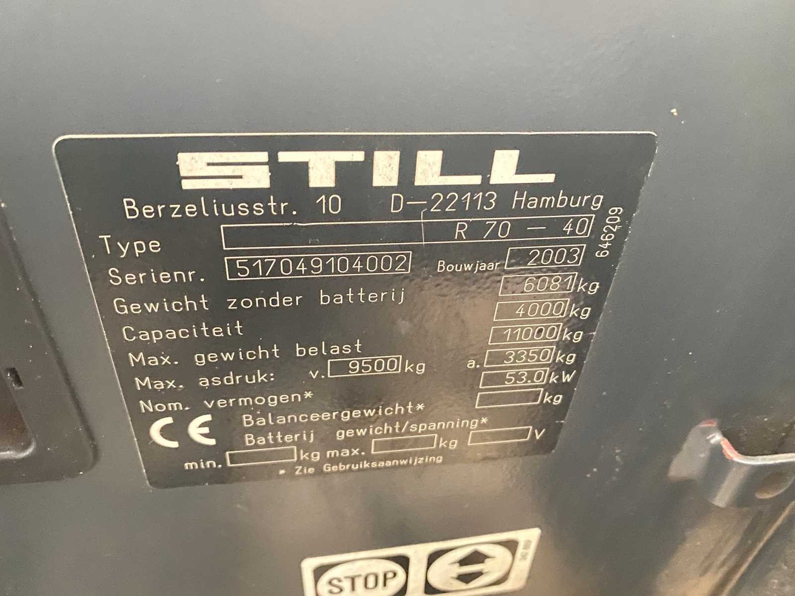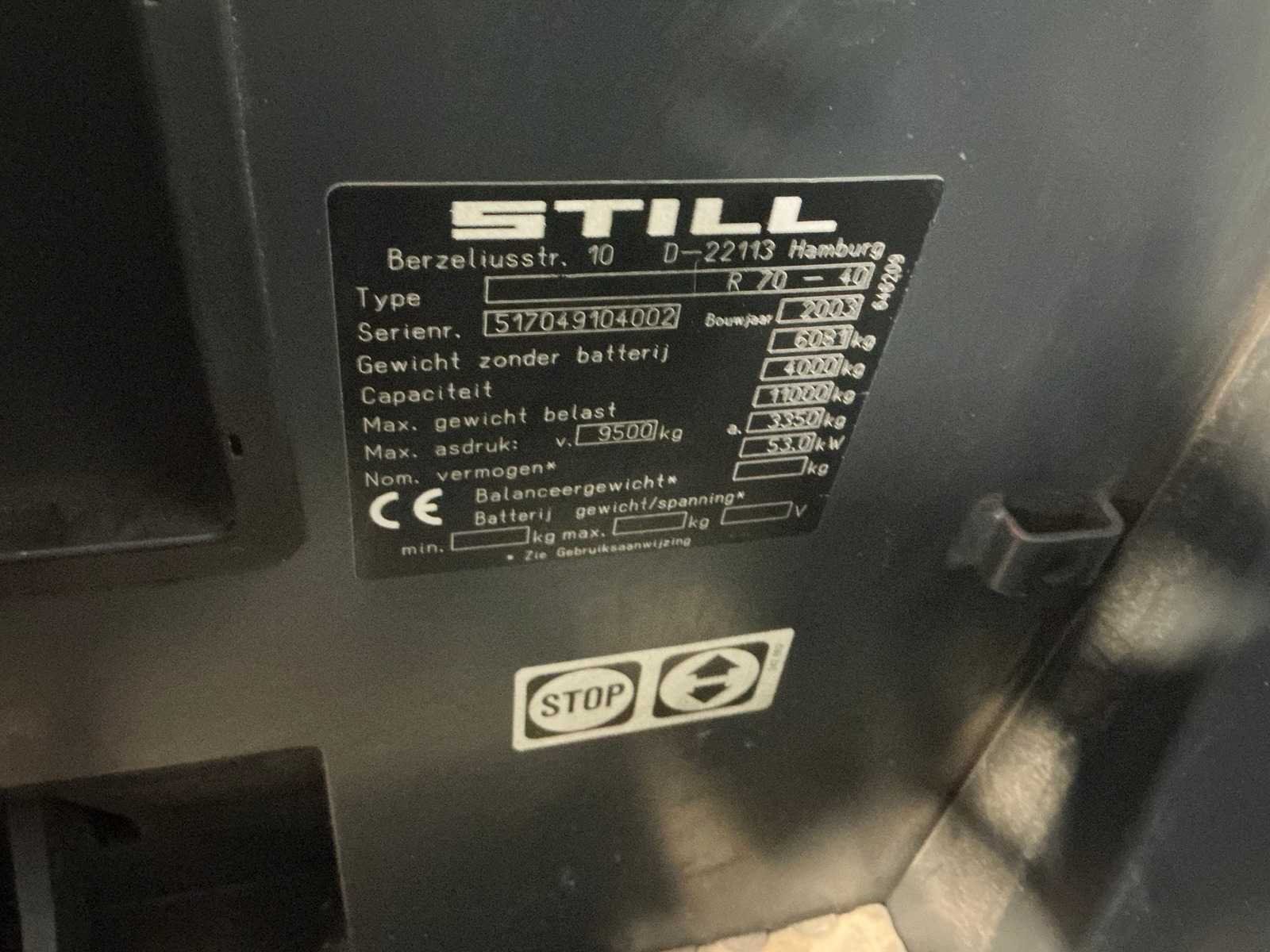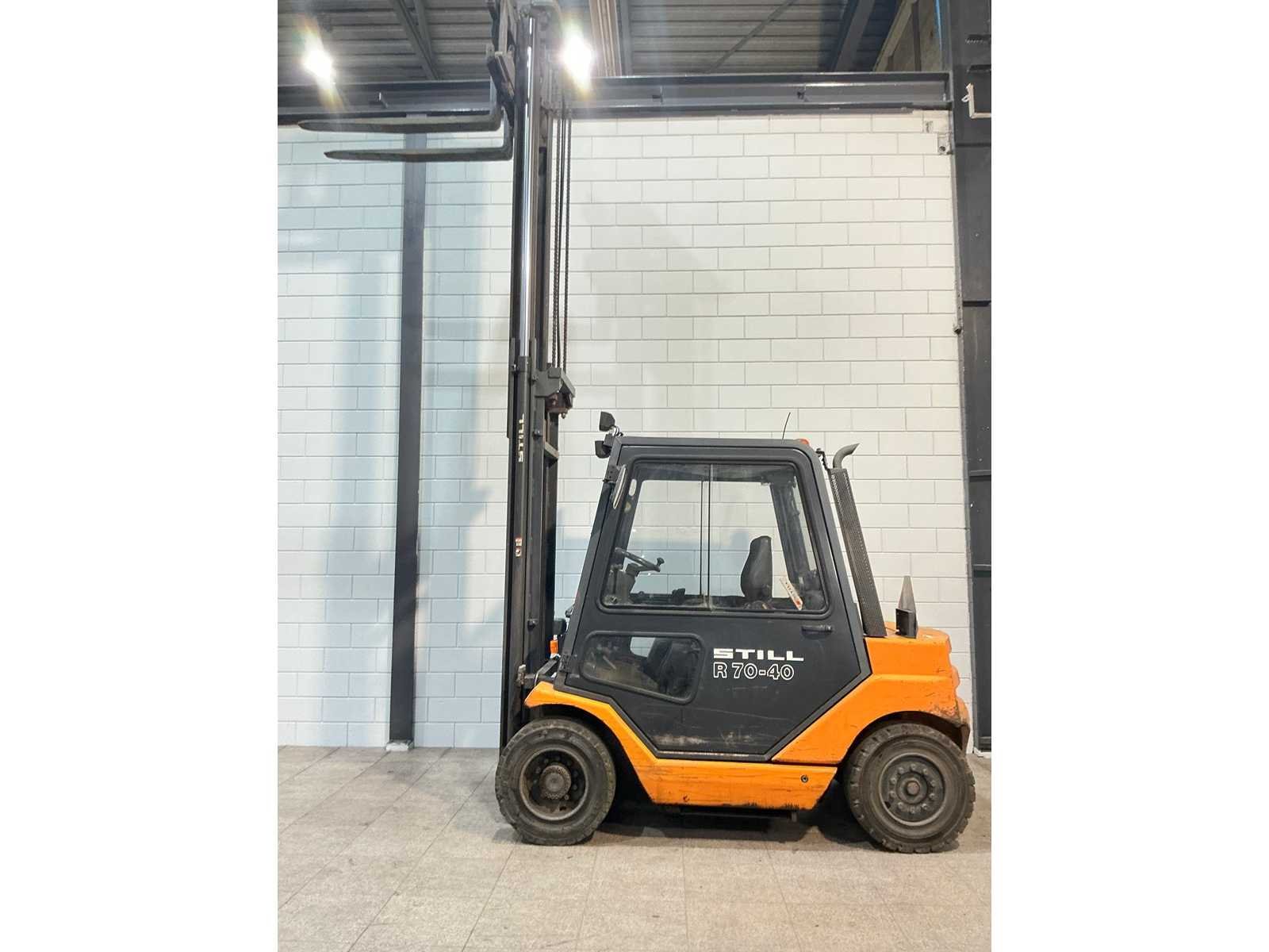 Werklampen Volledige cabine Verwarming Merk: Still Type: R 70-40 Bouwjaar: 2003 Serienummer: 517049104002 Brandstof: Diesel Aantal wielen: 4 Afgelezen urenstand: 17048 Side-shift: true Duplex mast: true Eigen gewicht: 6081kg Hefvermogen: 4000kg Lepellengte: 1300mm Hefhoogte: 4400mm Minimale doorrijhoogte: 2900mm Totale afmeting L: 2800mm Totale afmeting Breedte: 1400mm Totale afmeting Hoogte: 2900mm Diesel: true