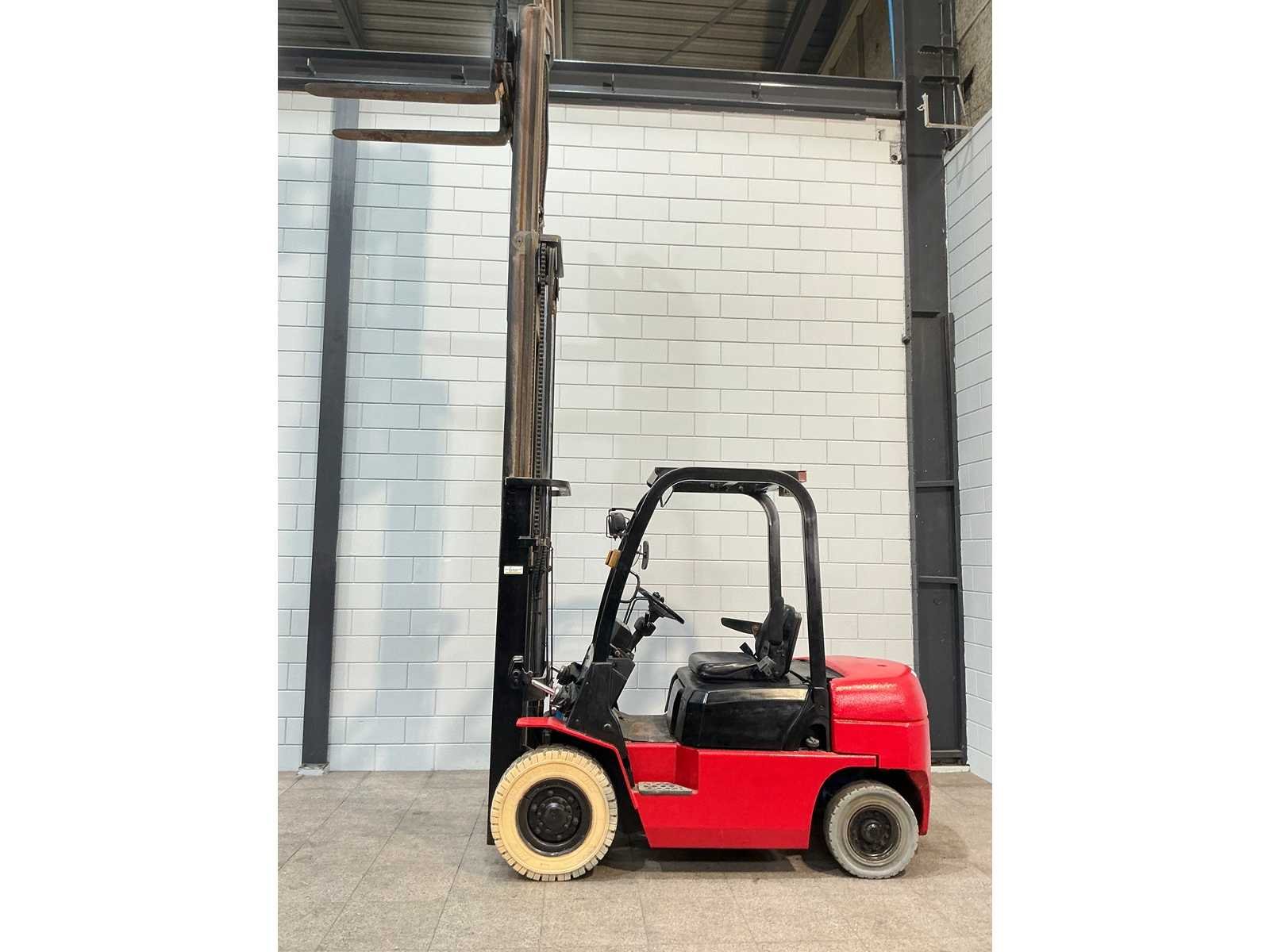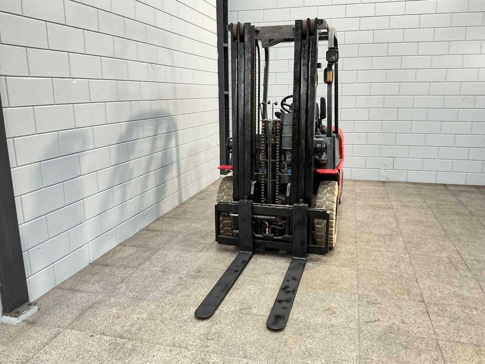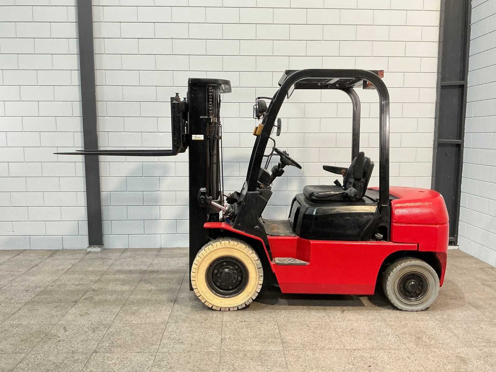 Merk: hangcha Type: CPCD25N Bouwjaar: 2008 Serienummer: 080929171 Brandstof: Diesel Mast: Triplex Soort band: Volrubber Aantal wielen: 4 Afgelezen urenstand: 3295 Free-lift: true Side-shift: true Triple mast: true Eigen gewicht: 4050kg Hefvermogen: 2500kg Lepellengte: 1070mm Hefhoogte: 4320mm Vol rubber banden: true Totale afmeting L: 2560mm Totale afmeting Breedte: 1140mm Totale afmeting Hoogte: 2120mm Diesel: true