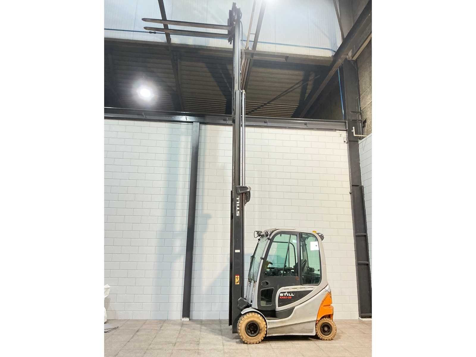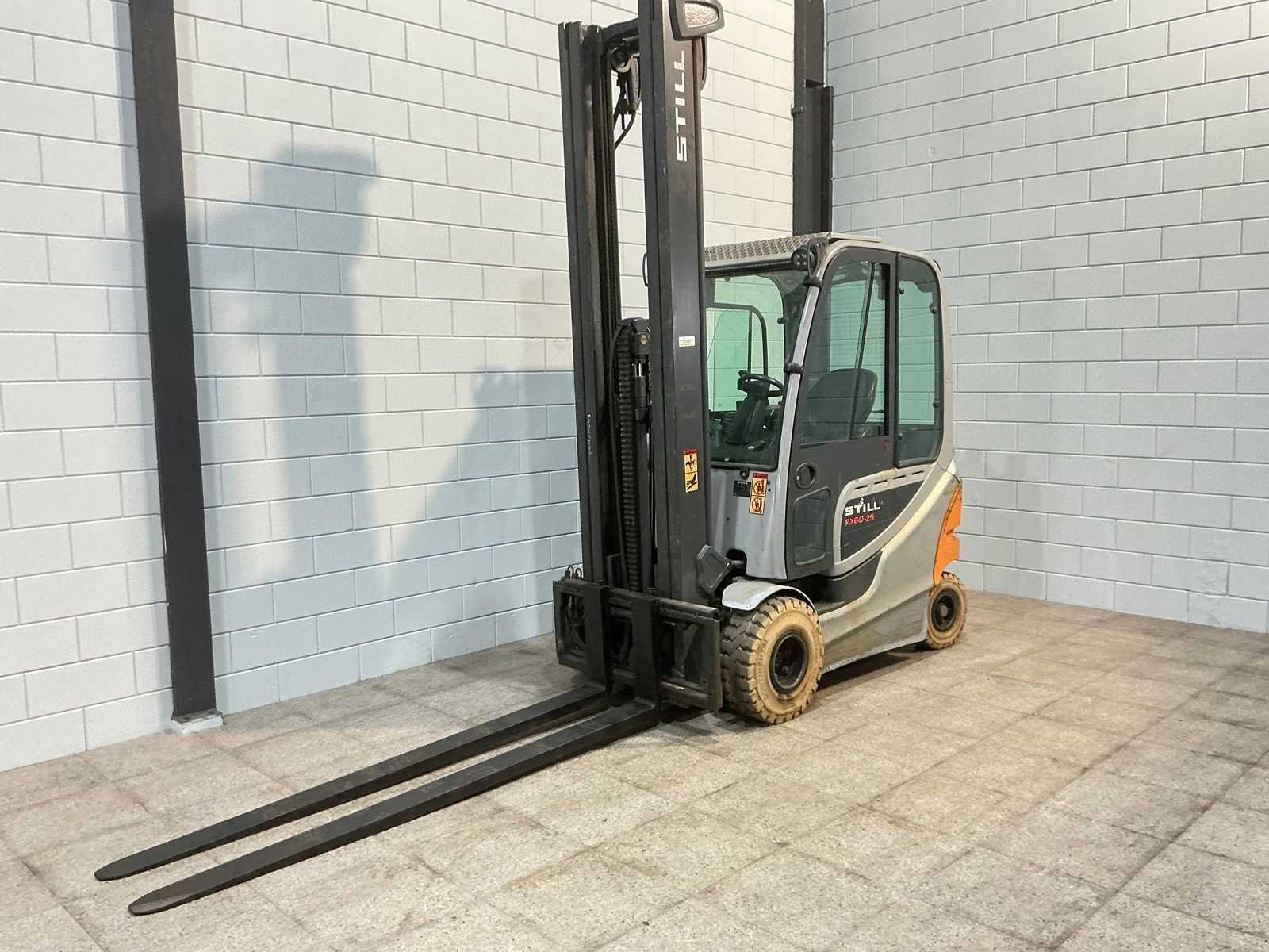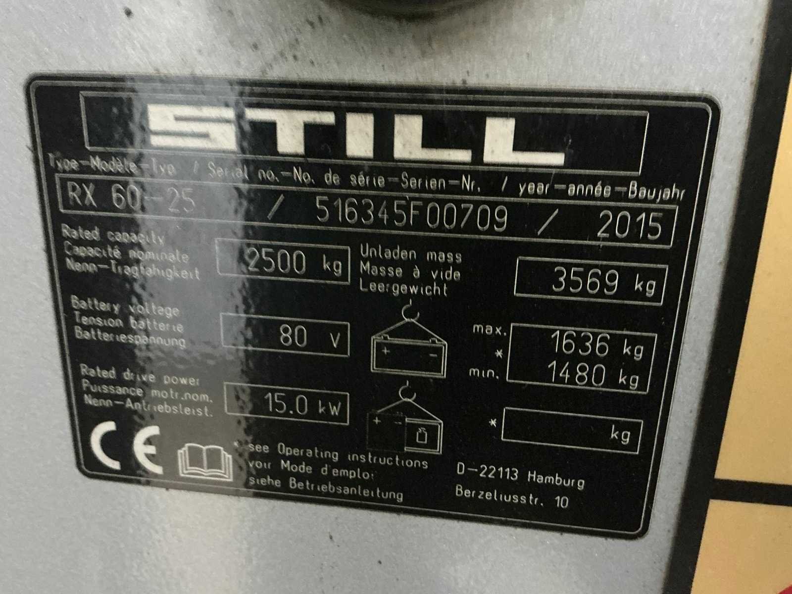 Merk: Still Type: RX60-25 Bouwjaar: 2015 Serienummer: 516345F00709 Brandstof: Elektrisch Mast: Triplex Soort band: Volrubber Aantal wielen: 4 Afgelezen urenstand: 14014 Accu lader: true Free-lift: true Side-shift: true Triple mast: true Eigen gewicht: 5200kg Hefvermogen: 2500kg Lepellengte: 2200mm Hefhoogte: 7390mm Vol rubber banden: true Totale afmeting L: 2320mm Totale afmeting Breedte: 1190mm Totale afmeting Hoogte: 3170mm