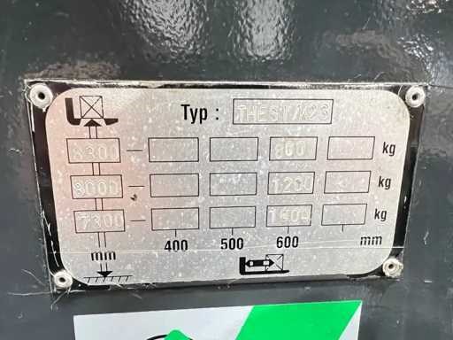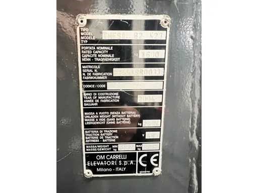 Vrije-heffing: 2400mm Merk: OM Type: Thesi B2 K23 Bouwjaar: 2004 Serienummer: F24519R00338 Afgelezen urenstand: 1961 Accu lader: true Free-lift: true Side-shift: true Triple mast: true Eigen gewicht: 3500kg Hefvermogen: 1600kg Lepellengte: 1200mm Hefhoogte: 8300mm Minimale doorrijhoogte: 3330mm Totale afmeting L: 1750mm Totale afmeting Breedte: 1270mm Totale afmeting Hoogte: 3330mm Elektrisch: true