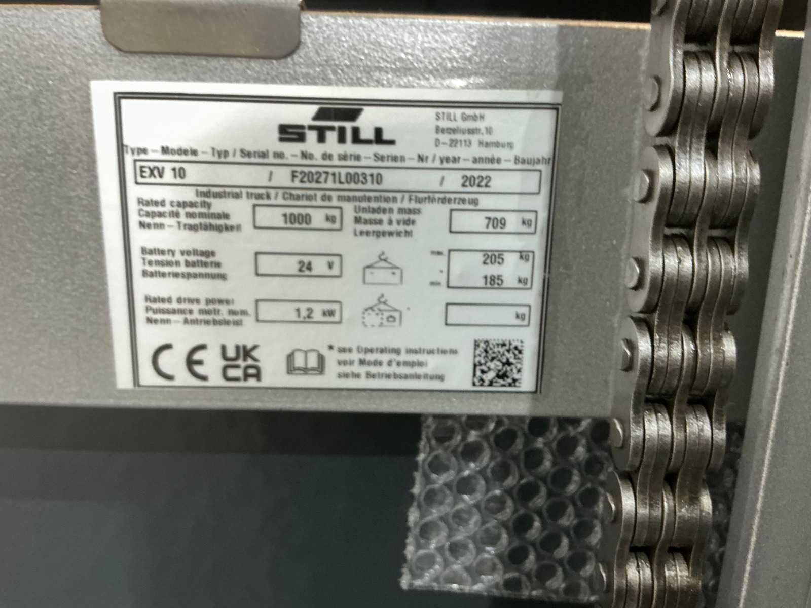 Merk: Still Type: EXV10 Bouwjaar: 2022 Serienummer: F20271L00310 Hefvermogen: 1000kg Hefhoogte: 4224mm Lepellengte: 1000mm Afgelezen urenstand: 1 Eigen gewicht: 915kg Totale afmeting L: 1700mm Totale afmeting Breedte: 810mm Totale afmeting Hoogte: 2600mm Accu lader: true