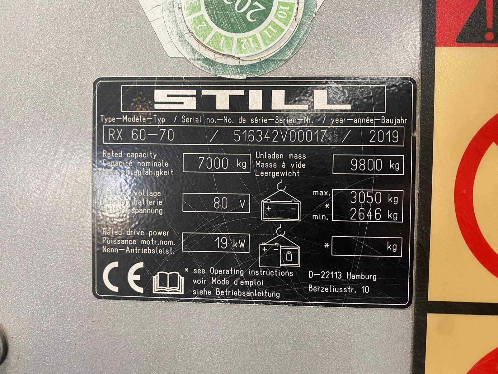 4 vorkenspreider Verwarming Werklampen Merk: Still Type: RX60-70 Bouwjaar: 2019 Serienummer: 516342V00017 Brandstof: Elektrisch Aantal wielen: 6 Afgelezen urenstand: 13119 Side-shift: true Duplex mast: true Eigen gewicht: 12414kg Hefvermogen: 7000kg Lepellengte: 2400mm Hefhoogte: 3520mm Minimale doorrijhoogte: 2920mm Totale afmeting L: 3750mm Totale afmeting Breedte: 2000mm Totale afmeting Hoogte: 2920mm