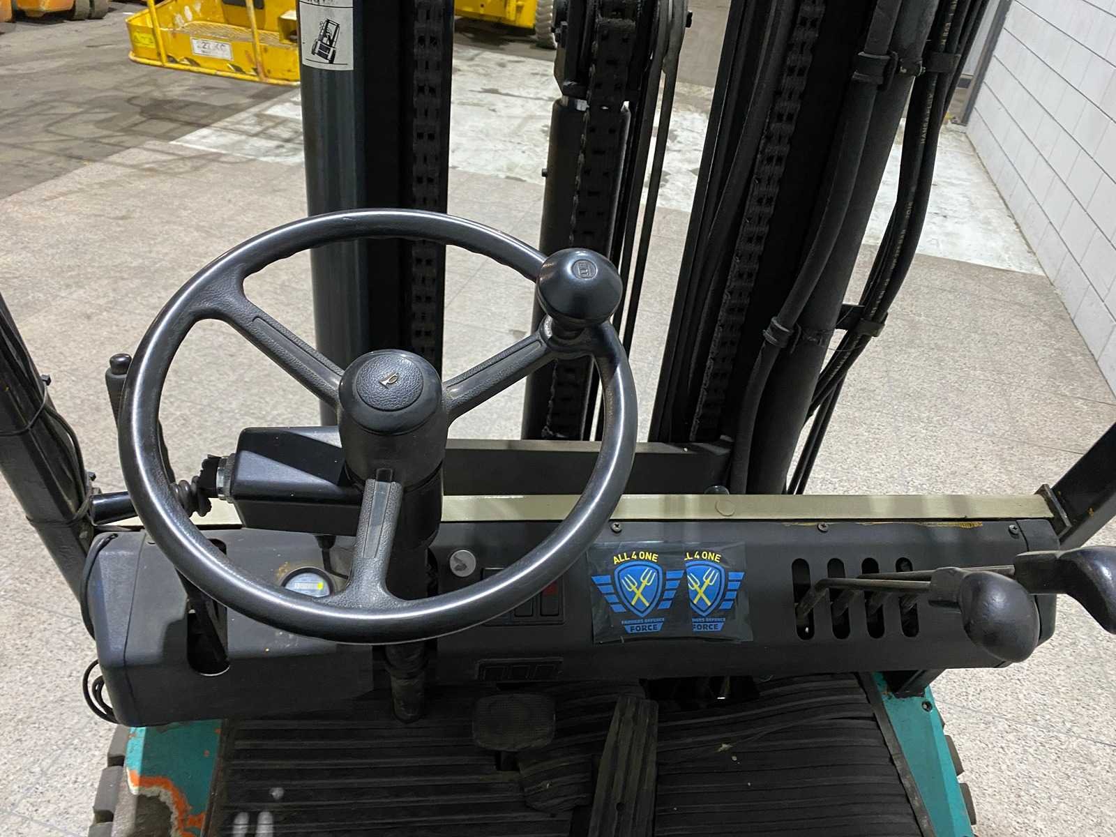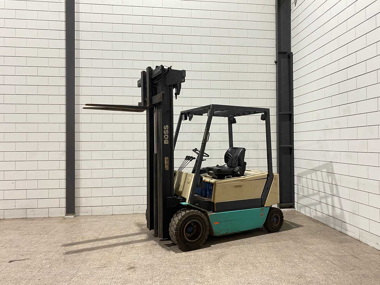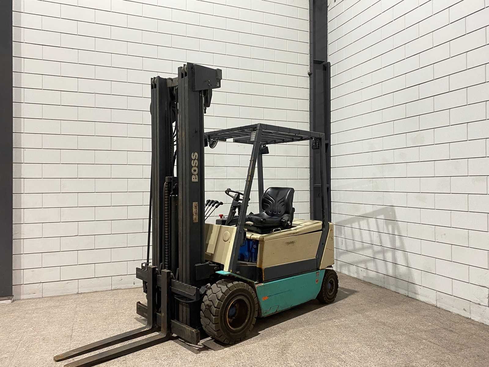 Merk: Boss Brandstof: Elektrisch Mast: Triplex Soort band: Volrubber Aantal wielen: 4 Afgelezen urenstand: 29905 Accu lader: true Free-lift: true Triple mast: true Eigen gewicht: 4800kg Hefvermogen: 3000kg Lepellengte: 900mm Hefhoogte: 6000mm Vol rubber banden: true Totale afmeting L: 2400mm Totale afmeting Breedte: 1200mm Totale afmeting Hoogte: 2650mm