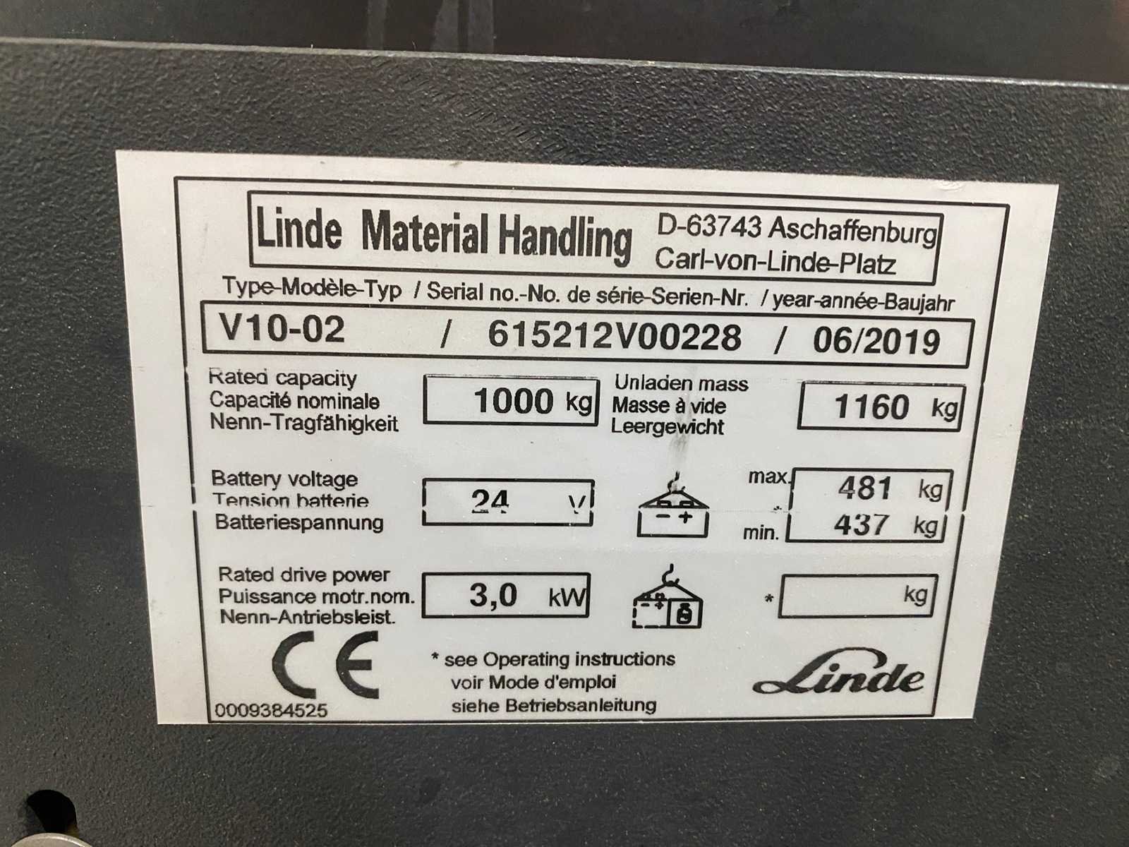 Merk: Linde Type: V10-02 Bouwjaar: 2019 Serienummer: 615212V00228 Hefvermogen: 1000kg Hefhoogte: 1070mm Lepellengte: 1150mm Accu lader: true Afgelezen urenstand: 4414 Eigen gewicht: 1641kg Totale afmeting L: 1700mm Totale afmeting Breedte: 800mm Totale afmeting Hoogte: 1620mm