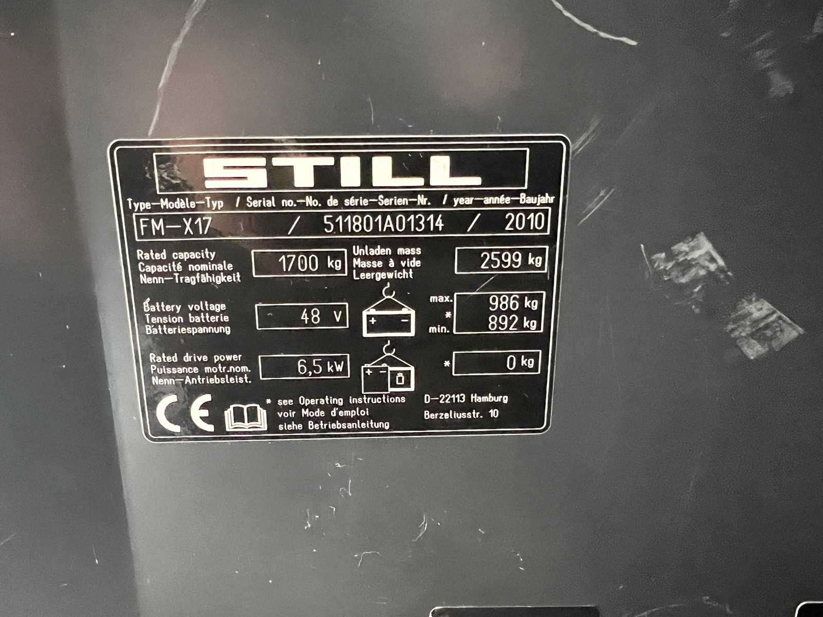 Merk: Still Type: FM-X17 Bouwjaar: 2010 Serienummer: 511801A01314 Brandstof: Elektrisch Mast: Triplex Soort band: Volrubber Aantal wielen: 3 Afgelezen urenstand: 6019 Accu lader: true Free-lift: true Side-shift: true Roterend vorkenbord: false Triple mast: true Eigen gewicht: 3500kg Hefvermogen: 1700kg Lepellengte: 1200mm Hefhoogte: 7700mm Totale afmeting L: 1700mm Totale afmeting Breedte: 1270mm Totale afmeting Hoogte: 3100mm Elektrisch: true Vol rubber banden: true
