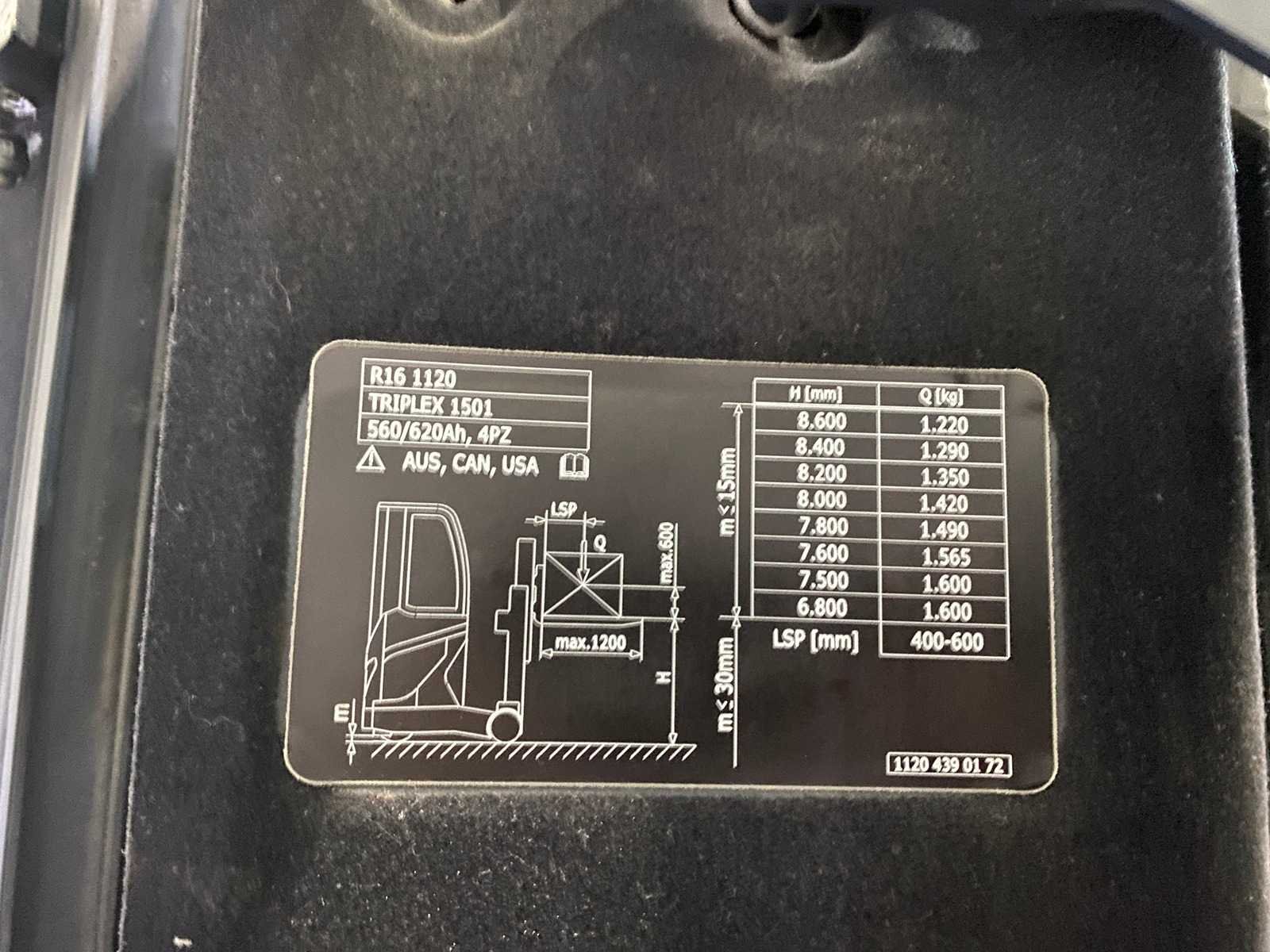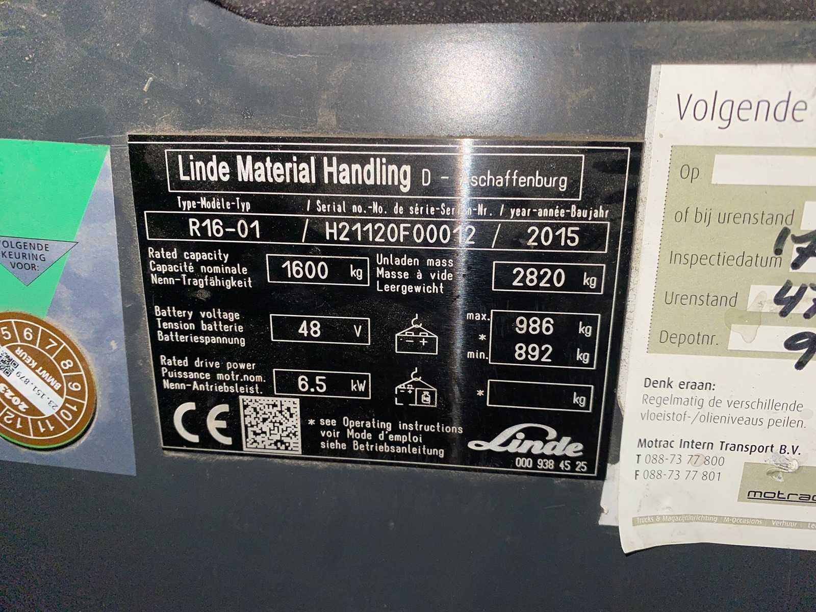 Batterij 2021 Merk: Linde Type: R16 Bouwjaar: 2015 Serienummer: H21120F00012 Brandstof: Elektrisch Mast: Triplex Soort band: Volrubber Aantal wielen: 3 Afgelezen urenstand: 7350 Accu lader: true Free-lift: true Side-shift: true Triple mast: true Eigen gewicht: 2940kg Hefvermogen: 1600kg Lepellengte: 1150mm Hefhoogte: 8600mm Totale afmeting L: 1900mm Totale afmeting Breedte: 1270mm Totale afmeting Hoogte: 3410mm Elektrisch: true Vol rubber banden: true