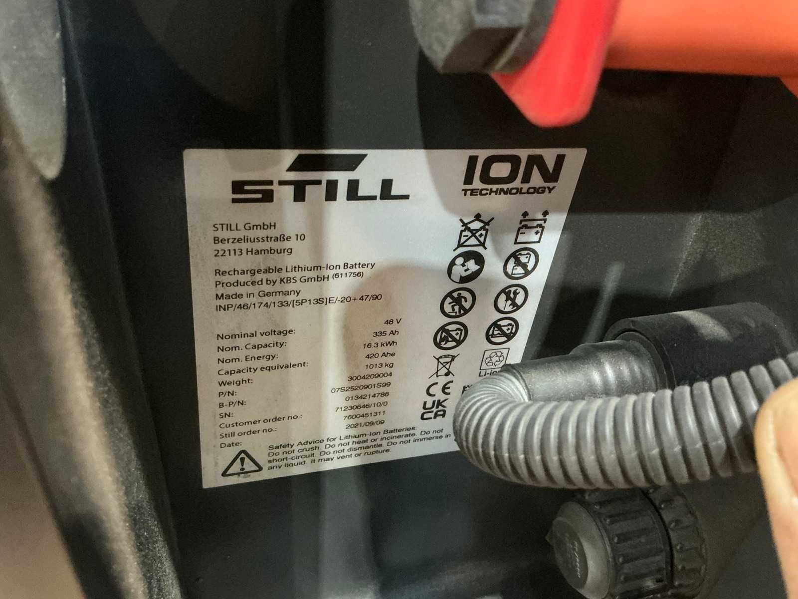ZONDER acculader Merk: Still Type: Li-Ion Bouwjaar: 2021 Serienummer: 7600451311 Eigen gewicht: 1020kg Totale afmeting L: 1200mm Totale afmeting Breedte: 800mm Totale afmeting Hoogte: 80mm