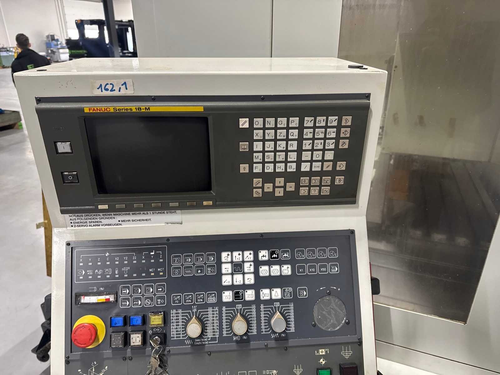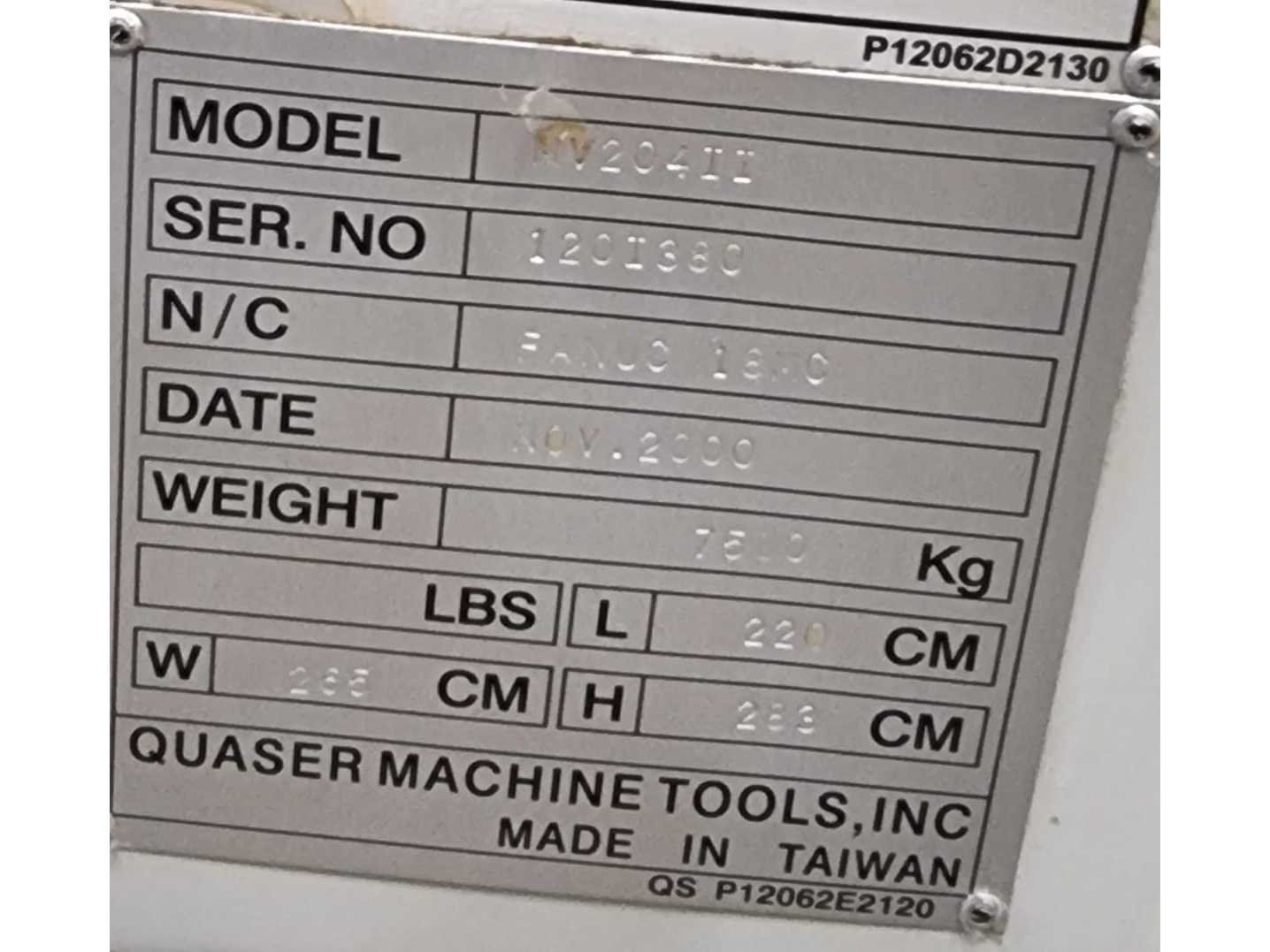 Machine reeds gereed voor transport en te beoordelen op kijkdag Merk: Quaser Type: MV204II Bouwjaar: 2000 Serienummer: 1201380 Verplaatsing x-as: 1020mm Verplaatsing y-as: 600mm Verplaatsing z-as: 560mm Snelheid tot n =: 10000rpm CNC-besturing, merk, type: Fanuc 18C Spanentransporteur: true Koelmiddelpomp: true Werkstuk gewicht max.: 1000kg T-gleuf opspantafelafmeting B: 1200mm T-gleuf opspantafelafmeting L: 635mm -assig: 3 Aansluiting: 400V Machinegewicht: 7000kg Afmeting l: 3700mm Afmeting b: 2300mm Afmeting h: 2550mm