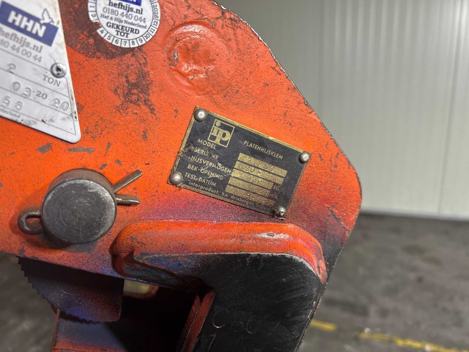 Platenklem met evenaar 0-40mm plaatdikte 2000kg hefvermogen Merk: IP Hijsvermogen: 2000kg Afmeting l: 500mm Afmeting b: 600mm Eigen gewicht: 50kg