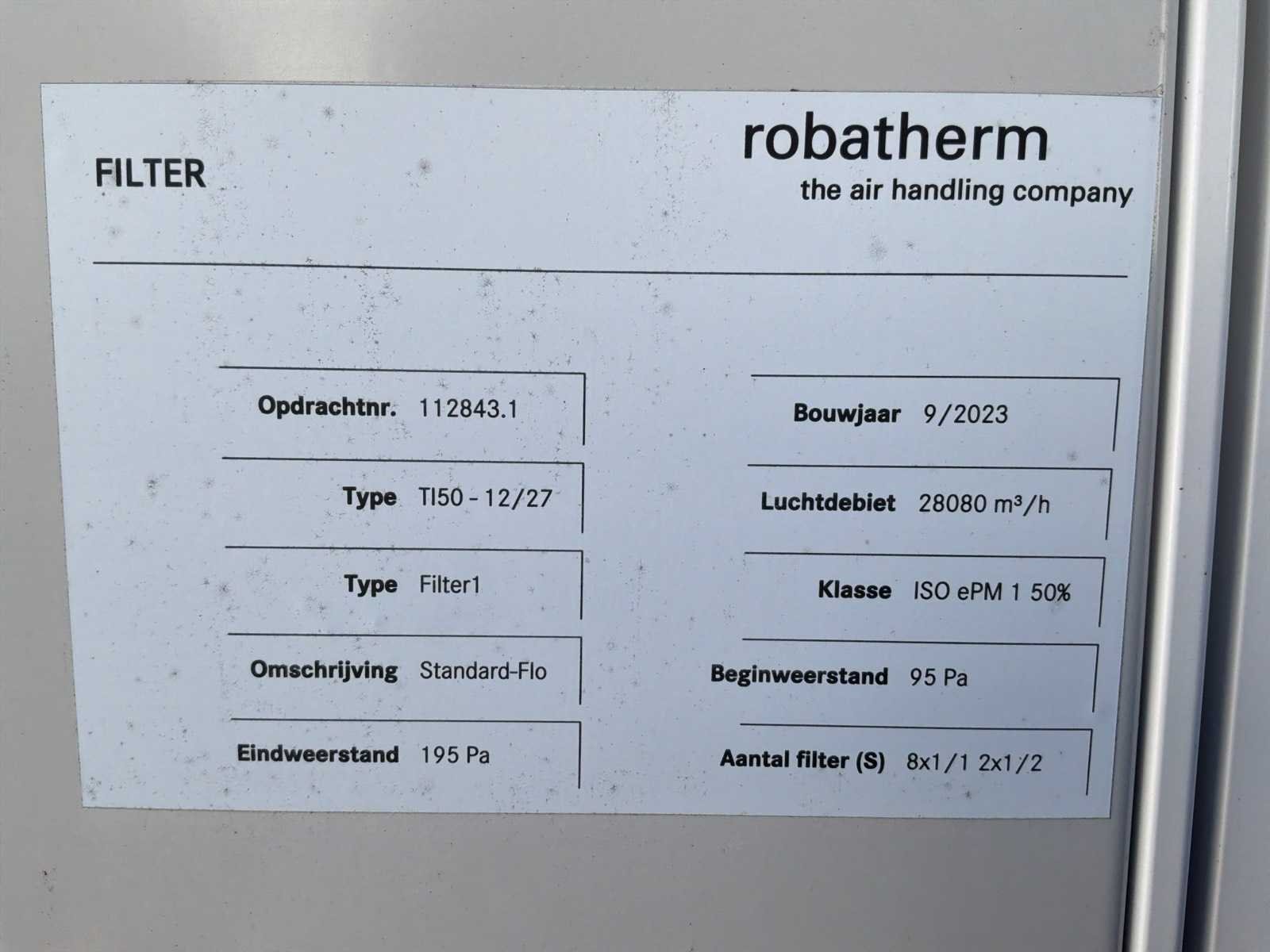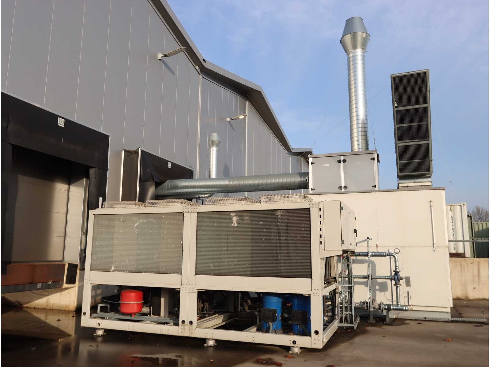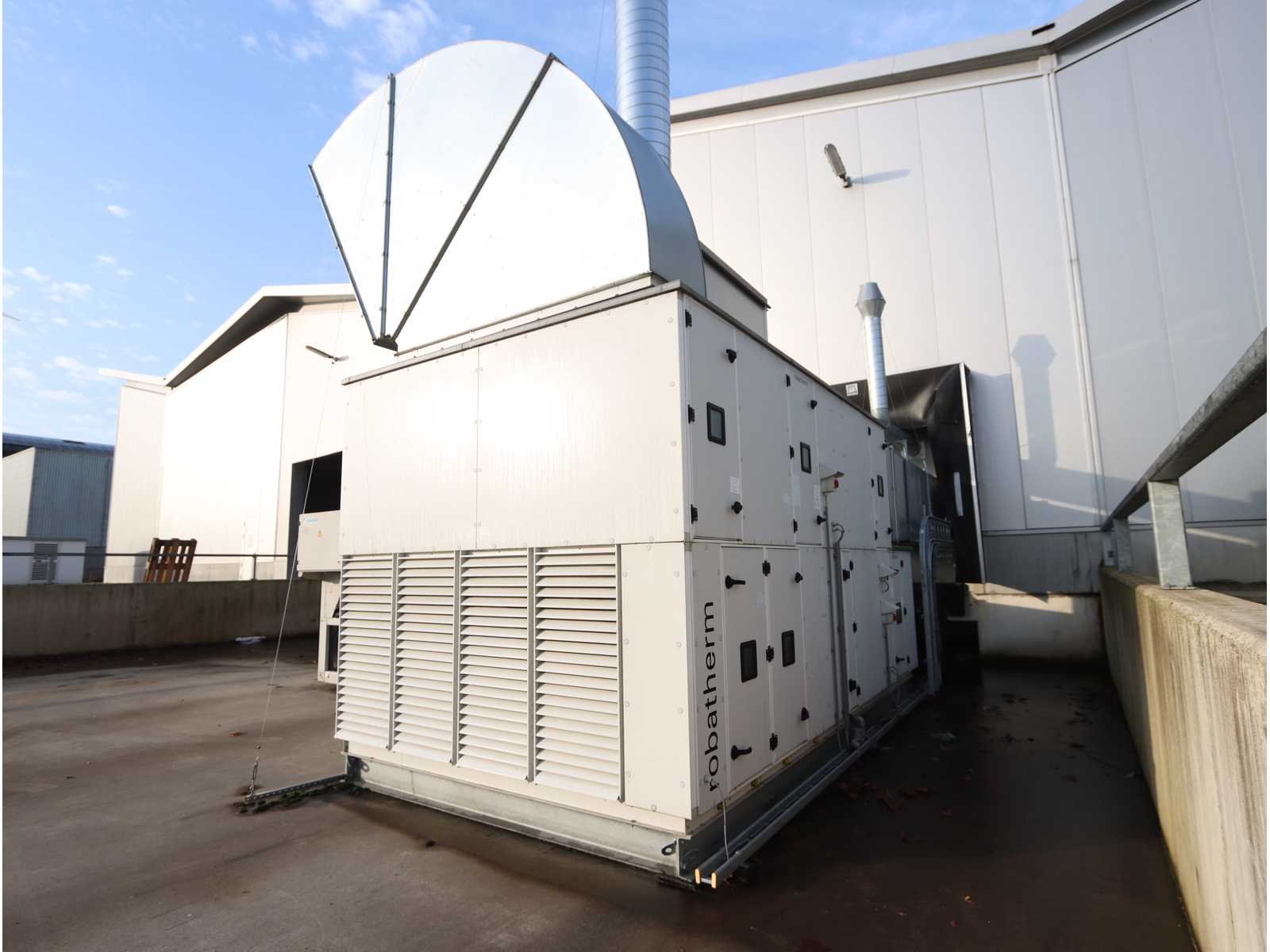 Capaciteit 28.080 m3/u, bestaande uit: 4x demperunit, 2x filterunit, 1x luchtkoelerunit, grootte ongeveer 6300x3000mm, 1x "Akvaterm" opslagtank, 1x "Daikin" koeler type EWYQ250DAYNN-H- (2010) koelmiddel type R410A, 2x 43 kg, afmetingen ongeveer 4850x2020x2450mm, met luchtkanalen door de hele fabriek (op instructie van Troostwijk) Merk: Robatherm Type: TI-12/27 Bouwjaar: 2023