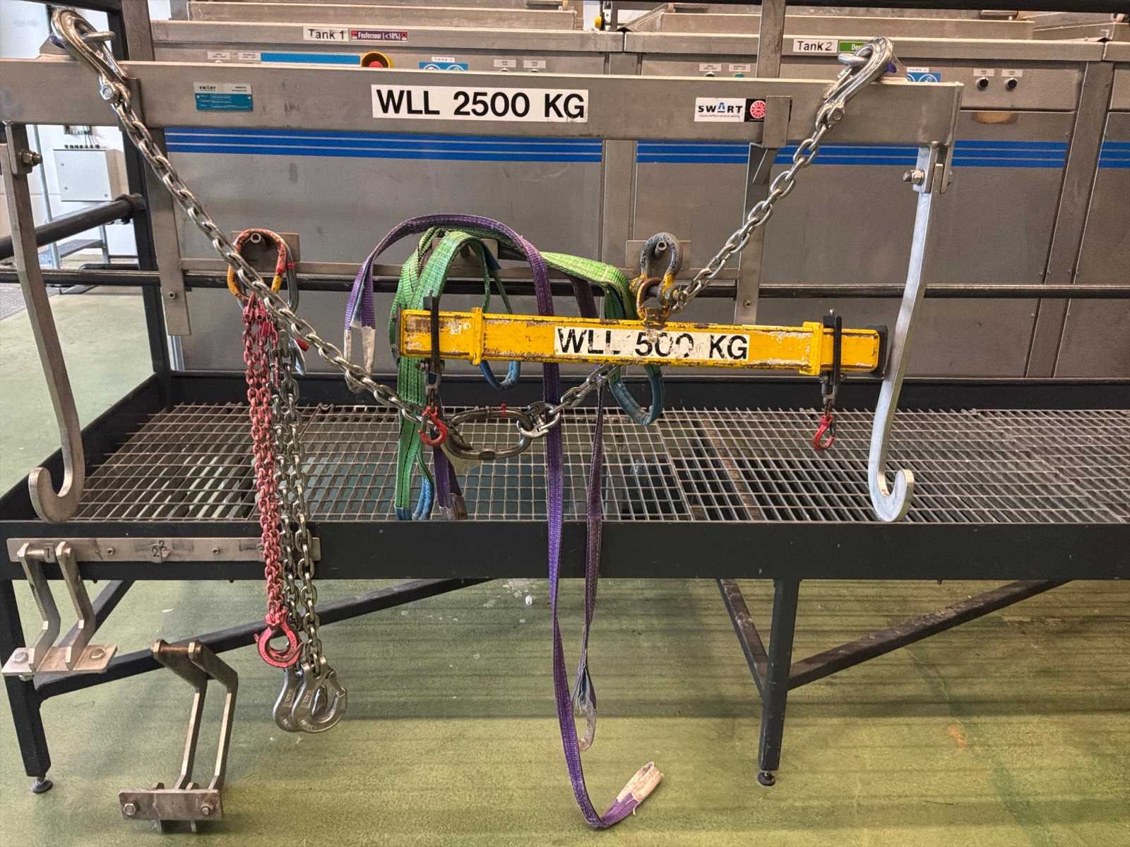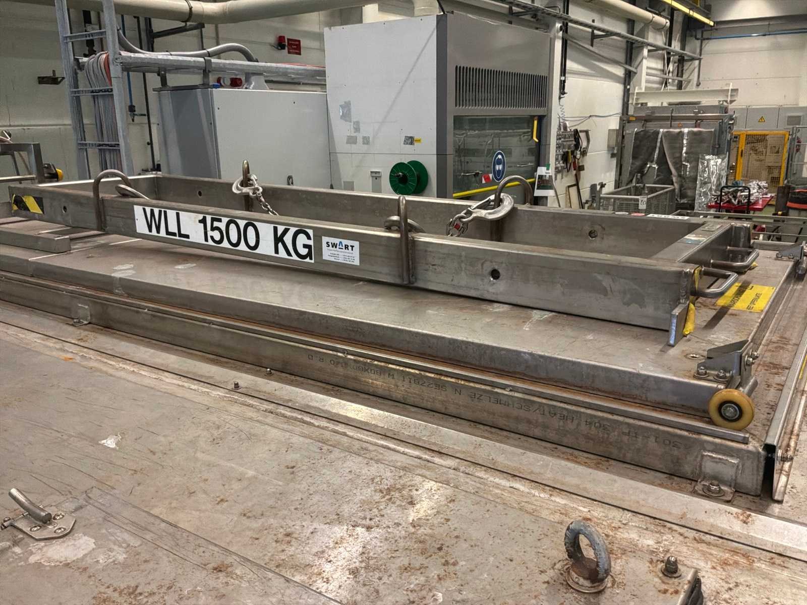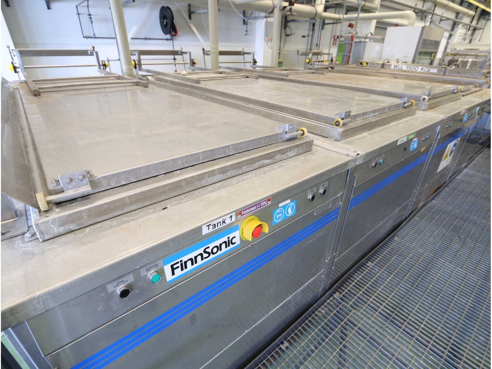 "Finnsonic" 5-voudig ultrasoon reinigingsbad, bestaande uit onder andere: 4 tanks die de volgende chemicaliën gebruikten, tank 1: fosforzuur ( 10%), tank 2: demi-water, tank 3: natriumhydroxide (5%), tank 4: natriumhydroxide (5%), tank 5 is een droogkamer met diverse hijsapparatuur, elk met pneumatisch bediend deksel, 2x reinigingsmand, 1x afzuigkap, diverse reserveonderdelen, 1x 4-deurs schakelkast, loopplatform met trap, gebruikte vloeroppervlakte ongeveer 7500x6500 mm Merk: FinnSonic Type: V31 W-range Bouwjaar: 2010 Aansluiting: 400V