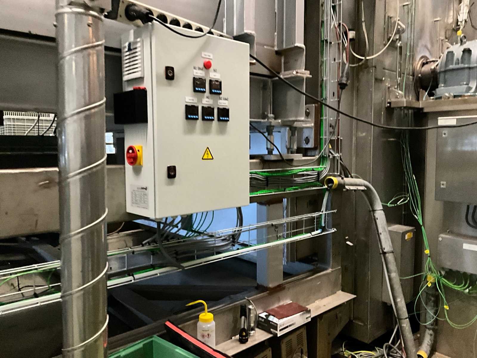 Uitgerust met een "Ebner" voorverwarmingsmodule, depositiekamer, "HTS" gasinjectiesysteem, emissiebeheersingsunit met "Montair" scrubber en 3-zone koelunit, oven gedeeltelijk gebouwd van roestvrij staal, 3x "Enkele" verwarmings-/koelunit, STO 1-24-60-D3/L, 69,6 kilowatt, (2008) 31,9 kVA, spoel-/pompunit, 17-deurs elektrische schakelkast, chemische kasten, inclusief verwarmingselement en hefbalk, Gebruikte vloeroppervlakte ongeveer 10.000x5000mm Type: Flotation oven Bouwjaar: 2008