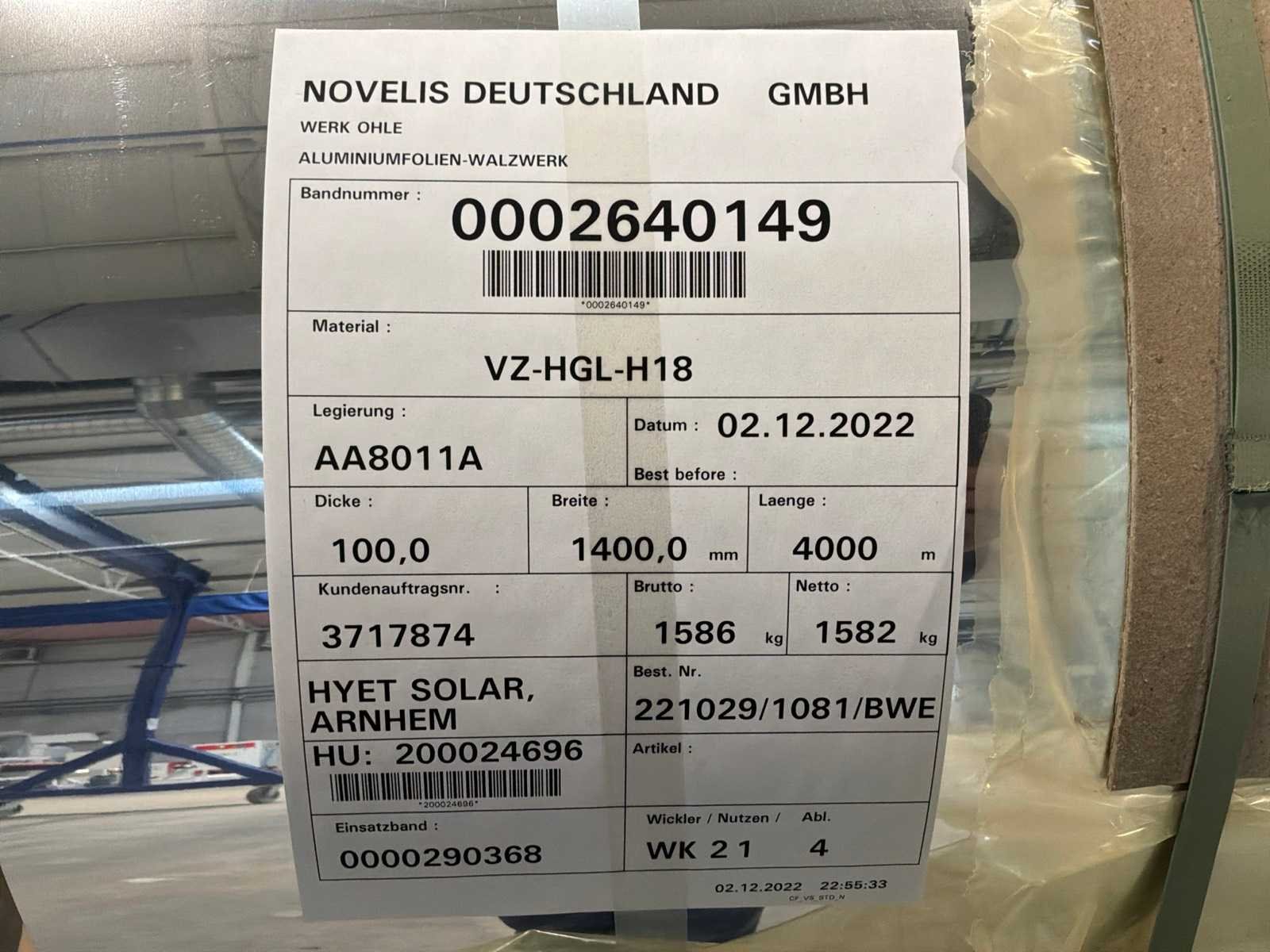 Dikte 100mu Merk: Novelis Type: AA8011A Afmeting b: 1400mm