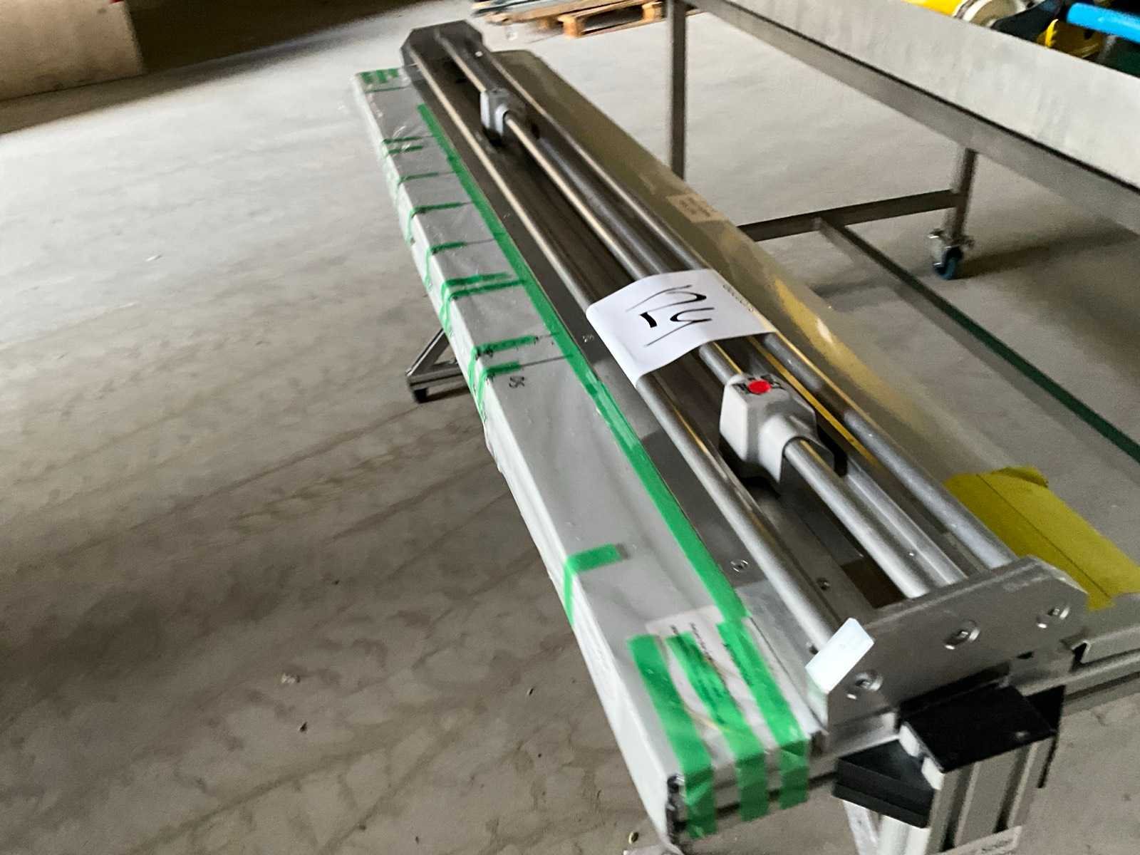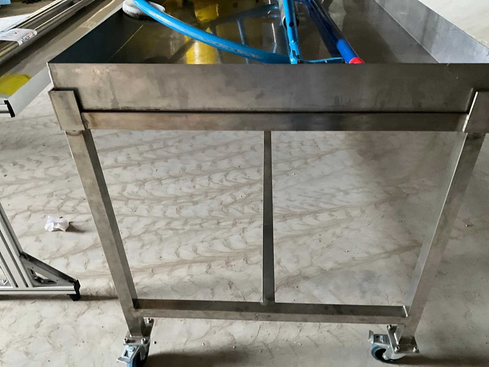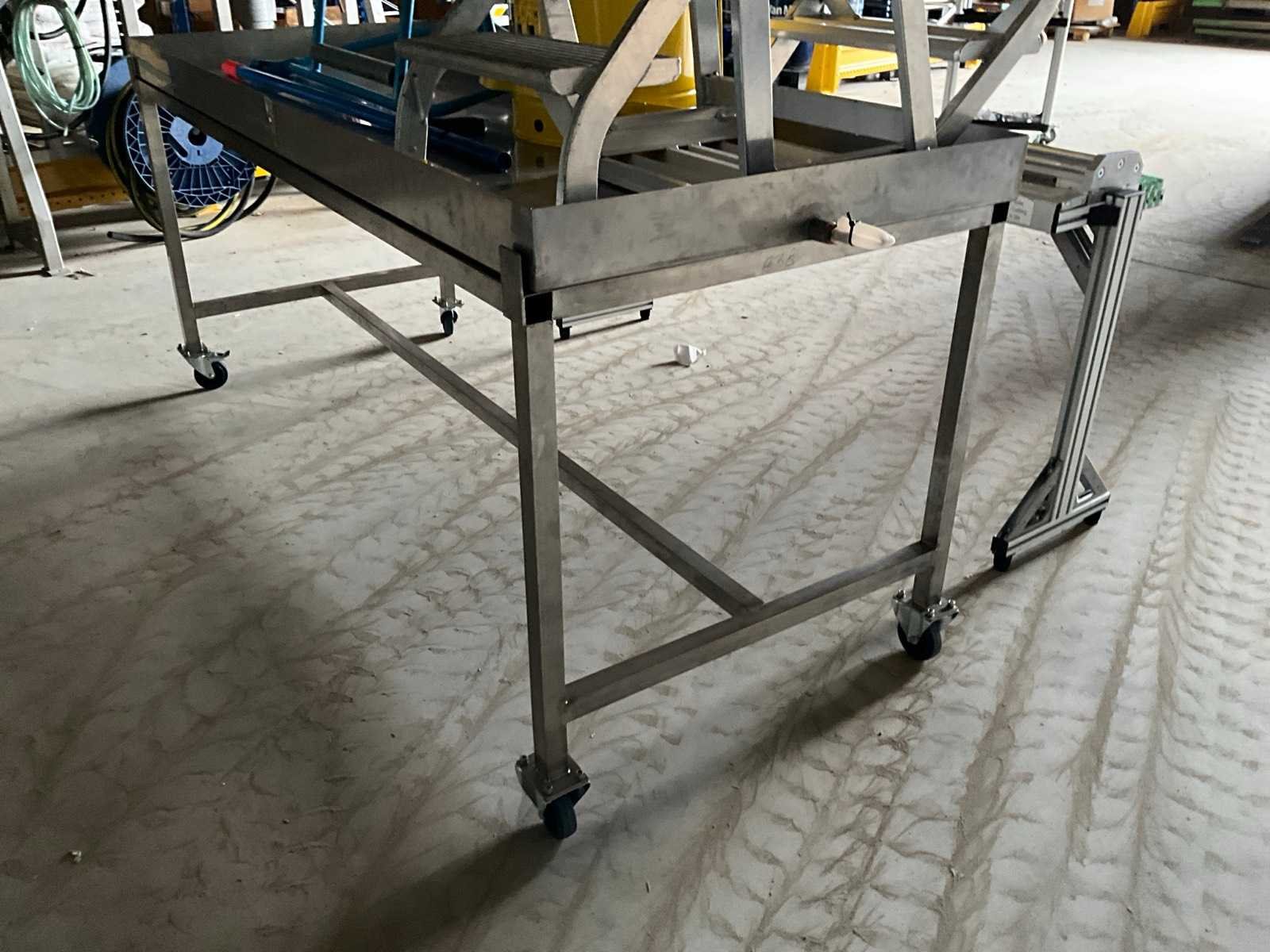 Proefsnijtafel, werkbreedte 1750 millimeter, trommeltransporthandwagen, roestvrijstalen mobiele driptafel, tafelafmetingen (lengte x breedte x hoogte) 2240 x 900 x 1050 millimeter, 2x trappen.