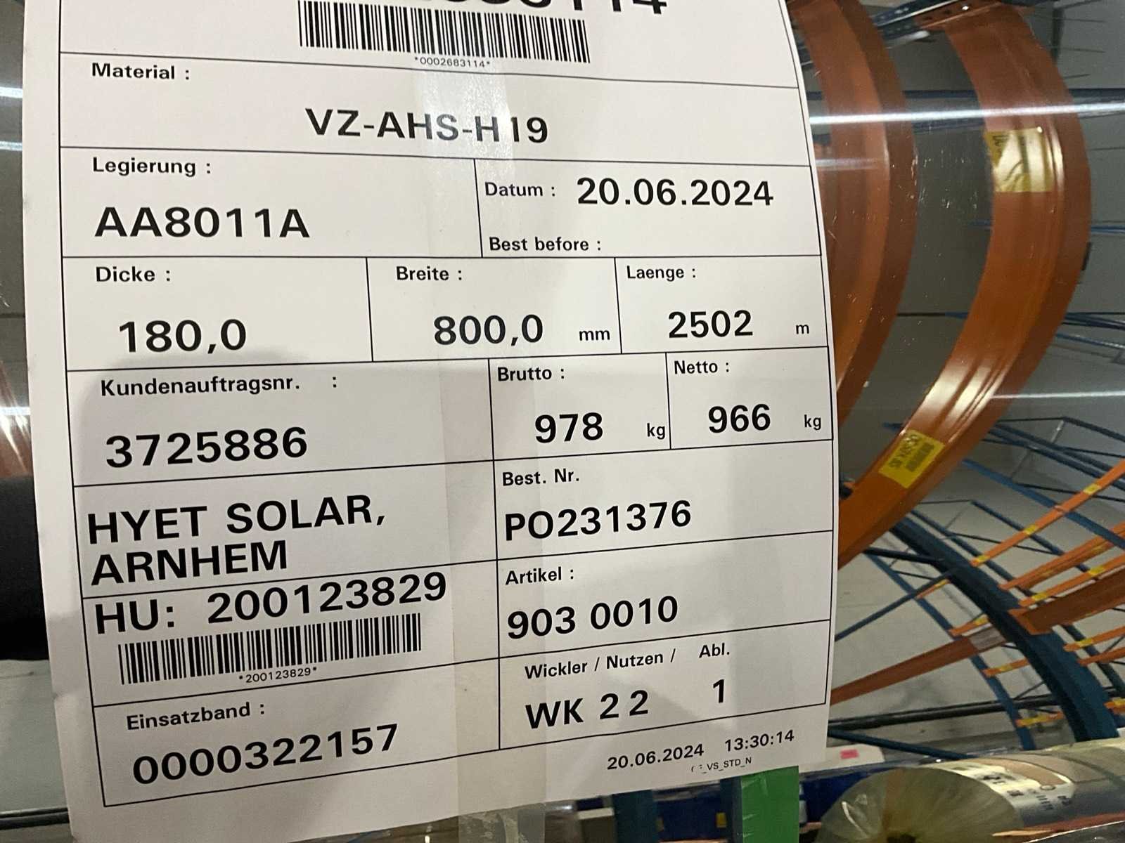 Aluminiumfoliestrook, folie dikte 0,18 millimeter, stripbreedte 800 millimeter, lengte 2502 meter, ongeveer 970 kilogram per rol Merk: Novelis Type: AA8011A