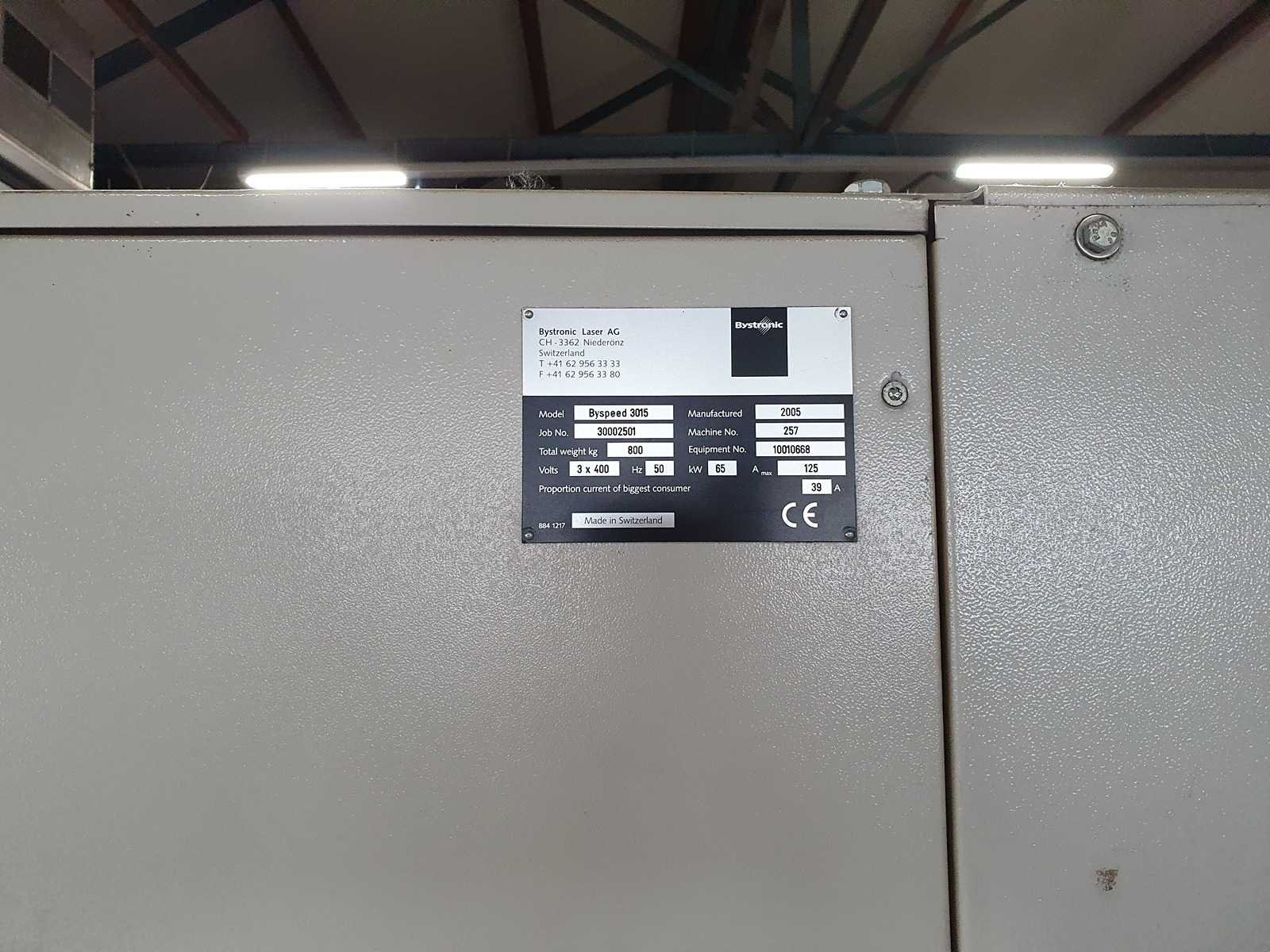 Lasersnijmachine staat in opslag. Reeds gedemonteerd, additionele kosten zijn de demontagekosten, opslagkosten en verladingskosten Merk: Bystronic Type: BySpeed 3015 + ByTrans Bouwjaar: 2005 Serienummer: 257 Laservermogen: 4,4 (5200 ARC)kW Werkbereik x: 3000mm Werkbereik y: 1500mm Werkbereik z: 750mm Tafel afmeting l: 3000mm Tafel afmeting b: 1500mm Motorvermogen (kW): 65kW Aansluitwaarde: 125A Aansluiting: 380V Machinegewicht: 18000kg Afmeting l: 5500mm Afmeting b: 11500mm Afmeting h: 2500mm Leveringsvoorwaarden: Geladen op vrachtwagen
